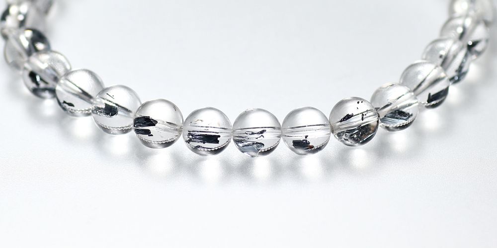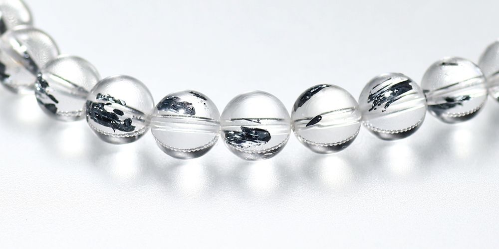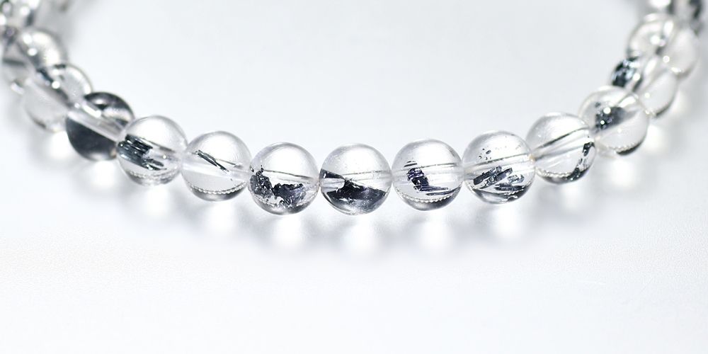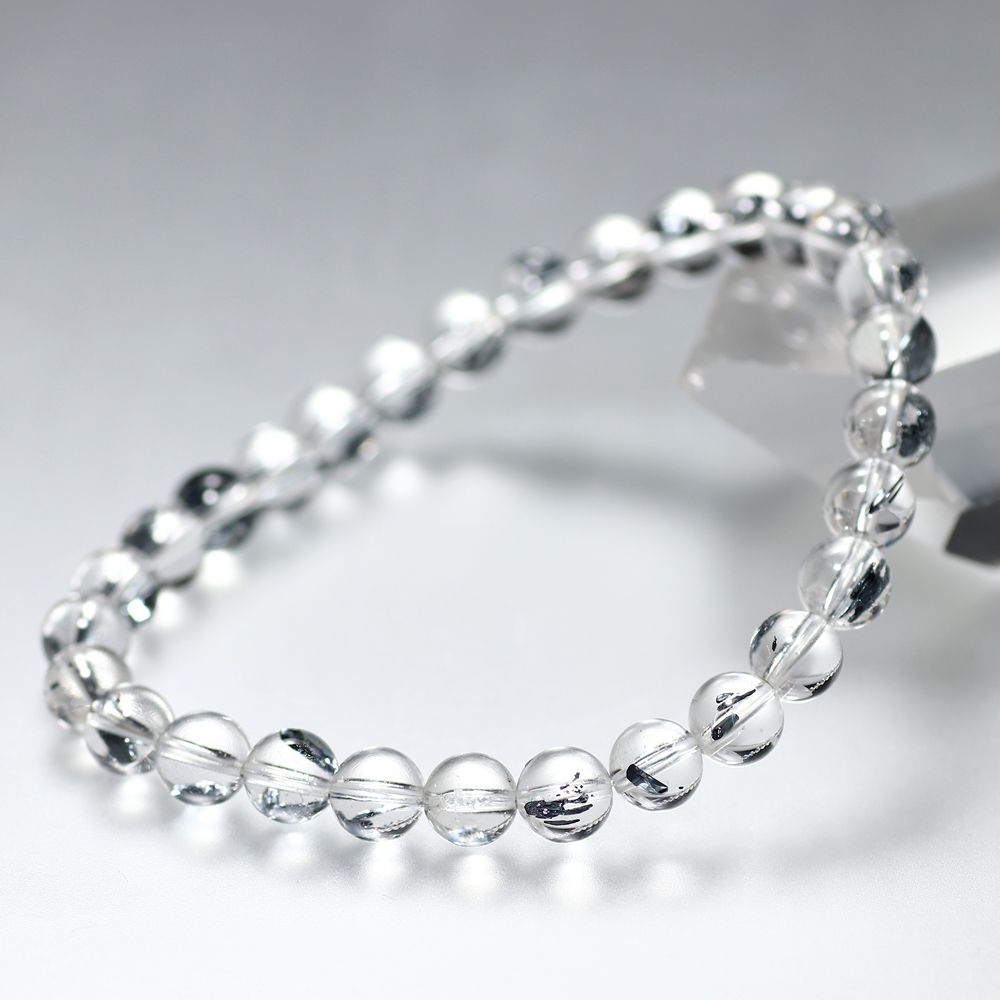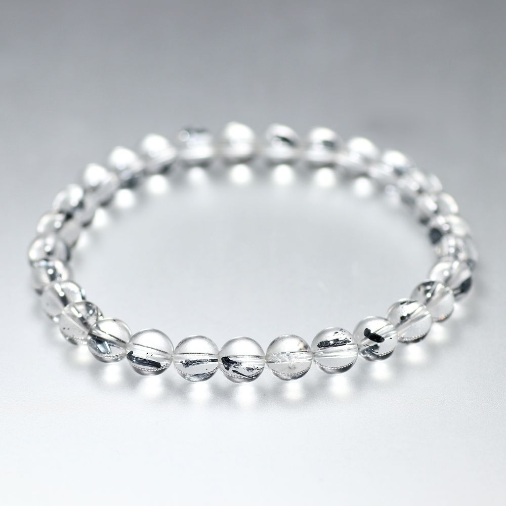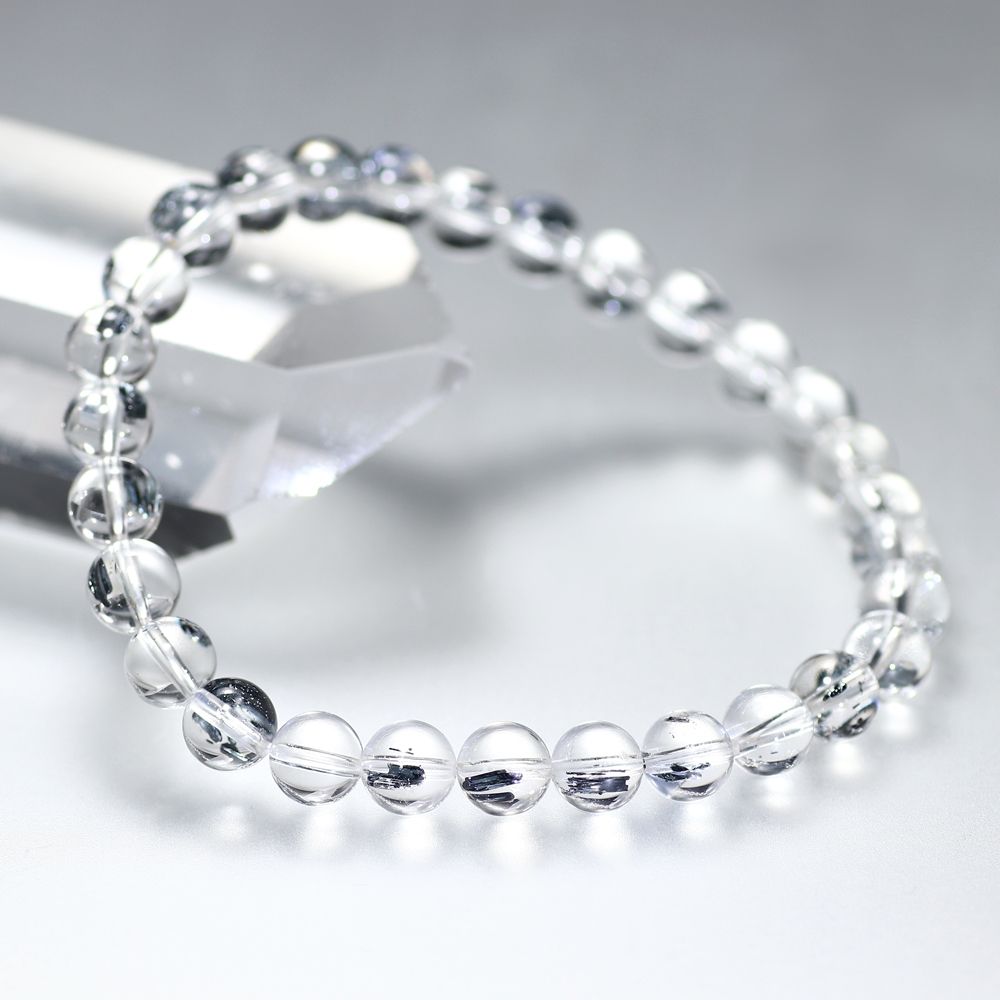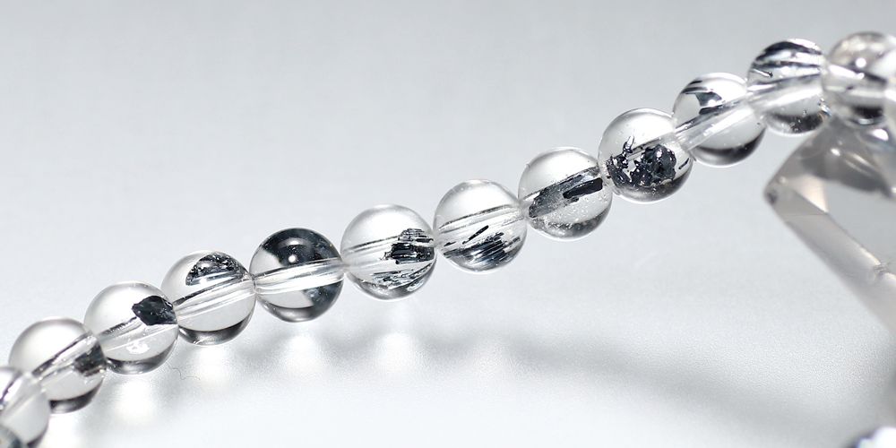 透明度に優れた水晶に、レアメタルのスティブナイト(輝安鉱)が内包された大変希少なスティブナイトインクォーツブレスレットでございます。