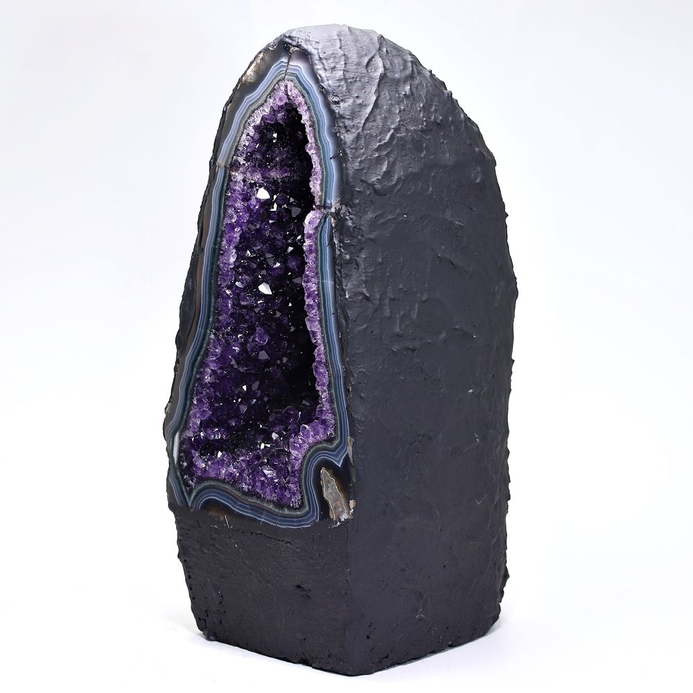 内部の深く輝くアメジスト結晶が、見る角度によって様々な表情を見せ、洗練されたインテリアに格調高いアクセントを加えます。