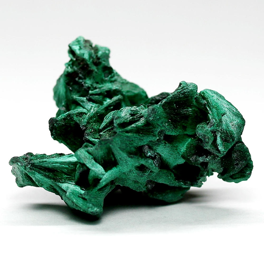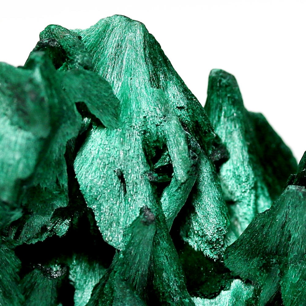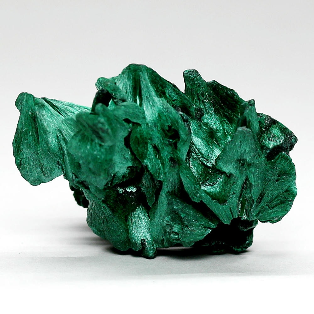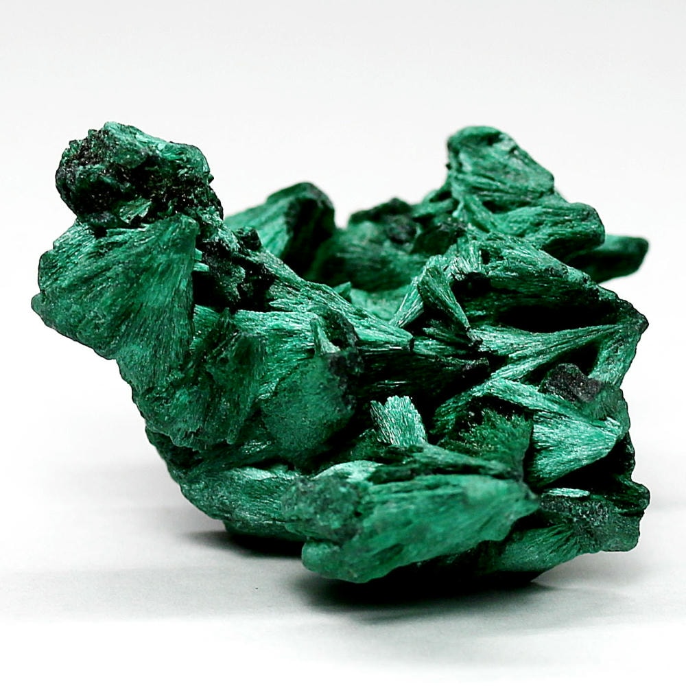 表面に現れた微細な繊維状の結晶が、まるで最高級のベルベット生地のように光を優しく反射し、「ビロード(ベルベット)マラカイト」という名の通り、しっとりとした深い光沢を放ちます。