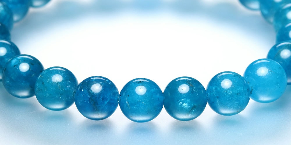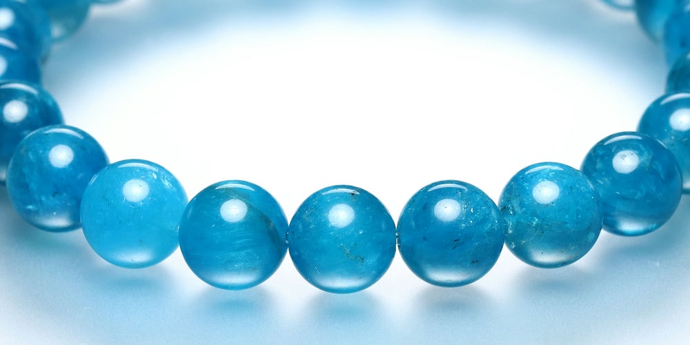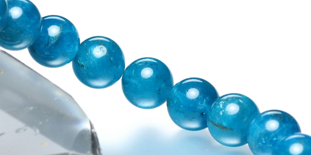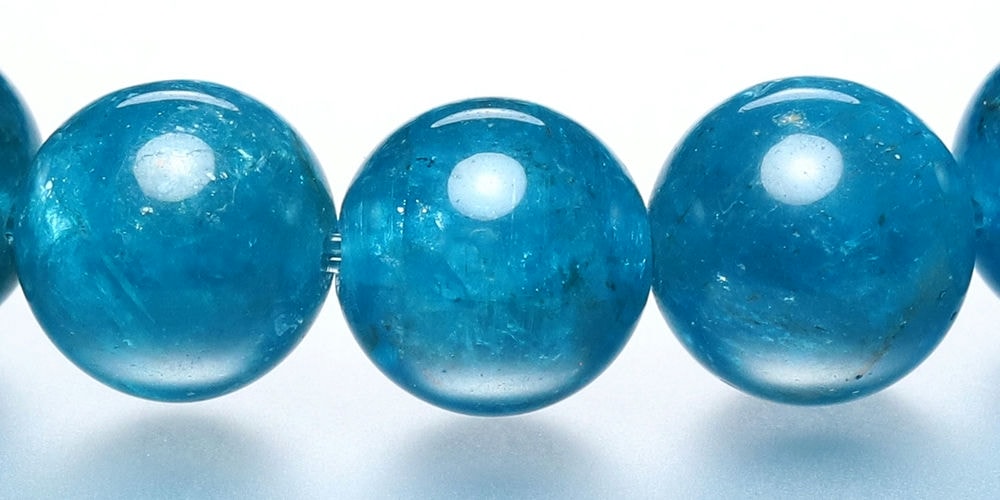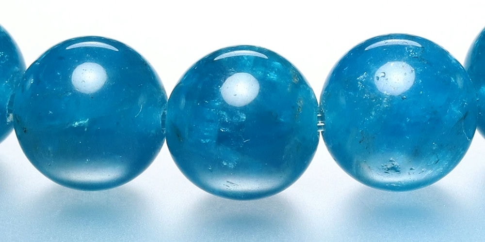 ご覧のお品は、濃い発色ながら透け感もある蛍光ブルーのマダガスカル産高品質アパタイトブレスレットでございます。