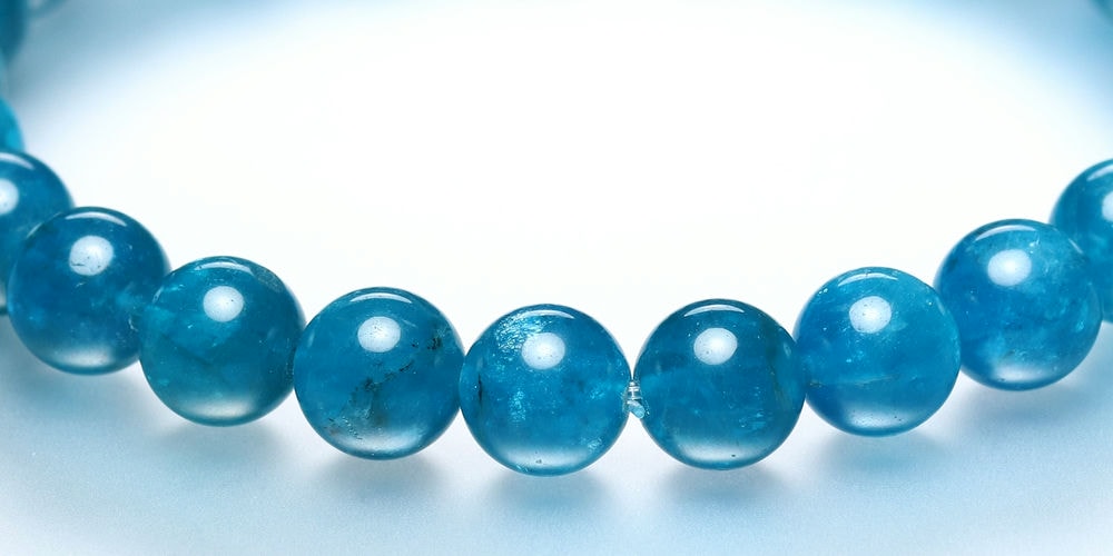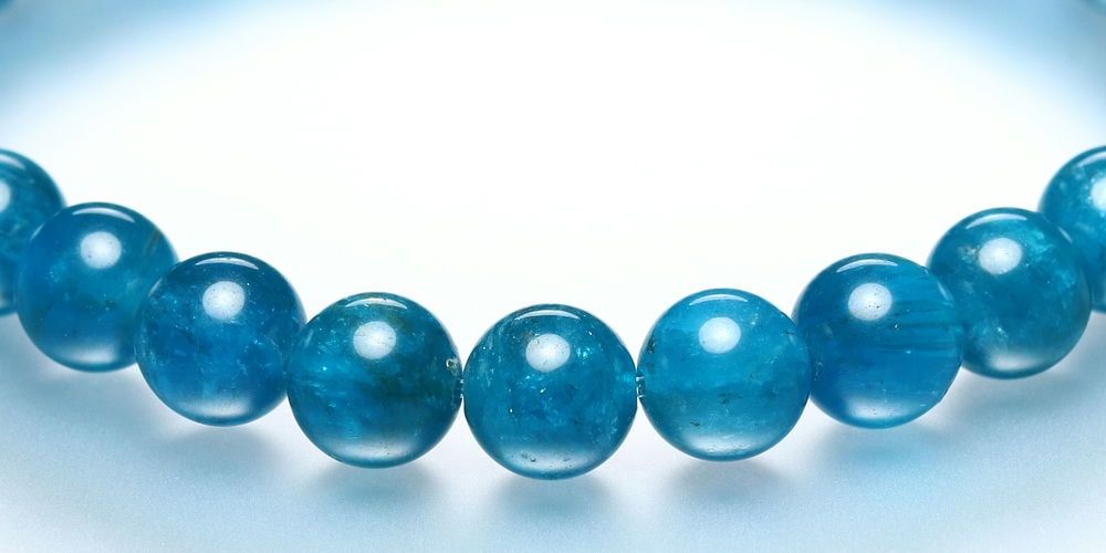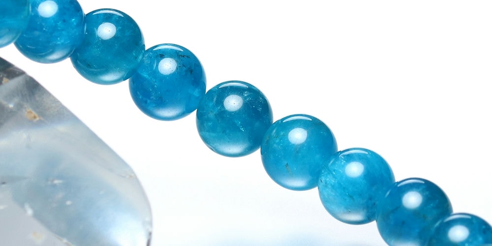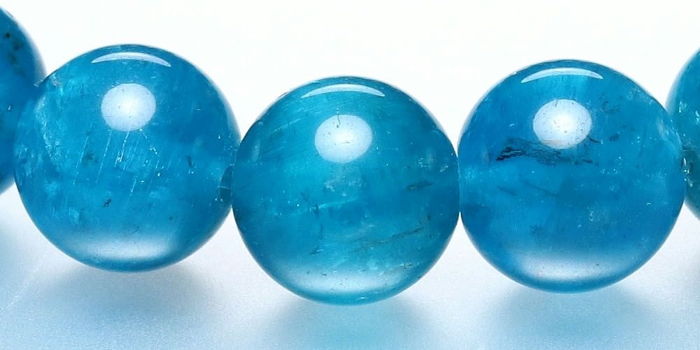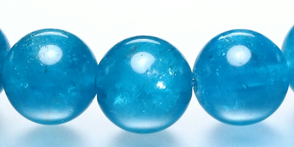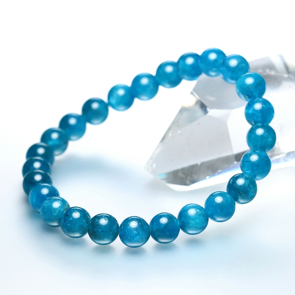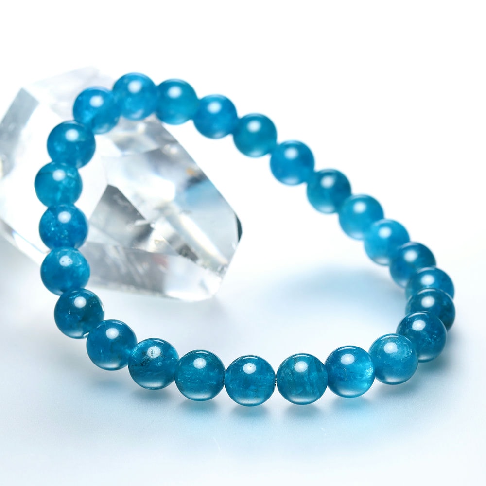 ご覧のお品は、濃い発色ながら透け感もある蛍光ブルーのマダガスカル産高品質アパタイトブレスレットでございます。