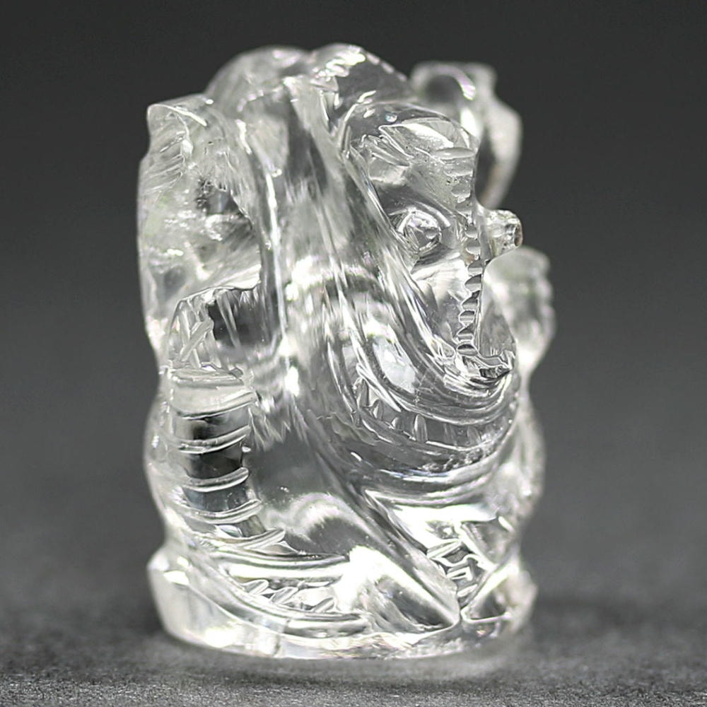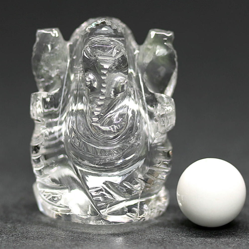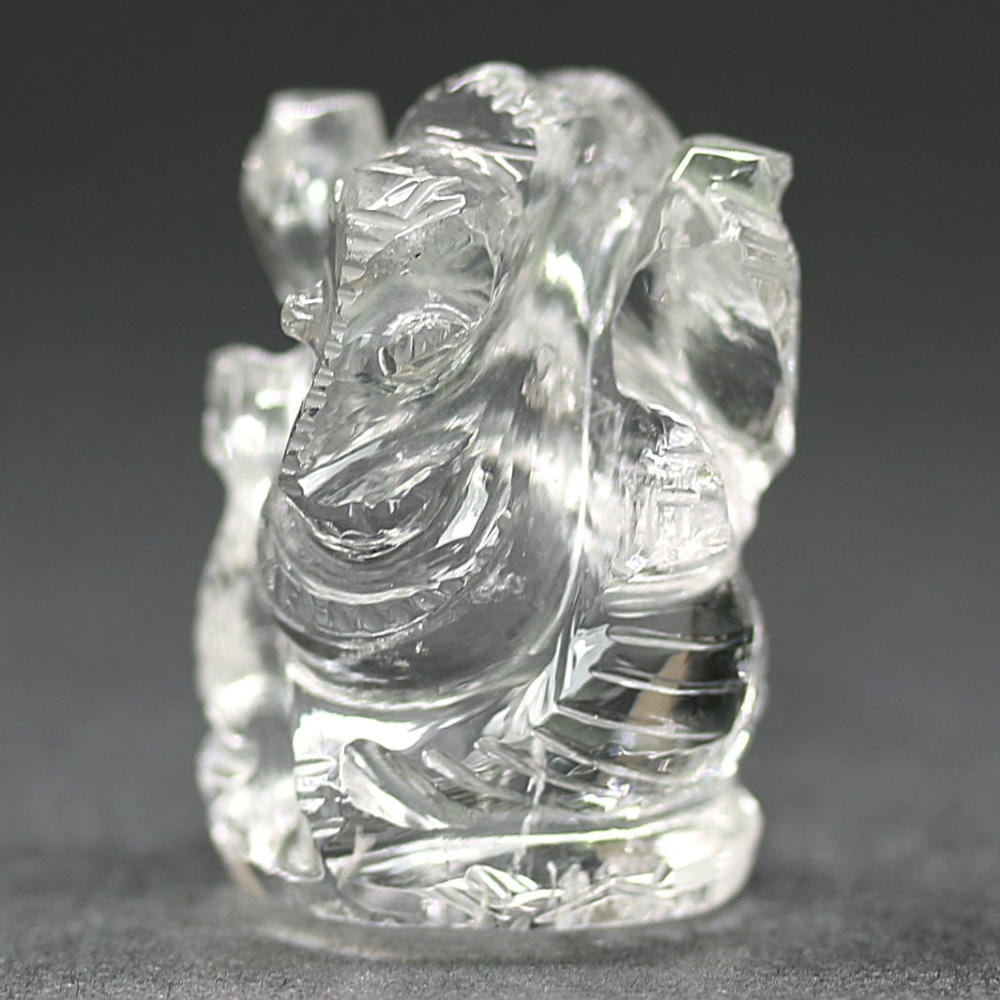 手に隠れる程よい大きさの水晶ガネーシャ像は、すべてインド職人による手彫りで作られた “1点物” です。一つ一つの表情が異なり、神々しさだけでなく、よくみるとどこか愛嬌もあります。