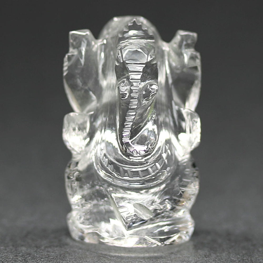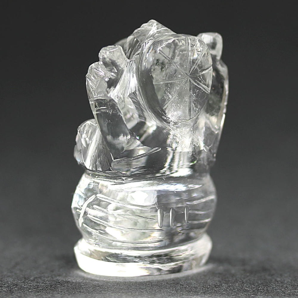 手に隠れる程よい大きさの水晶ガネーシャ像は、すべてインド職人による手彫りで作られた “1点物” です。一つ一つの表情が異なり、神々しさだけでなく、よくみるとどこか愛嬌もあります。
