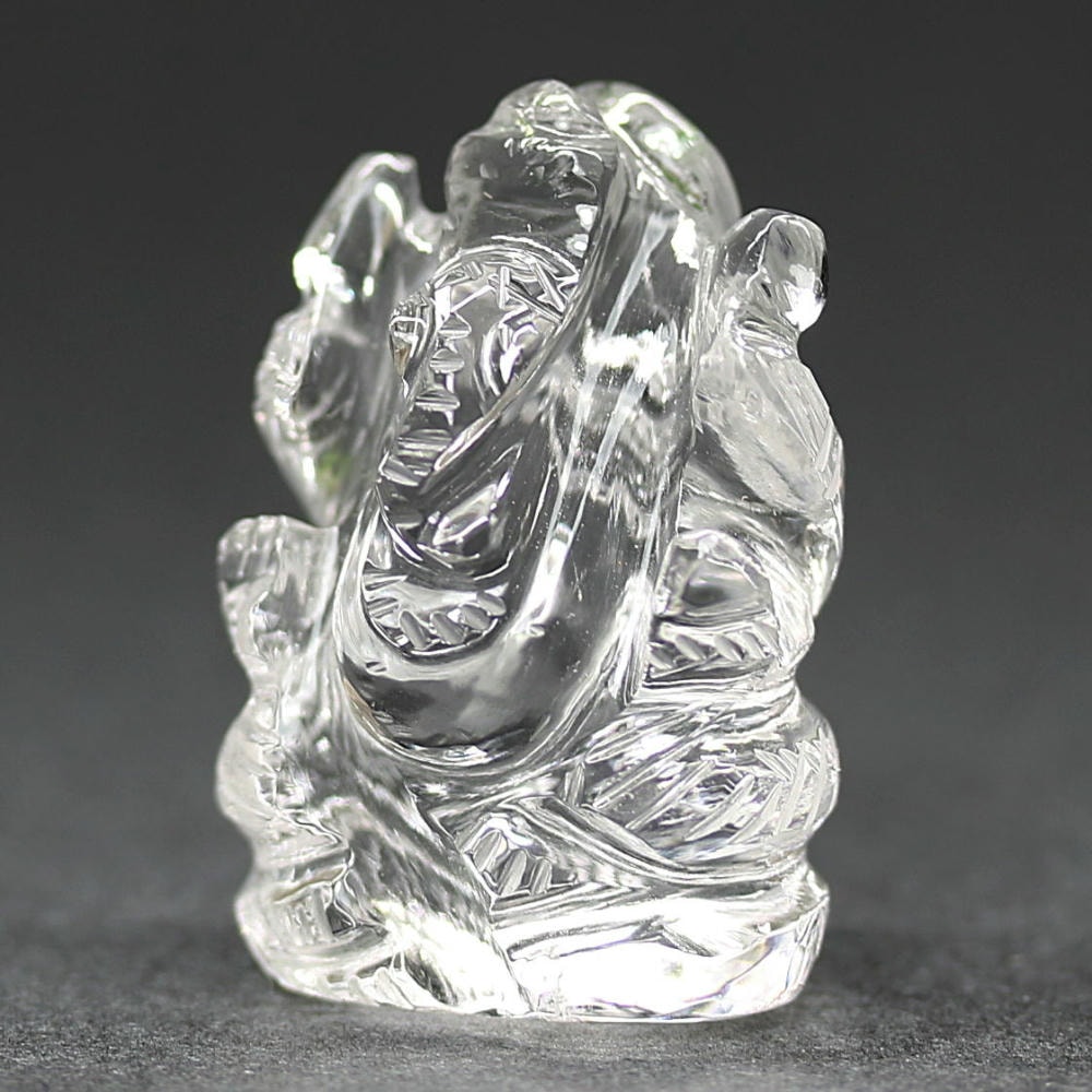 手に隠れる程よい大きさの水晶ガネーシャ像は、すべてインド職人による手彫りで作られた “1点物” です。一つ一つの表情が異なり、神々しさだけでなく、よくみるとどこか愛嬌もあります。