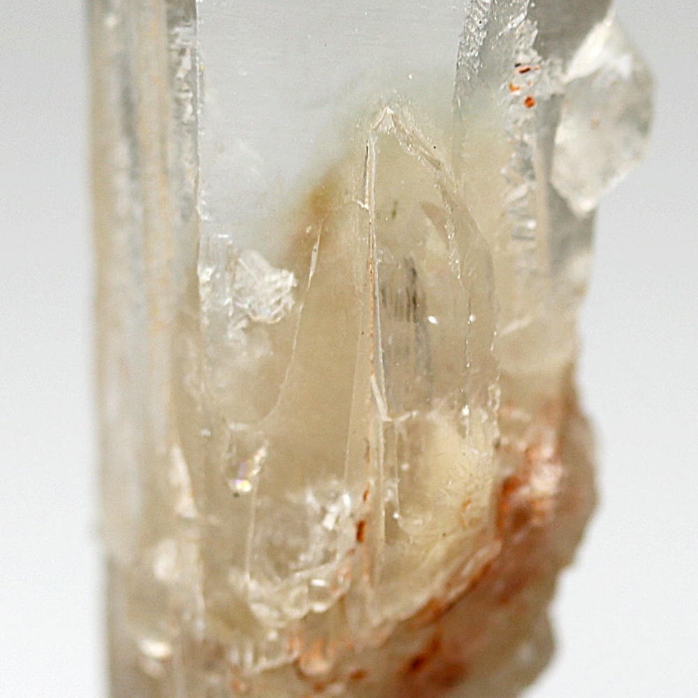 ご覧のホワイトファントムクォーツは、主にトレモライト(透閃石)および鉄分の影響を受けたオレンジアンフィボール(角閃石)と思われ、よくご覧になると白い鉱物が針状あるいは繊維状をしているのがご覧いただけます。
