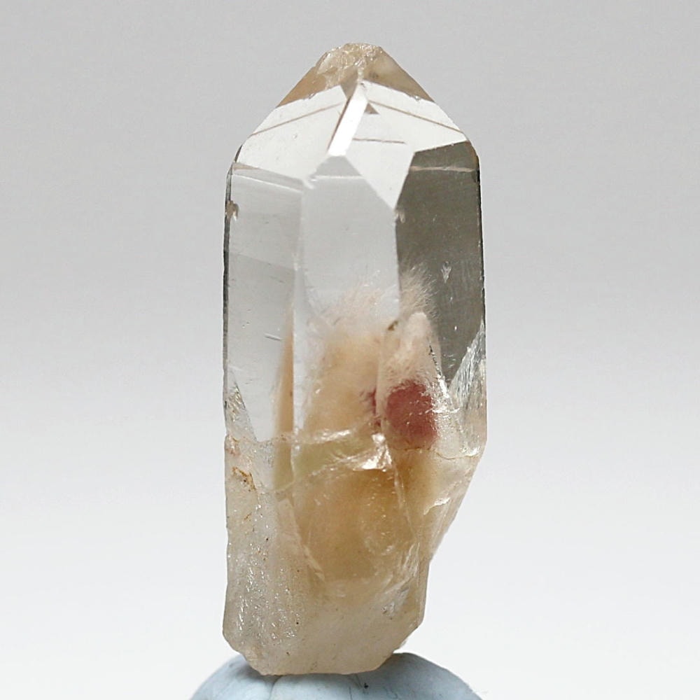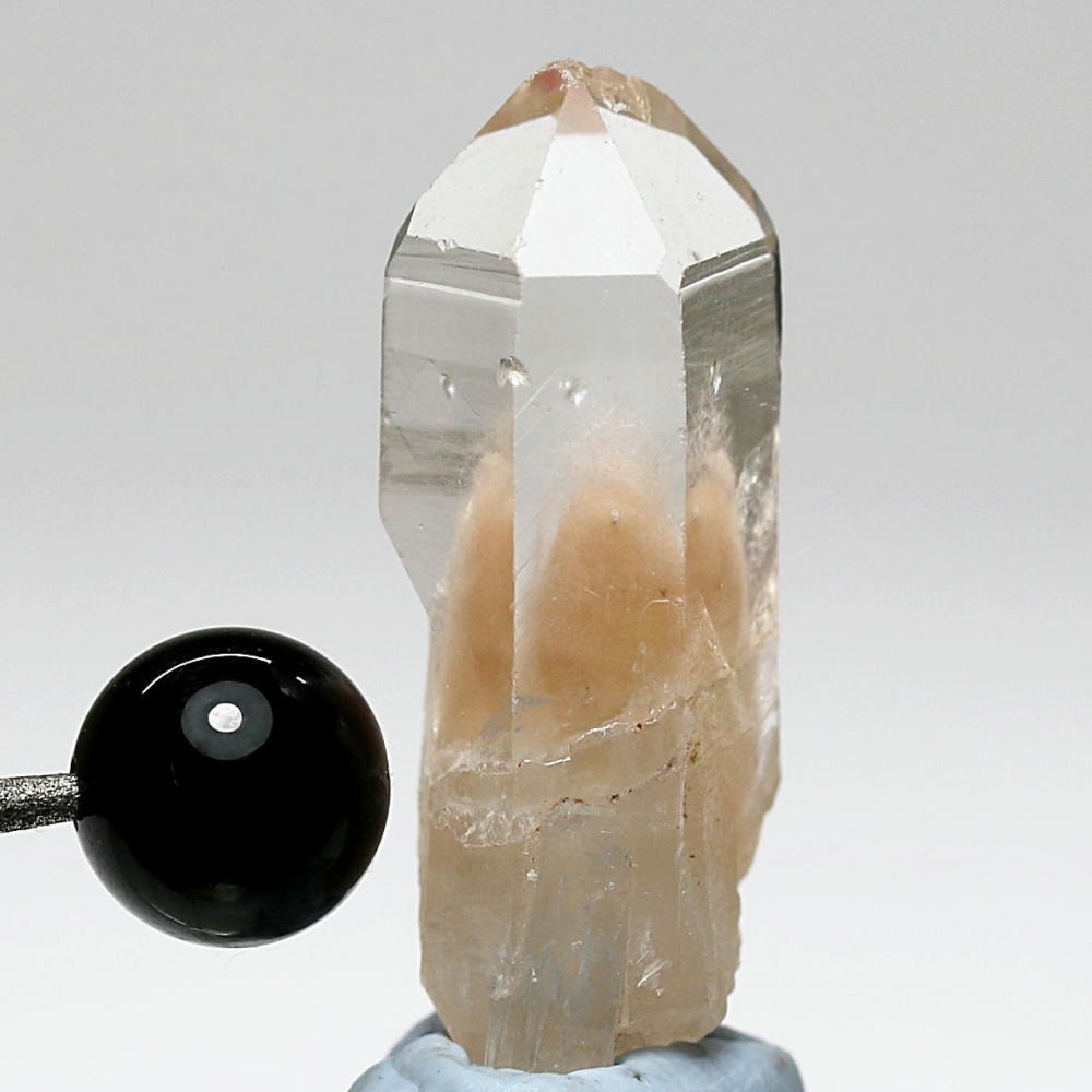 ご覧のホワイトファントムクォーツは、主にトレモライト(透閃石)および鉄分の影響を受けたオレンジアンフィボール(角閃石)と思われ、よくご覧になると白い鉱物が針状あるいは繊維状をしているのがご覧いただけます。
