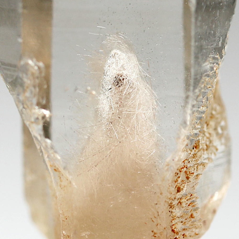 ご覧のホワイトファントムクォーツは、主にトレモライト(透閃石)および鉄分の影響を受けたオレンジアンフィボール(角閃石)と思われ、よくご覧になると白い鉱物が針状あるいは繊維状をしているのがご覧いただけます。
