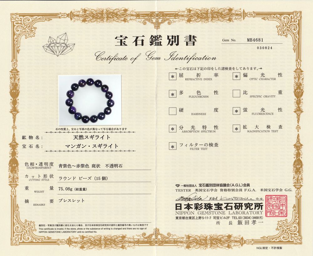 [希少・高品質++]パープルスギライトブレスレット(約15mm玉・鑑別書付属)¥1,130,000クイックガイド送料