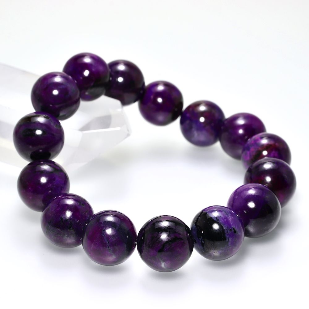 ご覧のお品は、照り艶美しく、発色良い15mm大玉のパープルスギライトで組み上げた、非常に希少なブレスレットに仕上がっております。