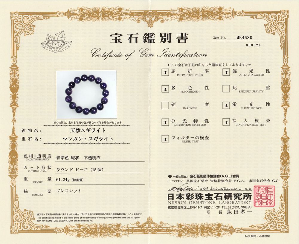 [希少・高品質++]パープルスギライトブレスレット(約14.5mm大玉・鑑別書付属)