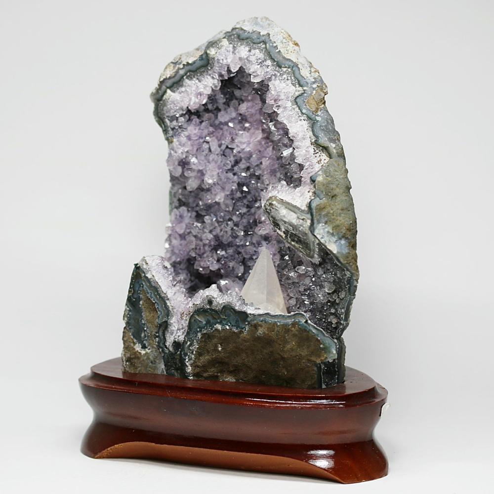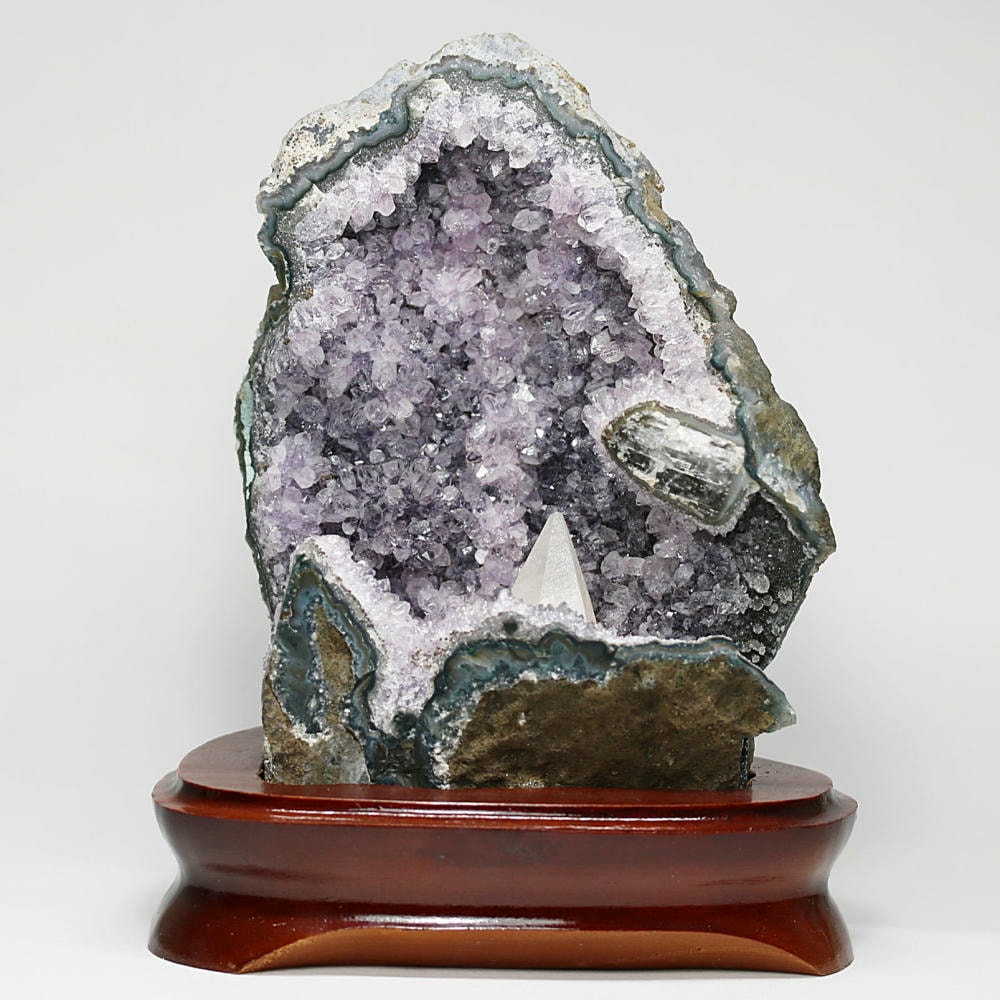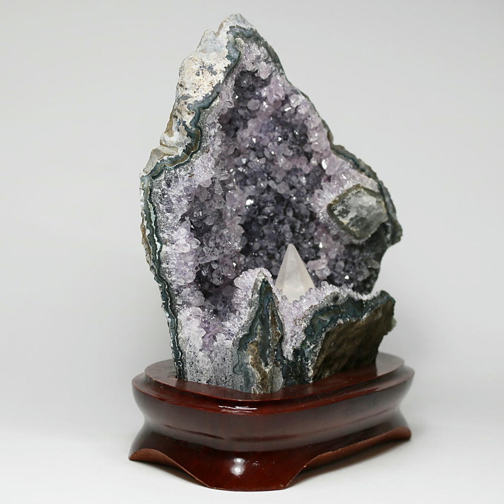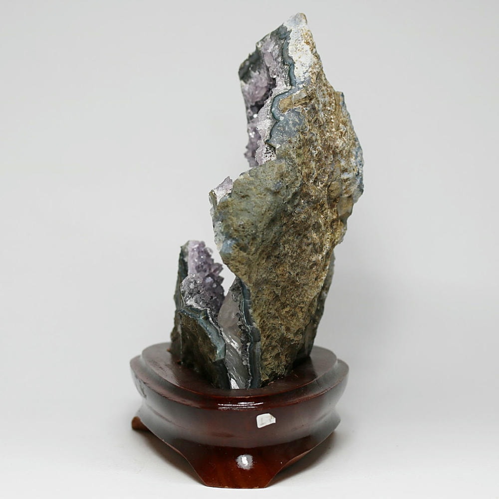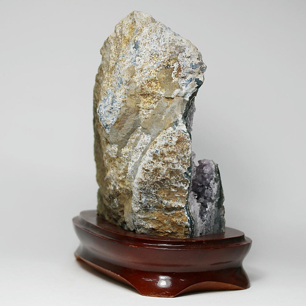 記念特価★ブラジル産カルサイト共生フラワーアメジスト原石クラスター(専用木製台座付属)