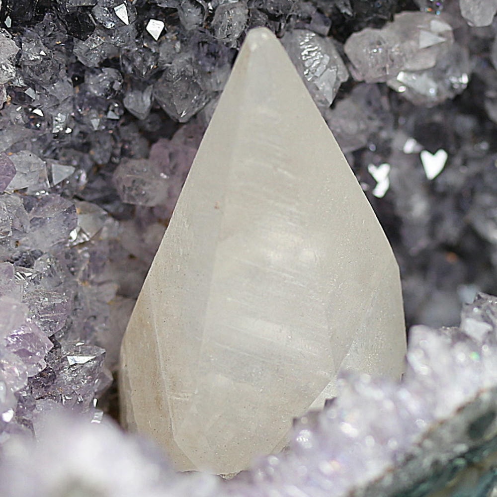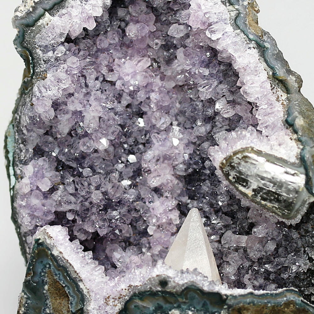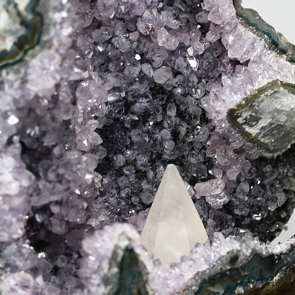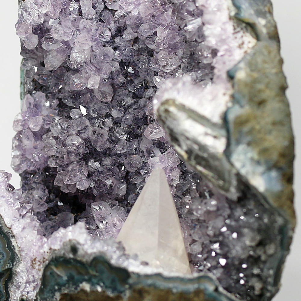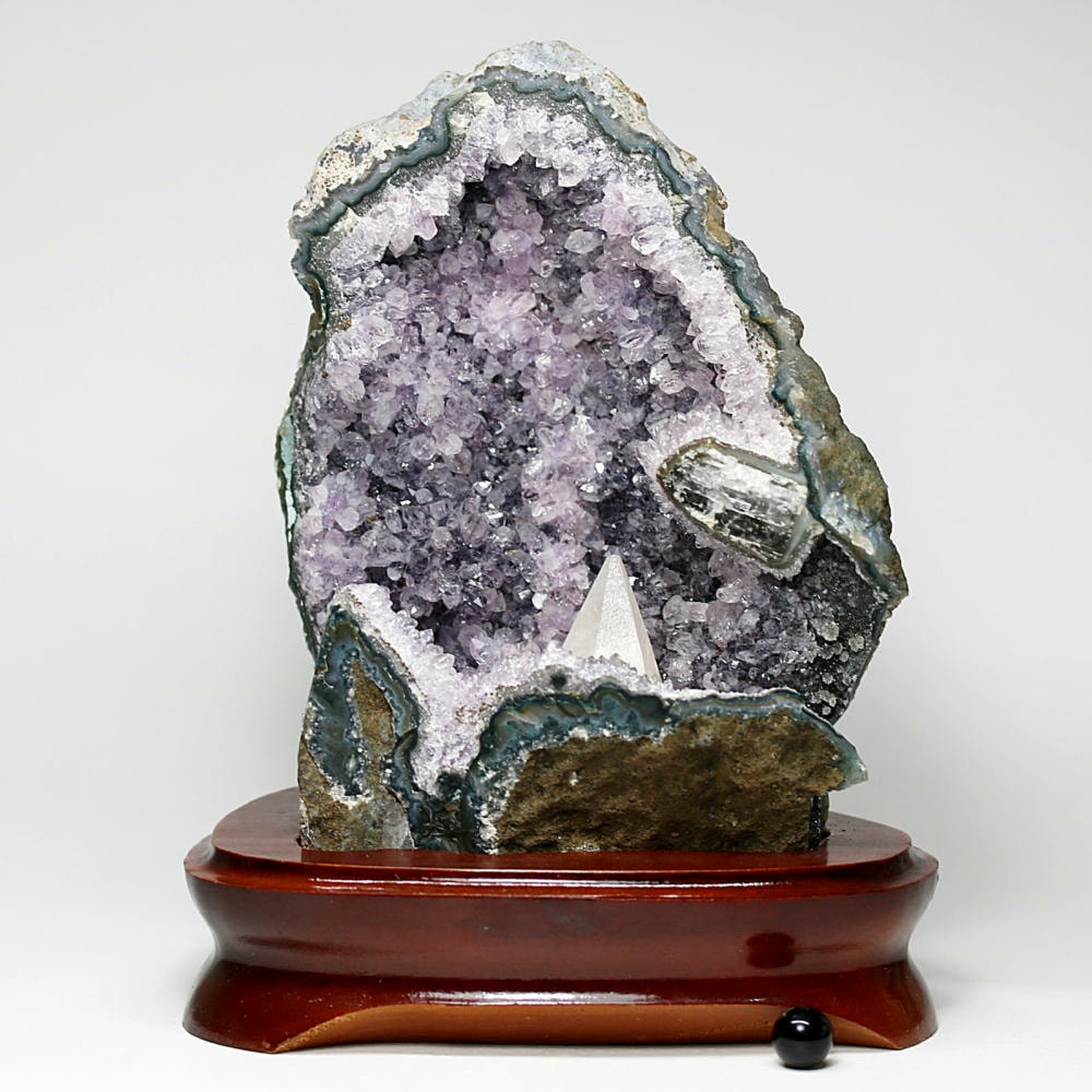 記念特価★ブラジル産カルサイト共生フラワーアメジスト原石クラスター(専用木製台座付属)