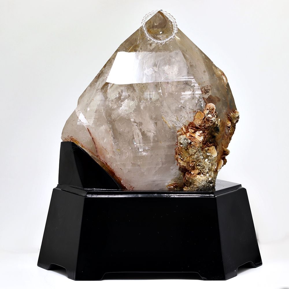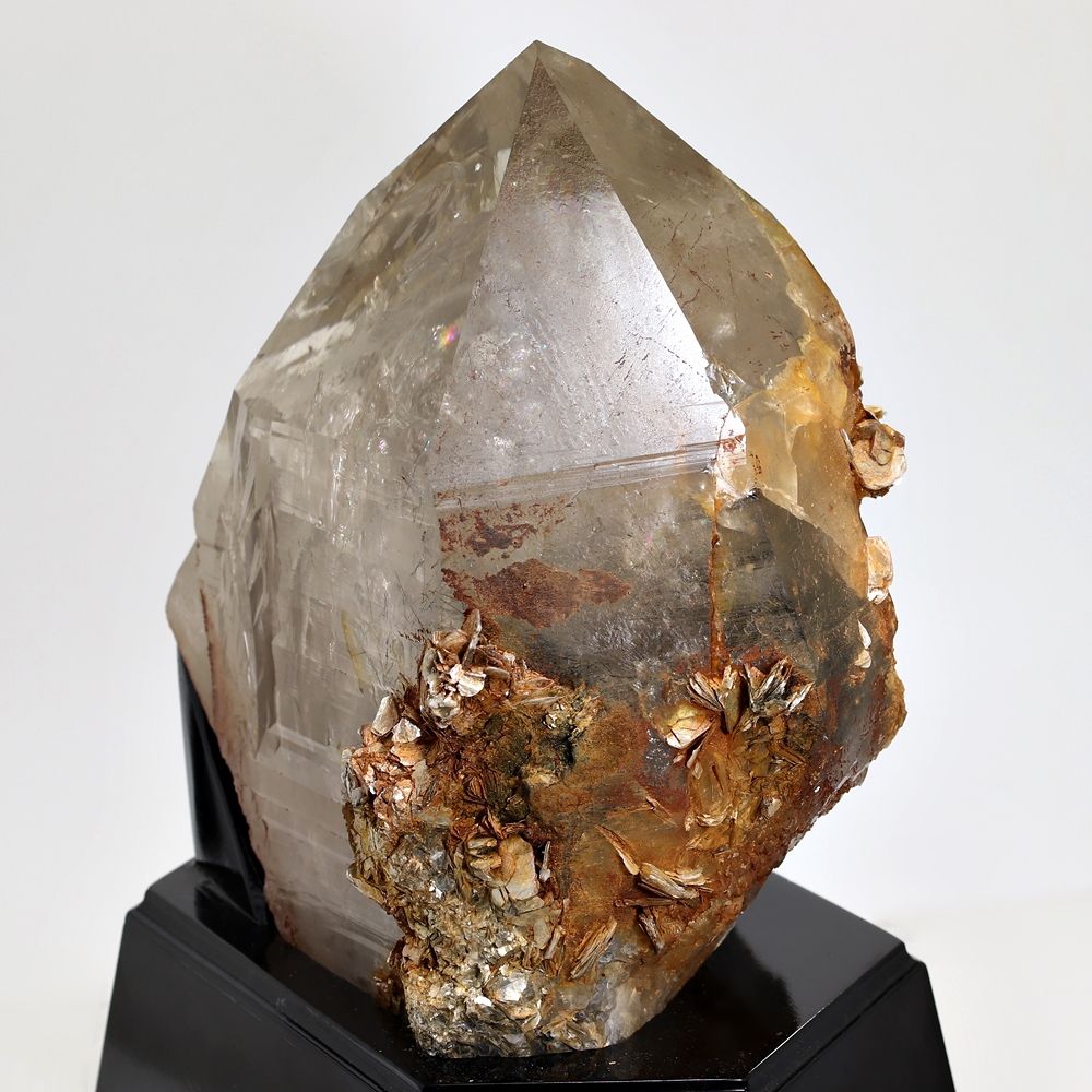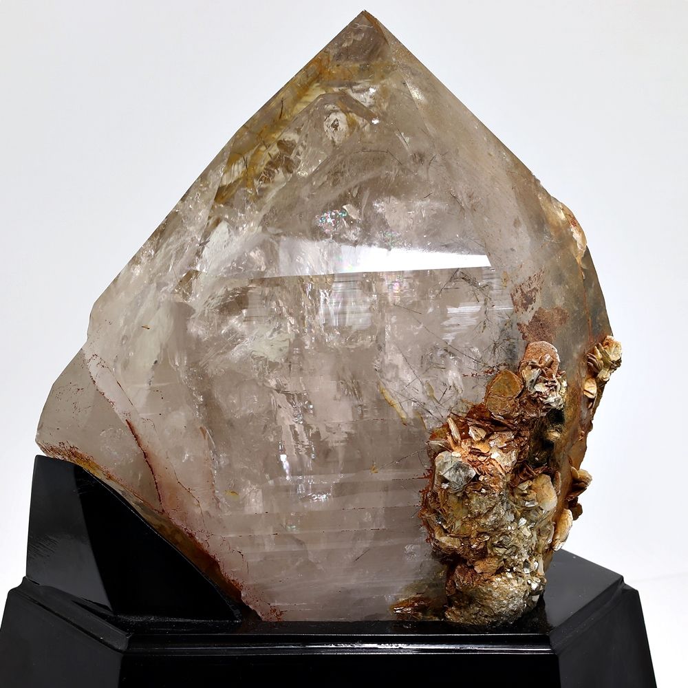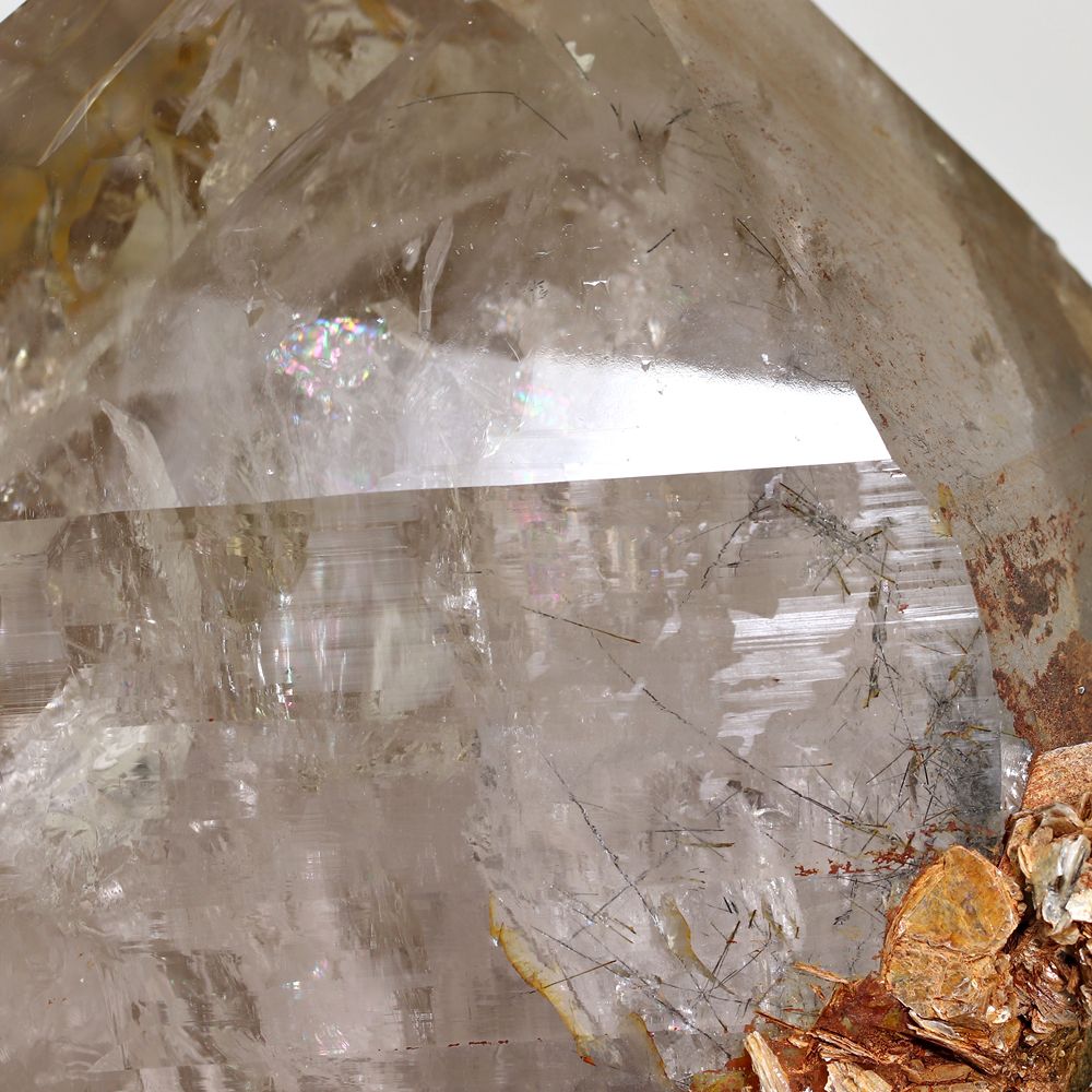 これほど大きなサイズながら、品質としても申し分なく、透明度高く内部の結晶構造が視認できるほど。さらに、ブラックトルマリンやマイカが共生。内部には美しい天然レインボーが現れます。