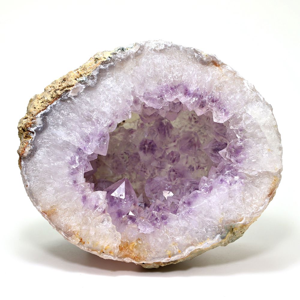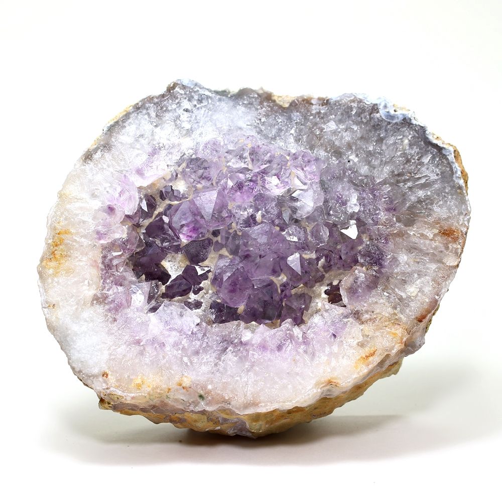 外側はゴツゴツとしたただの石や岩の塊に見えますが、半分に割った内部には美しいアメジスト結晶が一面に広がっています。