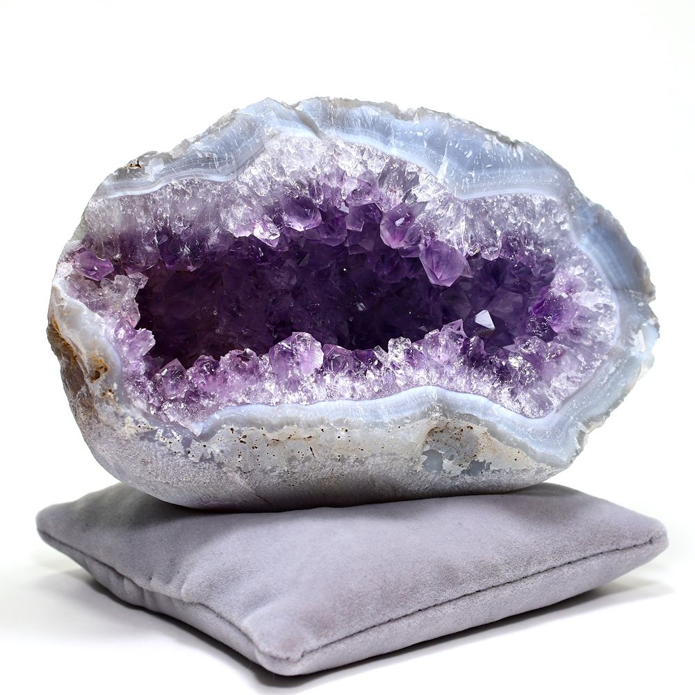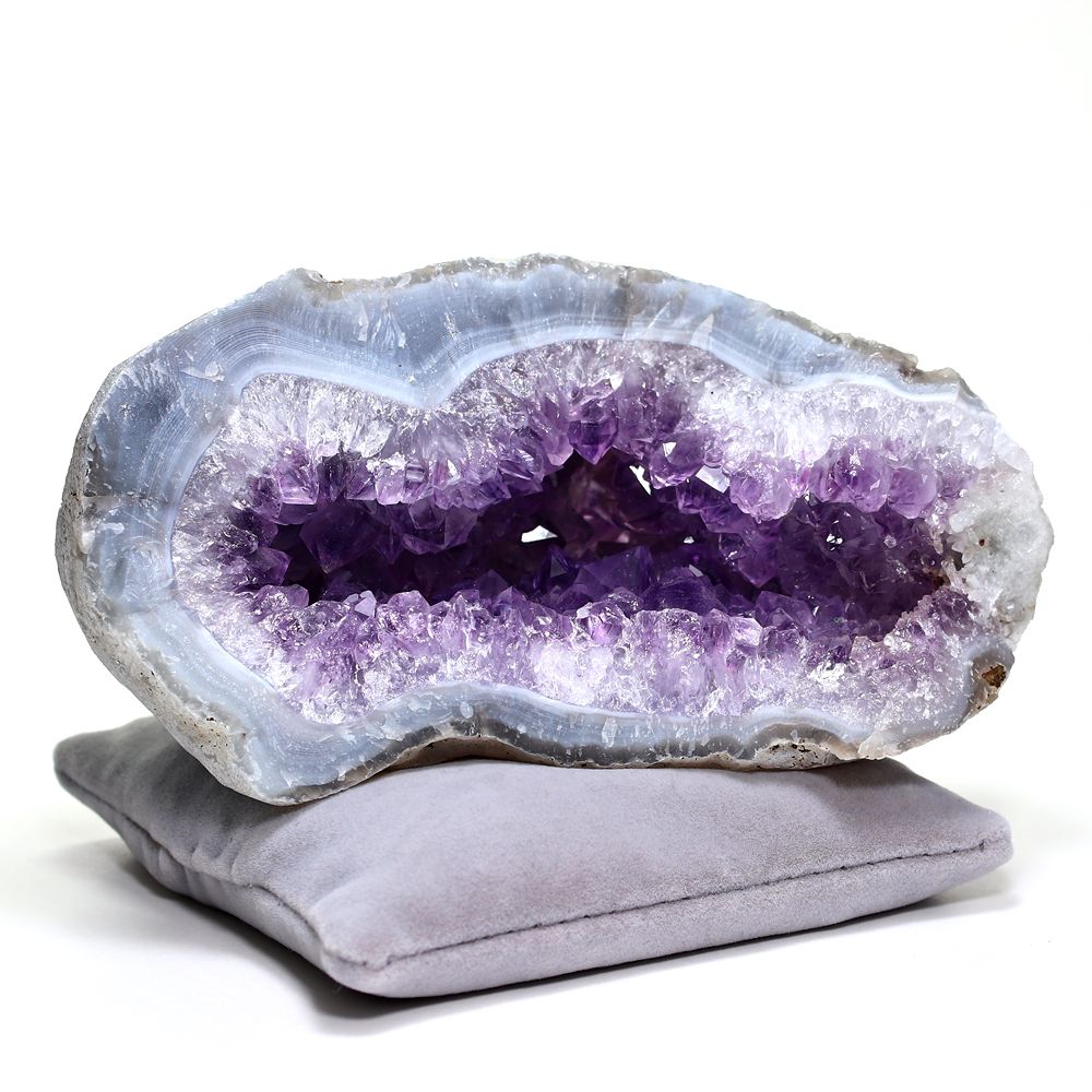 外側はゴツゴツとしたただの石や岩の塊に見えますが、半分に割った内部には美しいアメジスト結晶が一面に広がっています。