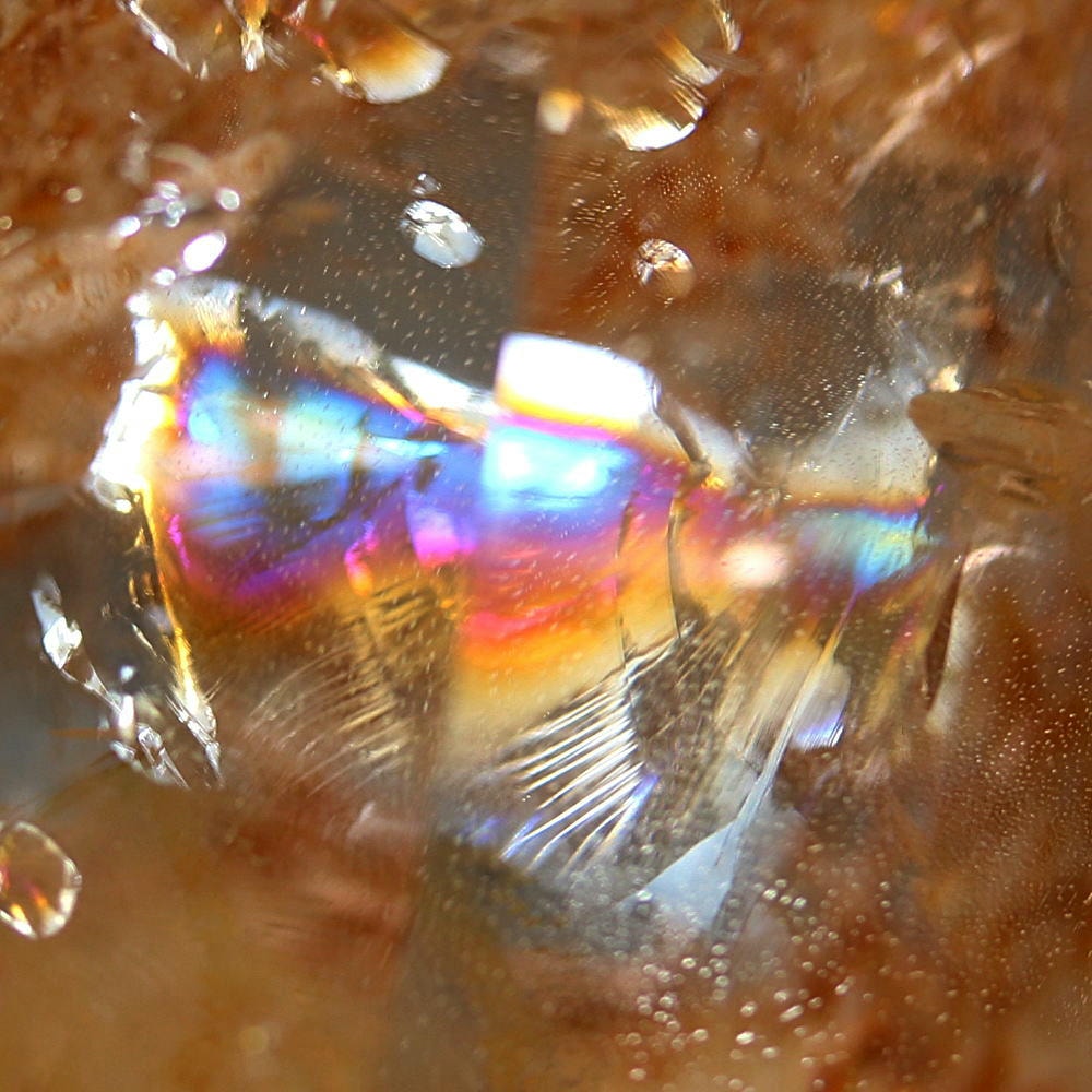 レインボークォーツは、水晶が成長する過程で空気や外部要因によって発生したクラックに光が反射し、角度によって美しい虹色に輝きます。