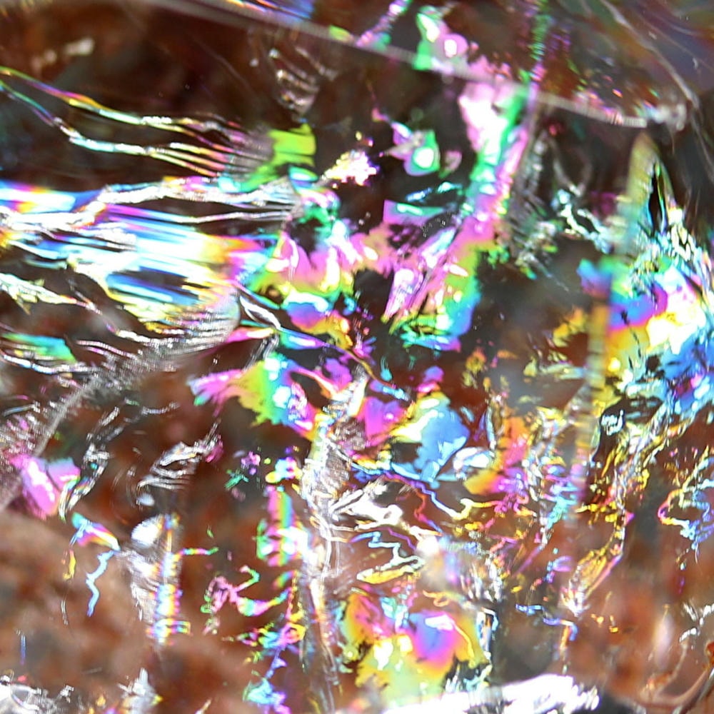 レインボークォーツは、水晶が成長する過程で空気や外部要因によって発生したクラックに光が反射し、角度によって美しい虹色に輝きます。