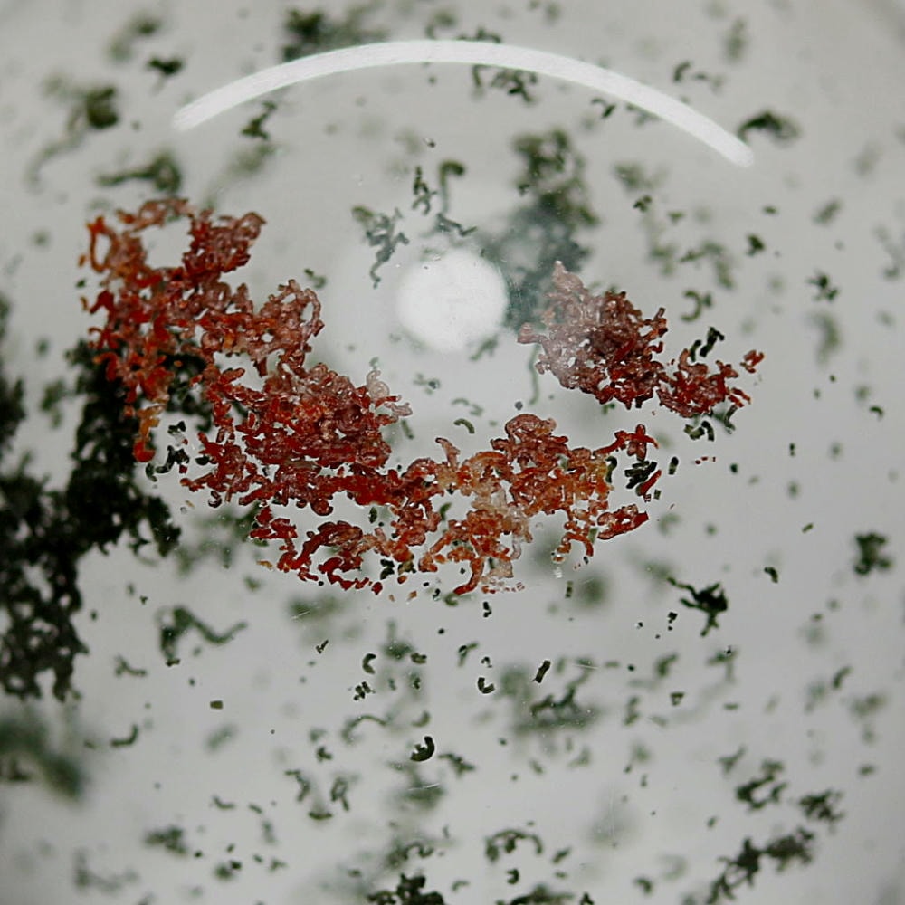 ガーデンクォーツは、リモナイト、ヘマタイト、リモナイト、クローライト、トレモライト、マイカ、アンフィボール、ロイヒテンバージャイトなど様々な内包物が閉じ込められた水晶(インクォーツ)と言われておりますが、実のところ詳細な内包情報は鑑別機関に出しても特定は困難です。