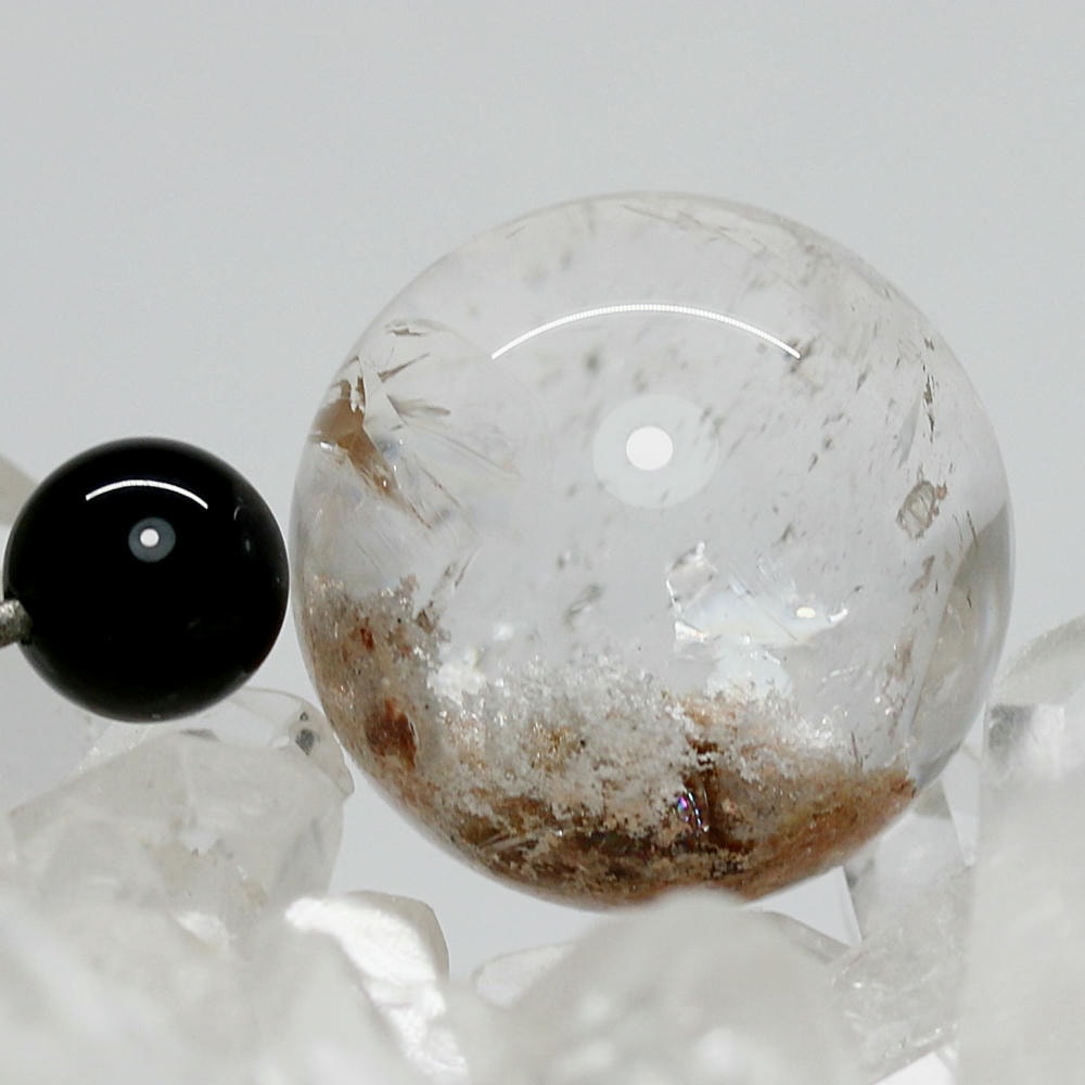 直径2〜3cmほどの小さな水晶玉の内部に、鉱物が閉じ込められたガーデンクォーツ丸玉でございます。