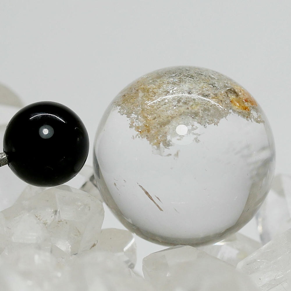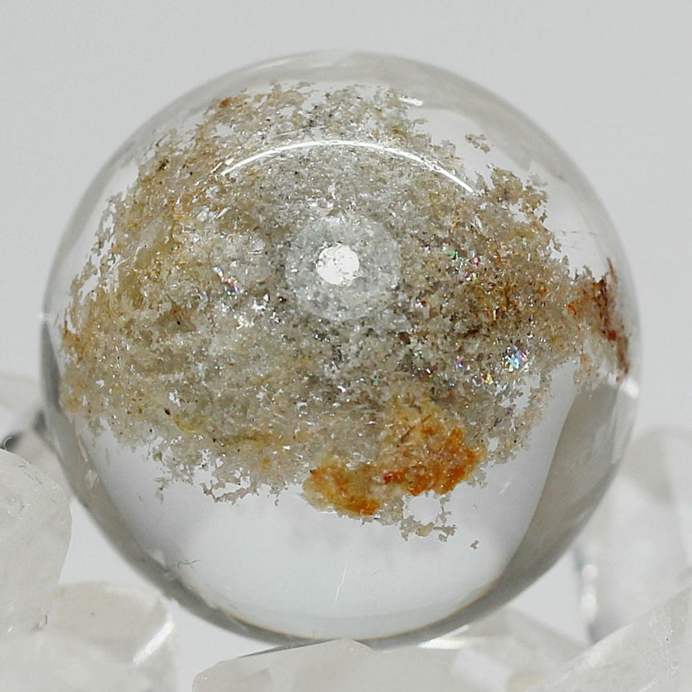 直径2〜3cmほどの小さな水晶玉の内部に、鉱物が閉じ込められたガーデンクォーツ丸玉でございます。