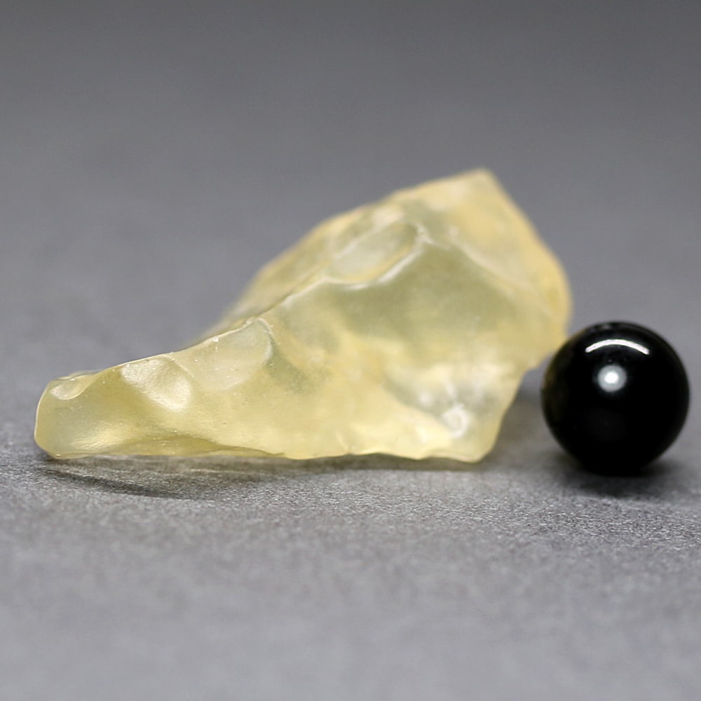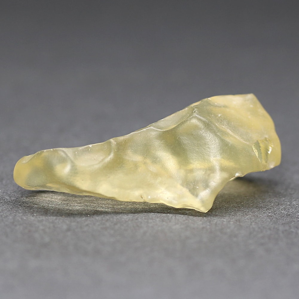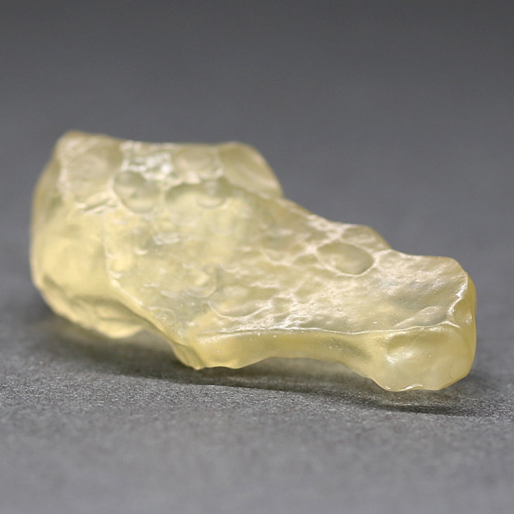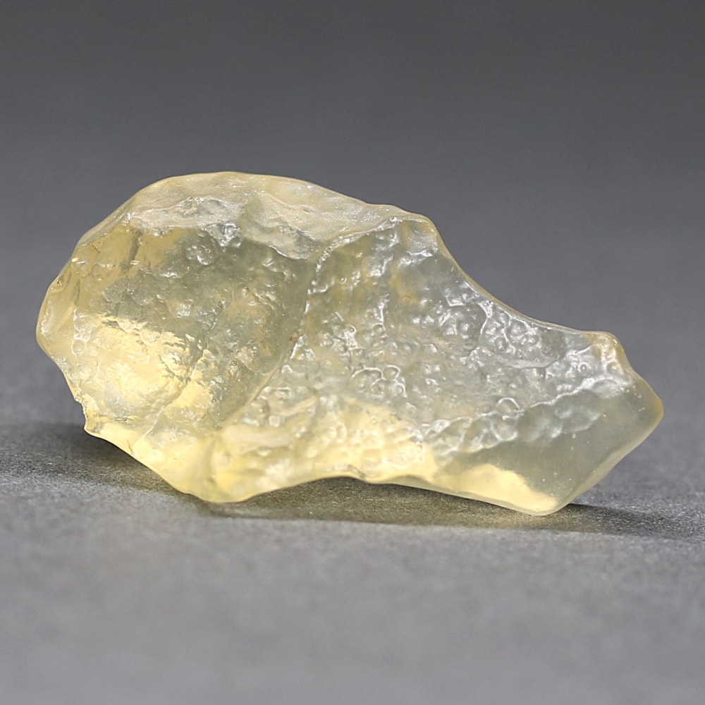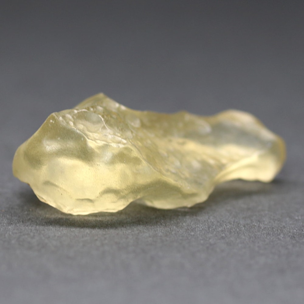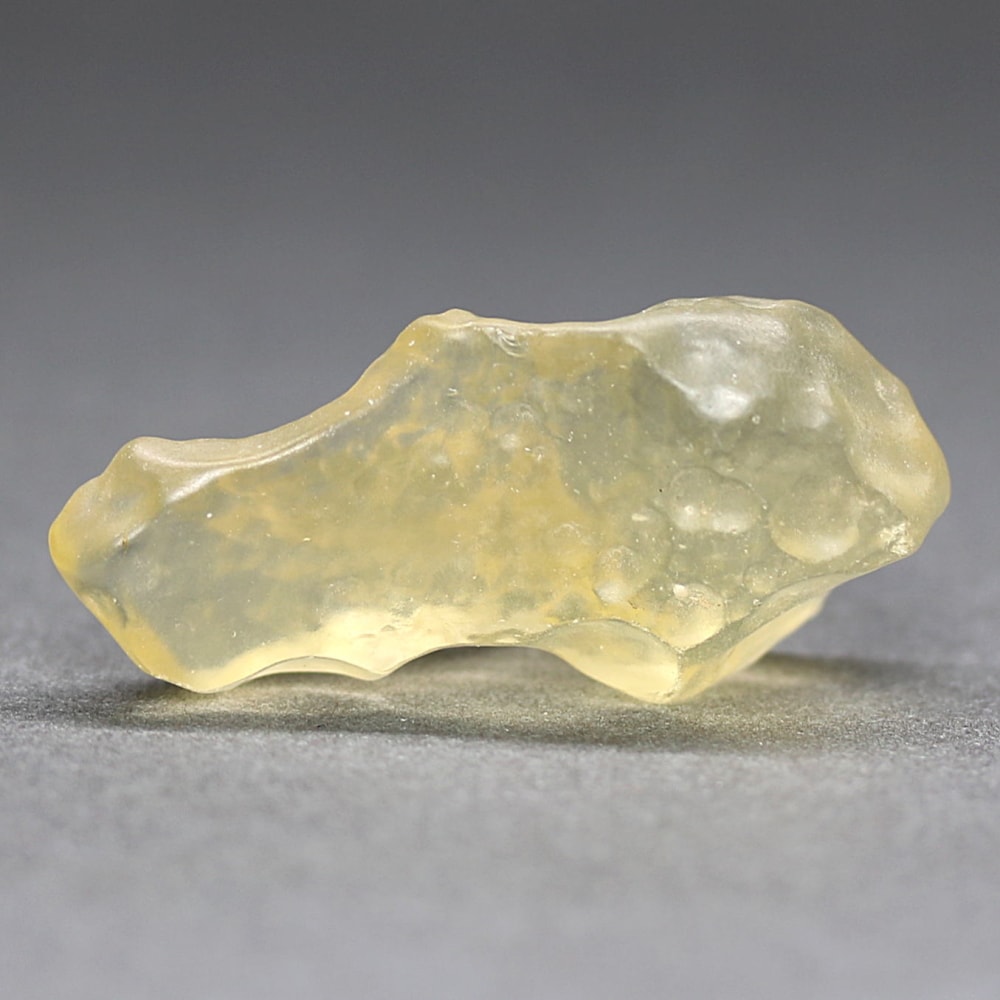 透き通ったライトイエローカラーにテクタイト系の鉱物に見られる独特の表面が、眺めるごとに新しい表情を発見させてくれる “天然リビアングラス原石” に、つい見惚れてしまいます。