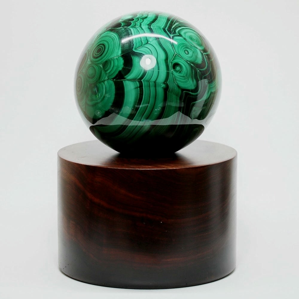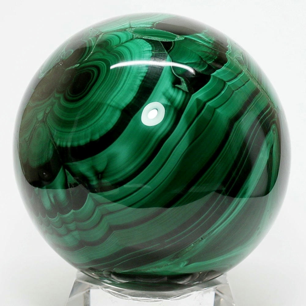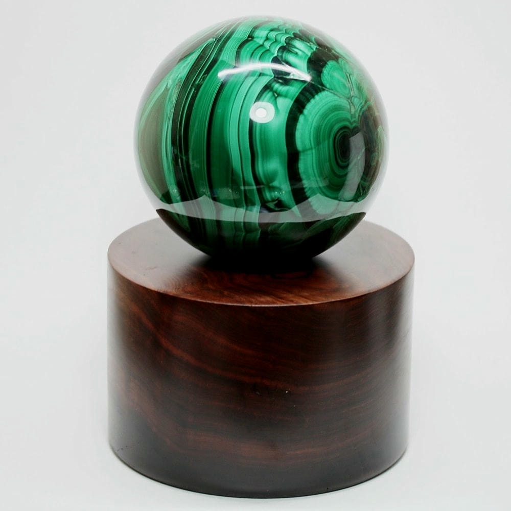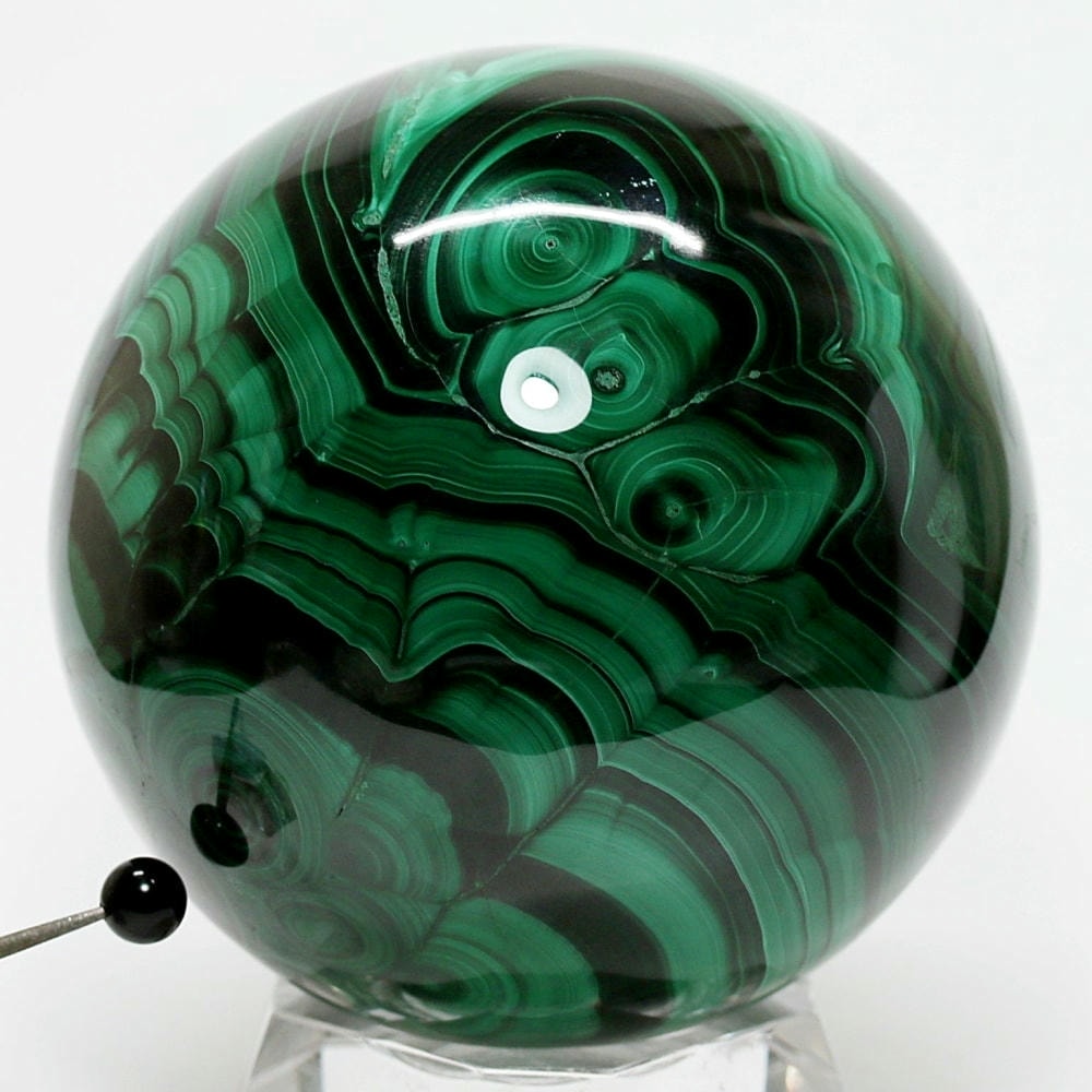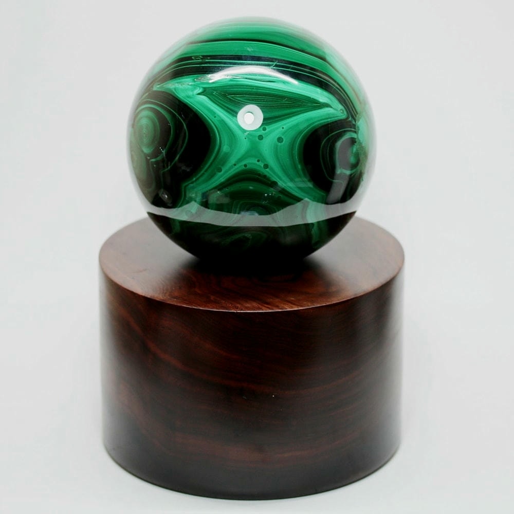 [希少・ザイール産]マラカイト丸玉/スフィア(直径125mm超大玉!・木製丸玉台座付属)¥158,000クイックガイド送料