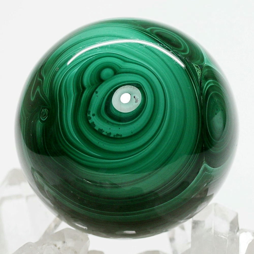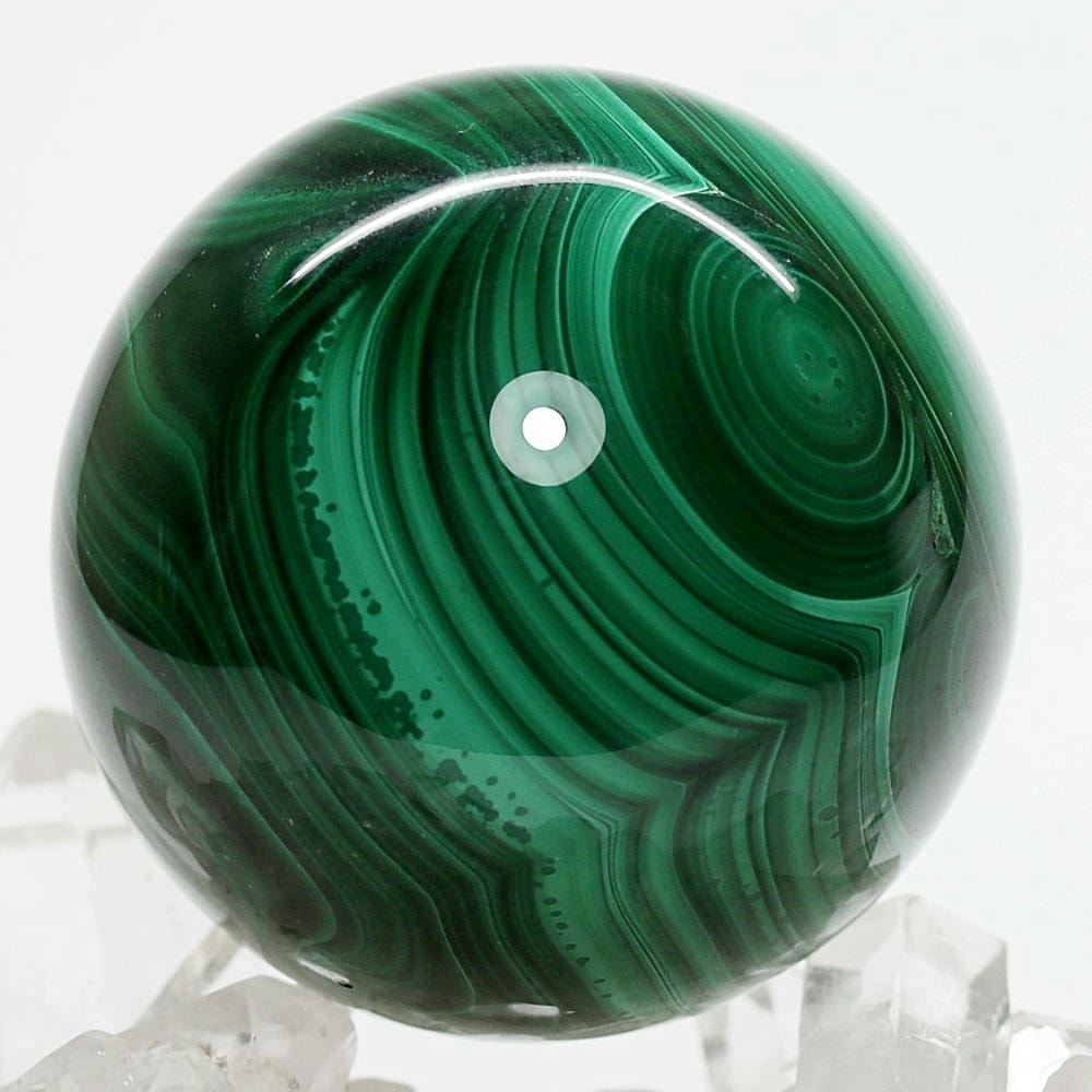 「孔雀石」とも呼ばれるマラカイトは、微結晶が折り重なり緑の濃淡(条痕)が縞模様となる美しい天然石で、研磨した際に現れる円状の模様は丸玉ごとに全く違う表情を持っています。