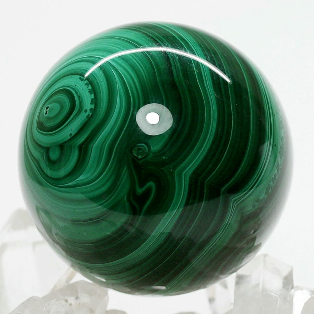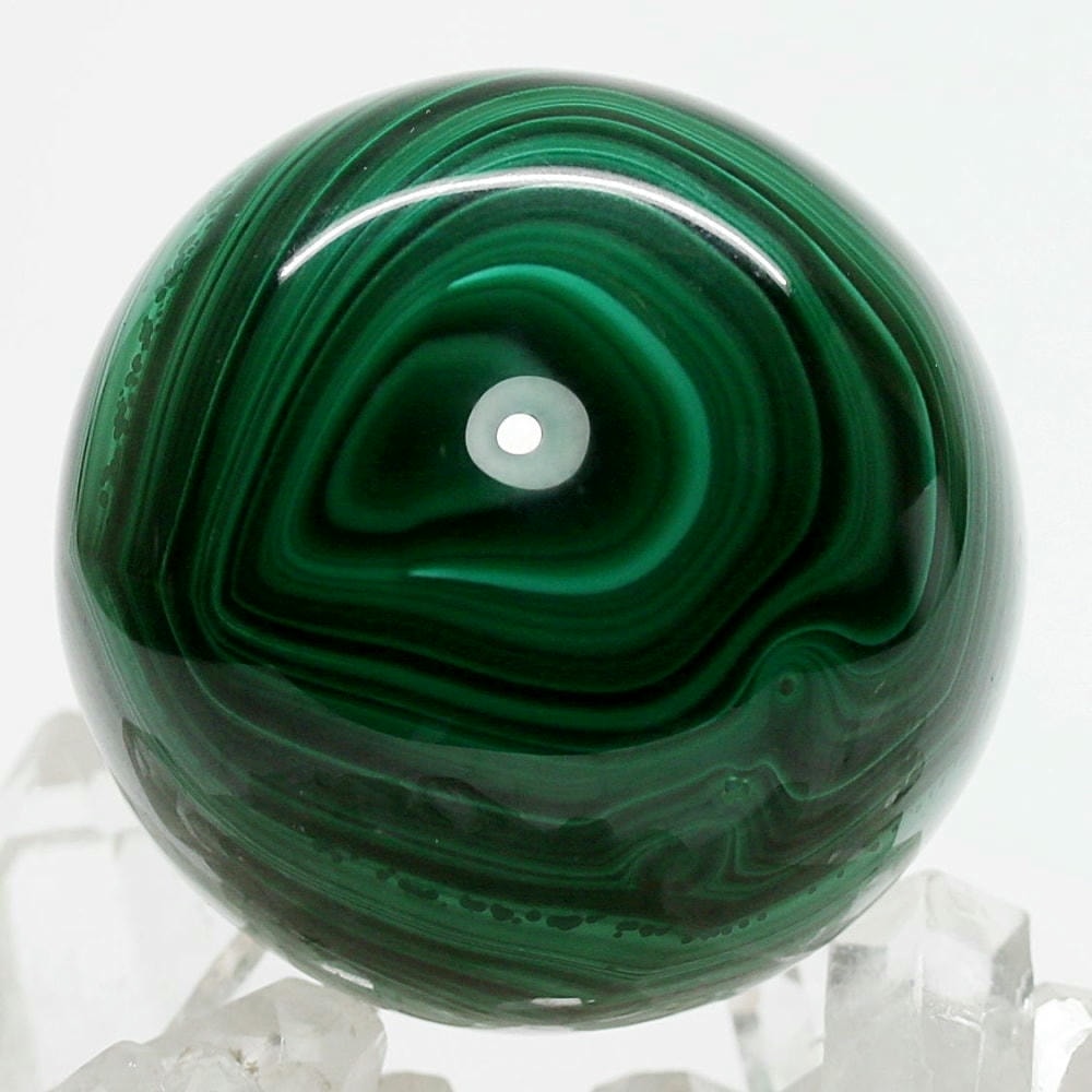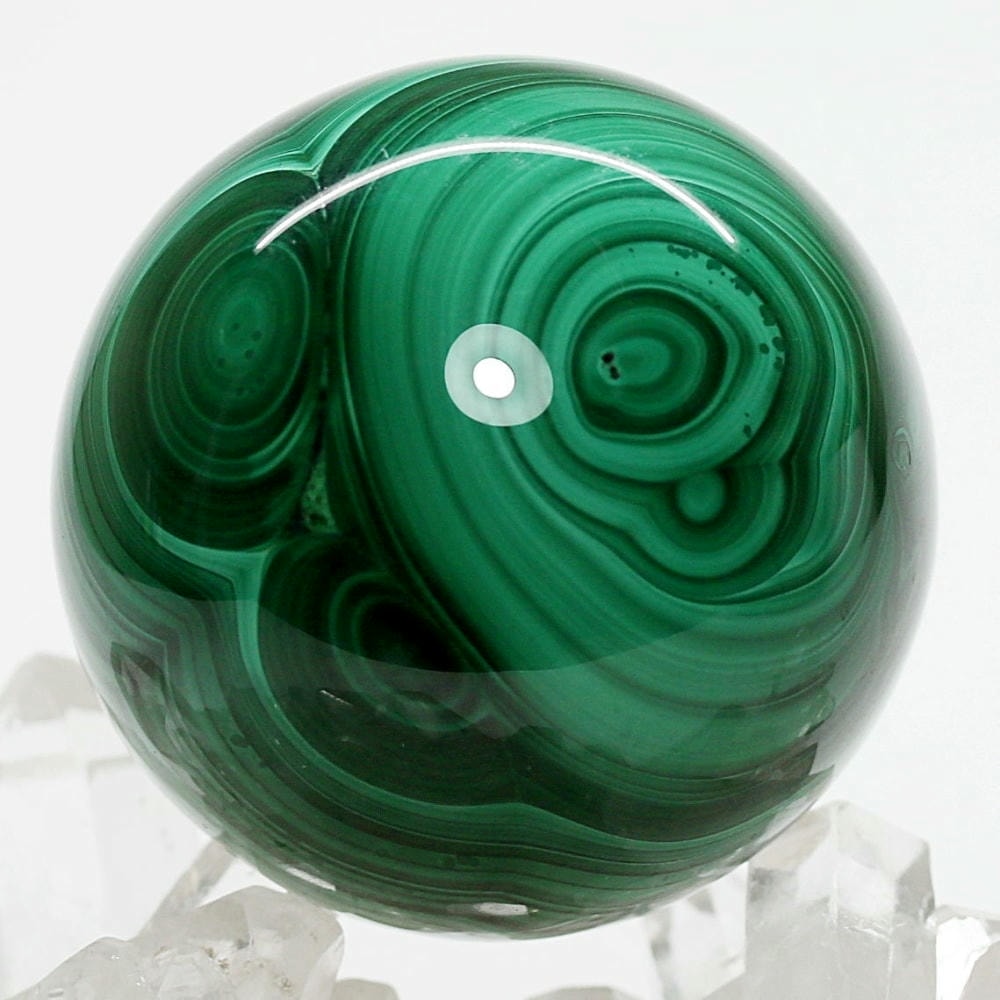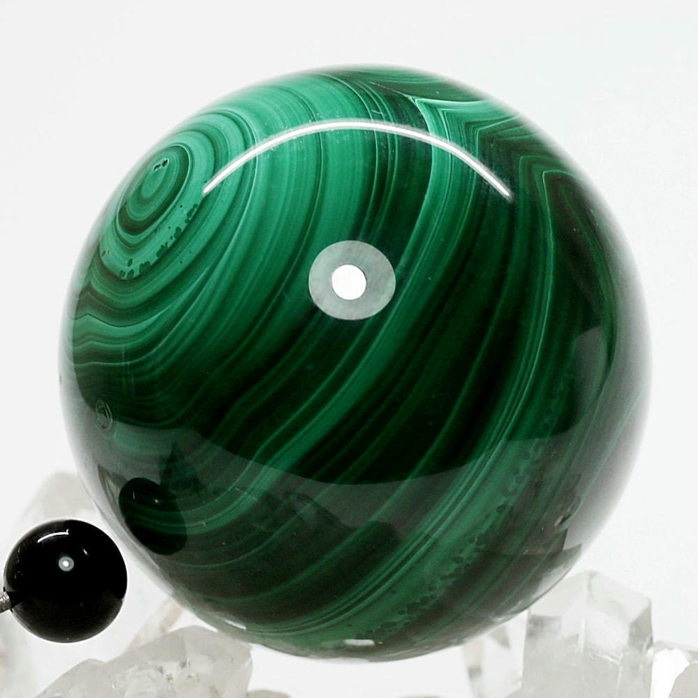 こちらの丸玉はグリーンの発色がよく出ているザイール産天然マラカイト原石から作製されており、縞模様が大変美しく、照り艶、発色も見事な妥協のない逸品です。