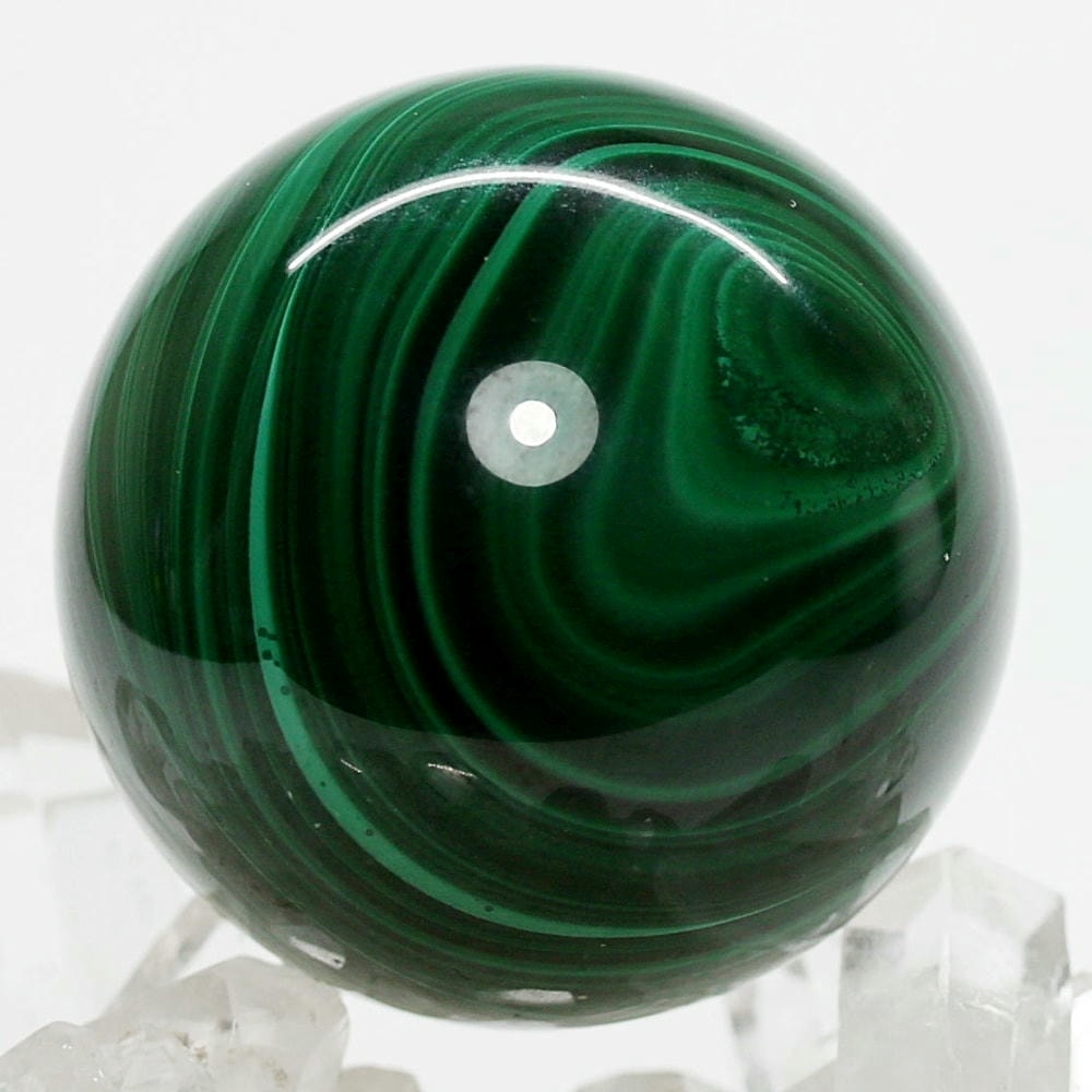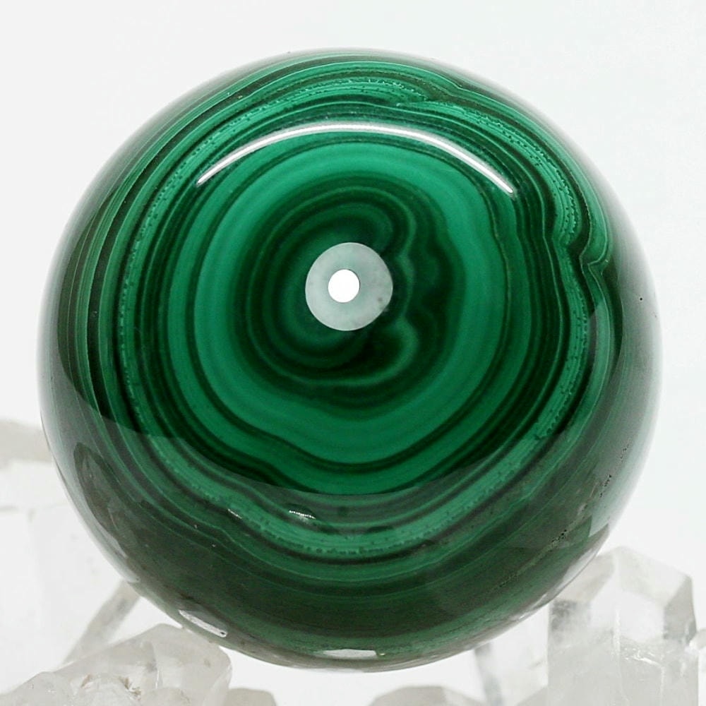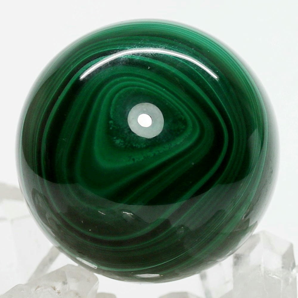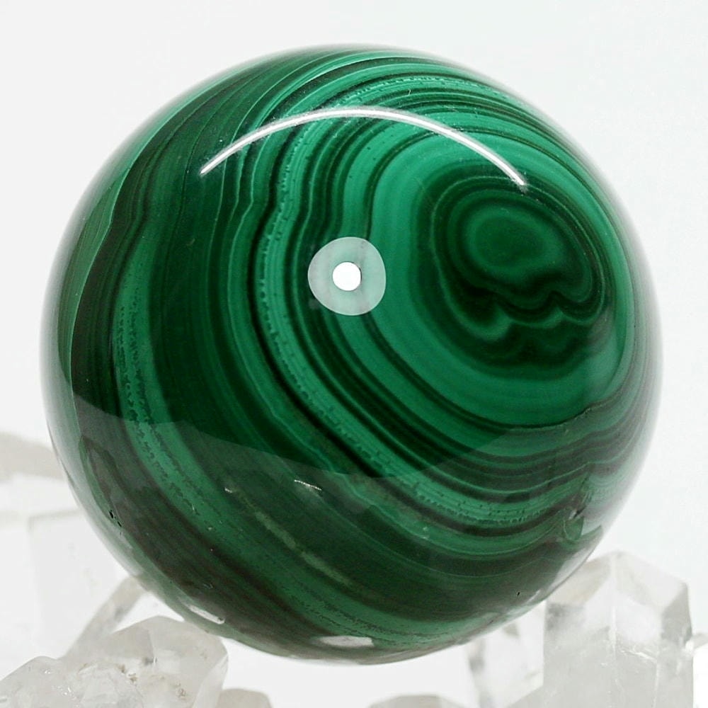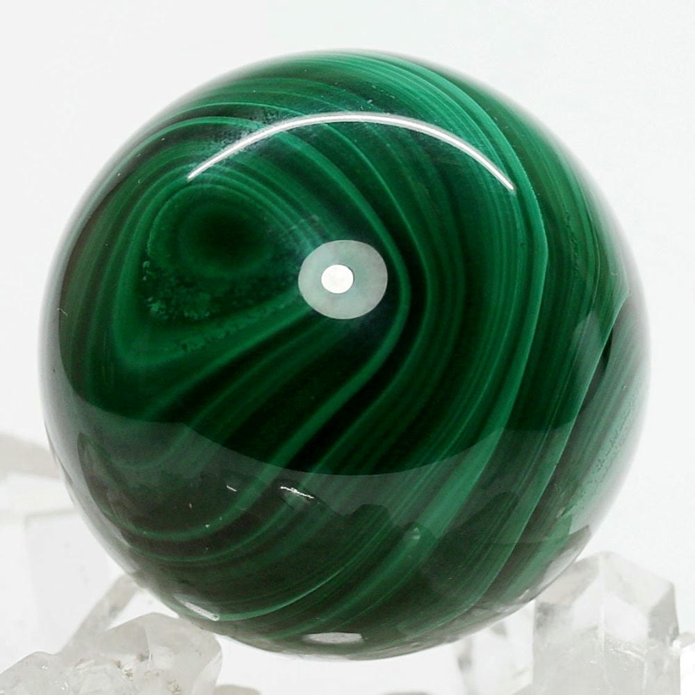 「孔雀石」とも呼ばれるマラカイトは、微結晶が折り重なり緑の濃淡(条痕)が縞模様となる美しい天然石で、研磨した際に現れる円状の模様は丸玉ごとに全く違う表情を持っています。