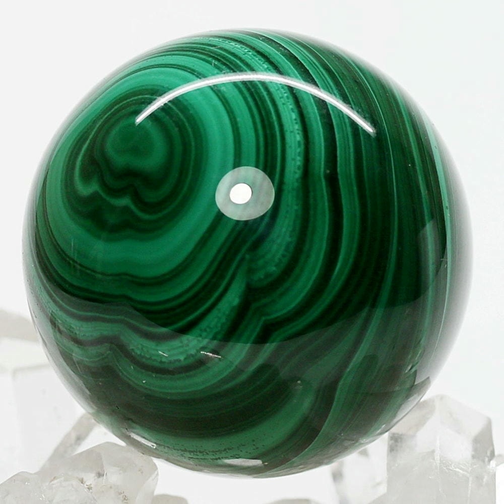 こちらの丸玉はグリーンの発色がよく出ているザイール産天然マラカイト原石から作製されており、縞模様が大変美しく、照り艶、発色も見事な妥協のない逸品です。