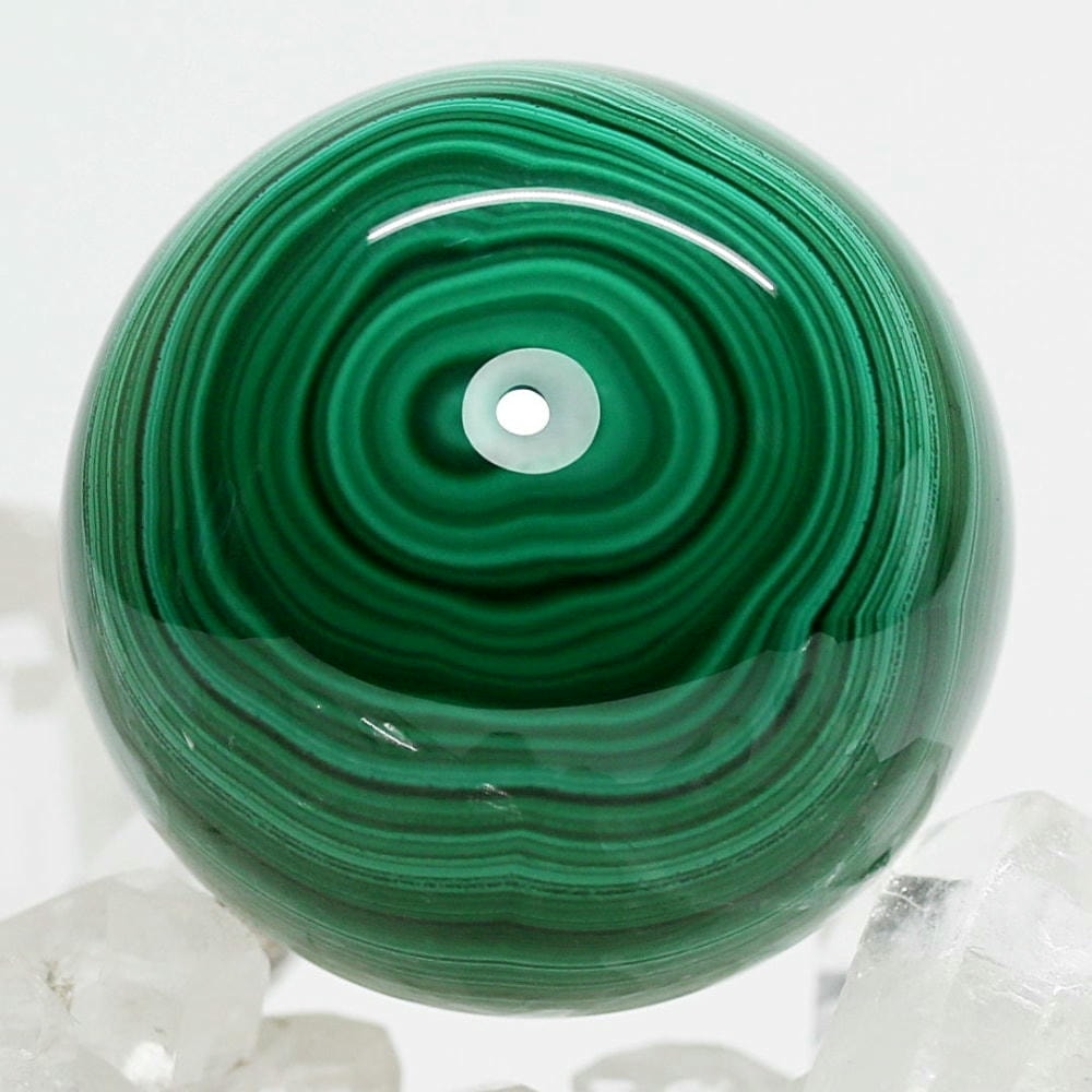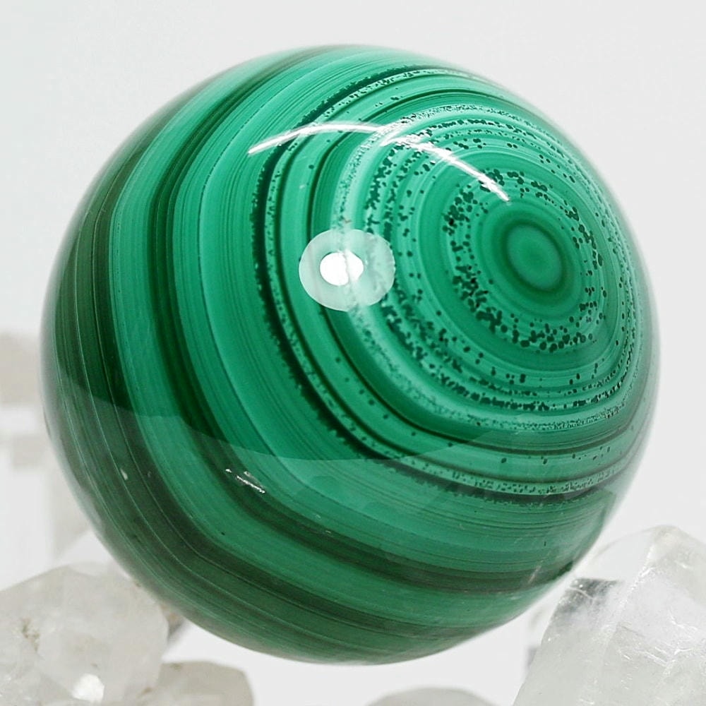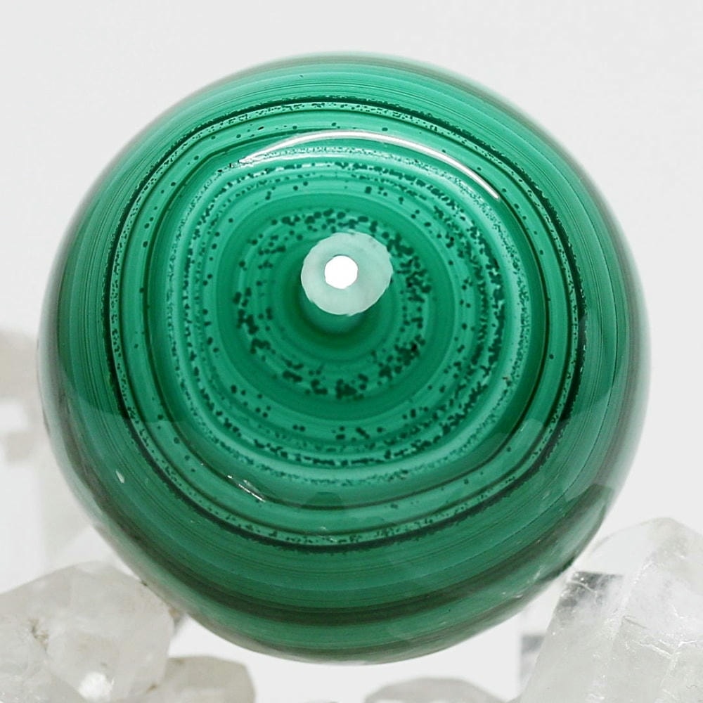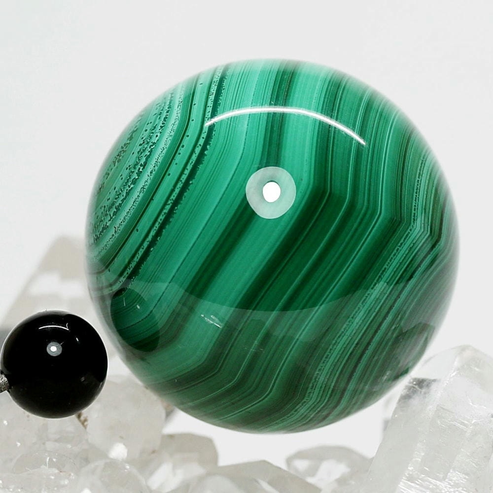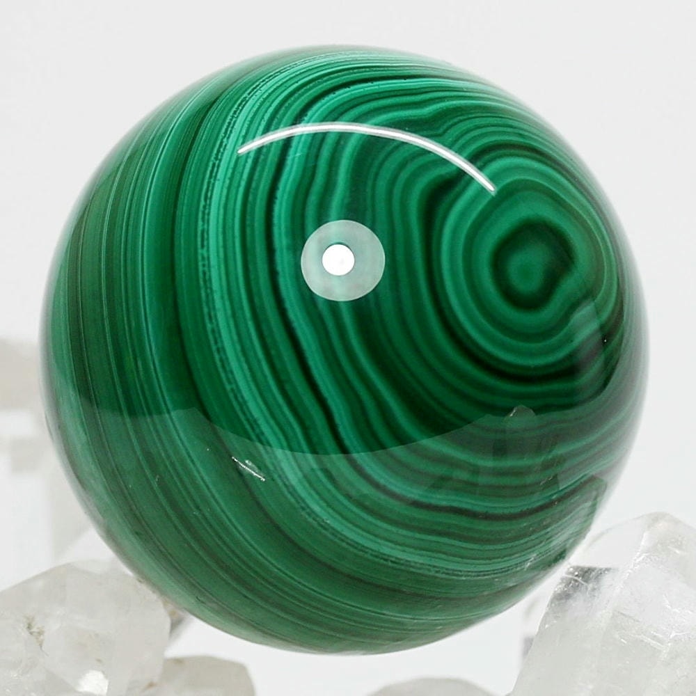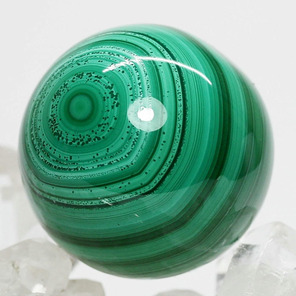 「孔雀石」とも呼ばれるマラカイトは、微結晶が折り重なり緑の濃淡(条痕)が縞模様となる美しい天然石で、研磨した際に現れる円状の模様は丸玉ごとに全く違う表情を持っています。