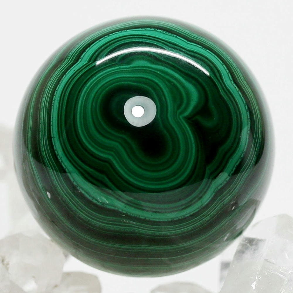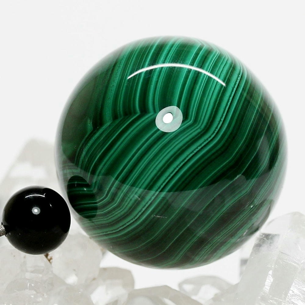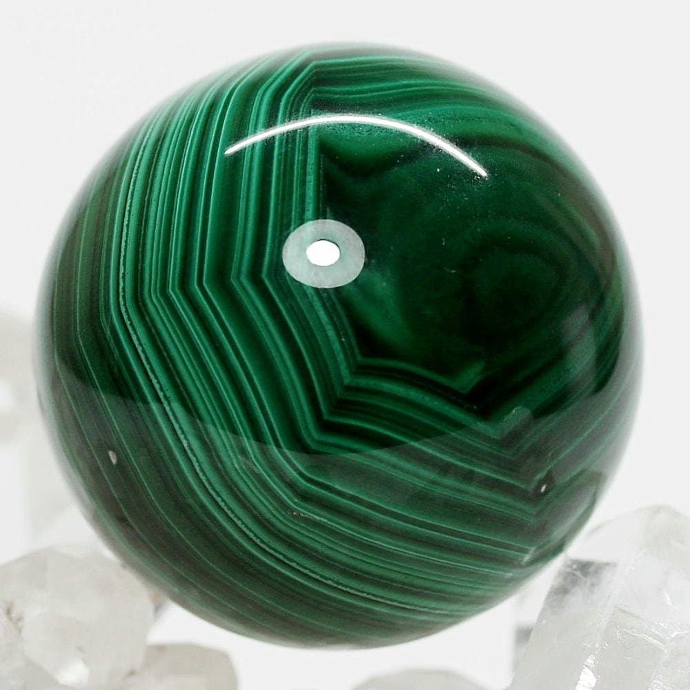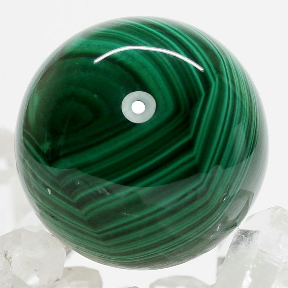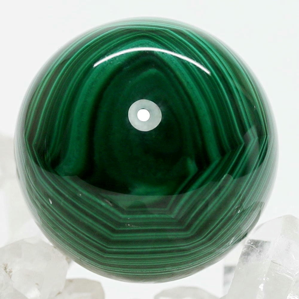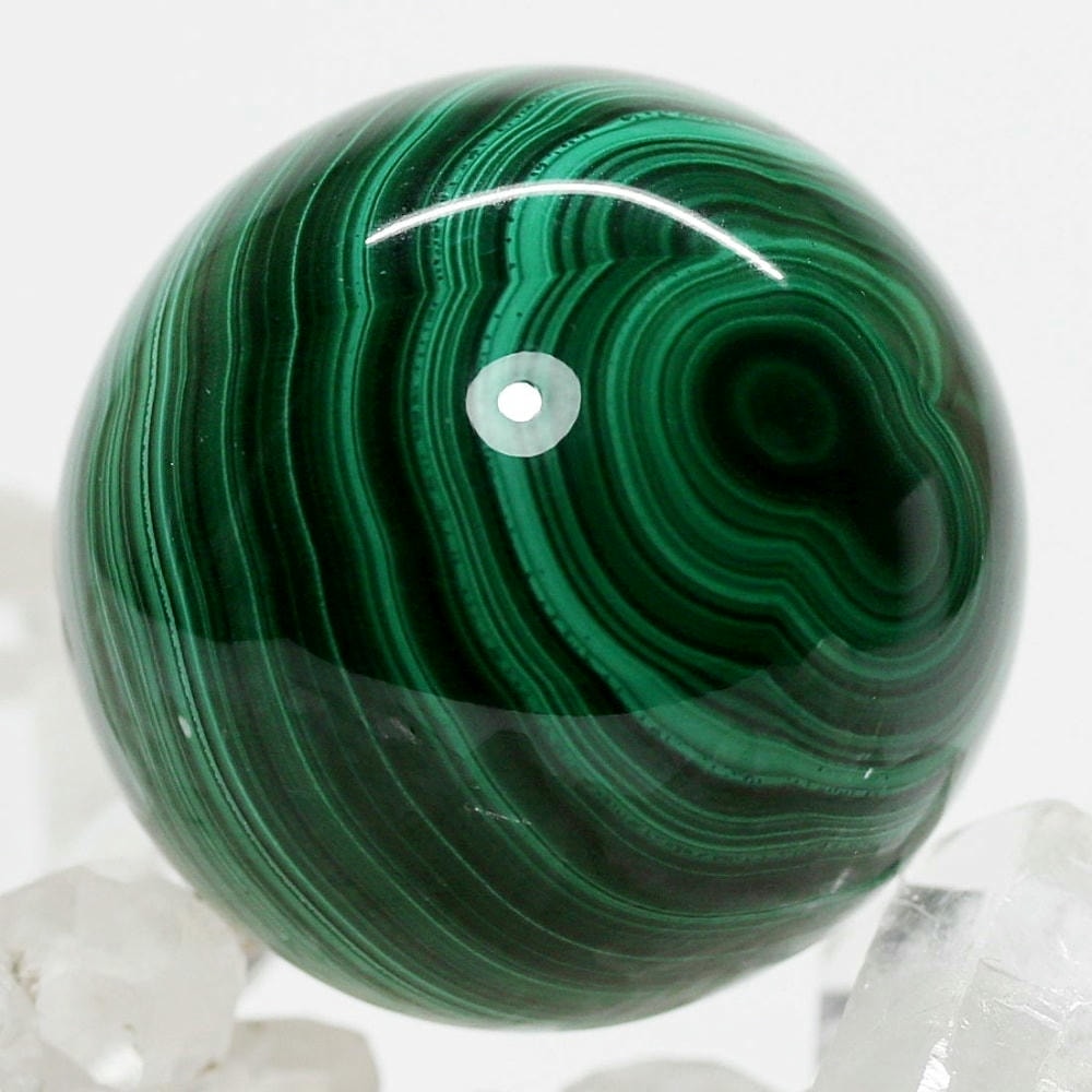「孔雀石」とも呼ばれるマラカイトは、微結晶が折り重なり緑の濃淡(条痕)が縞模様となる美しい天然石で、研磨した際に現れる円状の模様は丸玉ごとに全く違う表情を持っています。