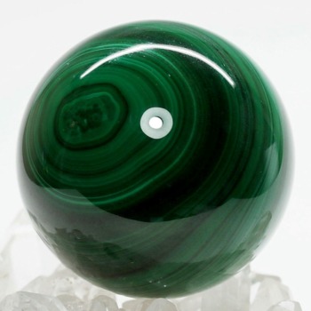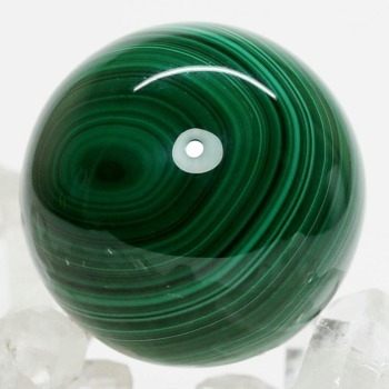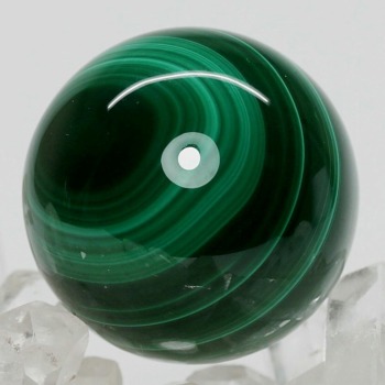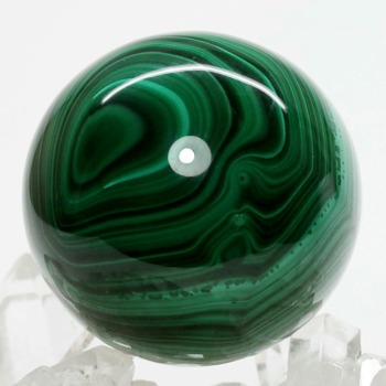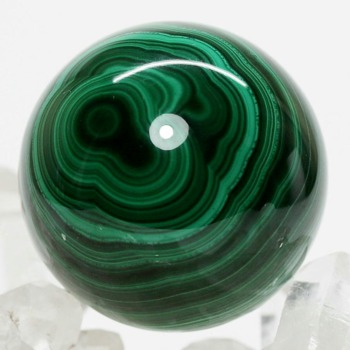 こちらの丸玉はグリーンの発色がよく出ているザイール産天然マラカイト原石から作製されており、縞模様が大変美しく、照り艶、発色も見事な妥協のない逸品です。