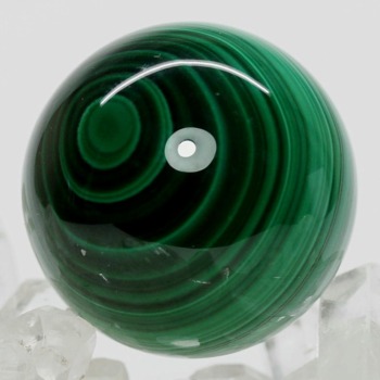 「孔雀石」とも呼ばれるマラカイトは、微結晶が折り重なり緑の濃淡(条痕)が縞模様となる美しい天然石で、研磨した際に現れる円状の模様は丸玉ごとに全く違う表情を持っています。