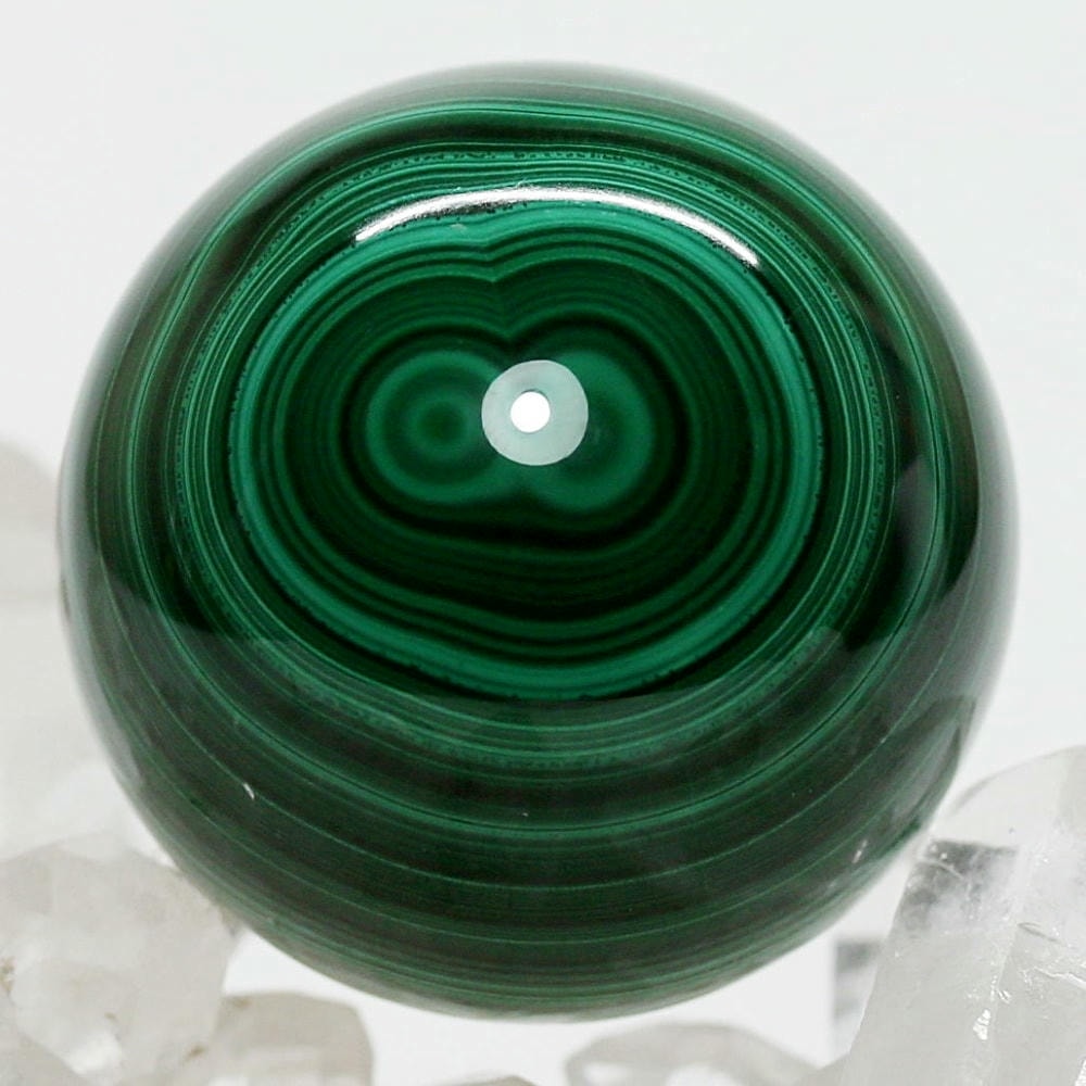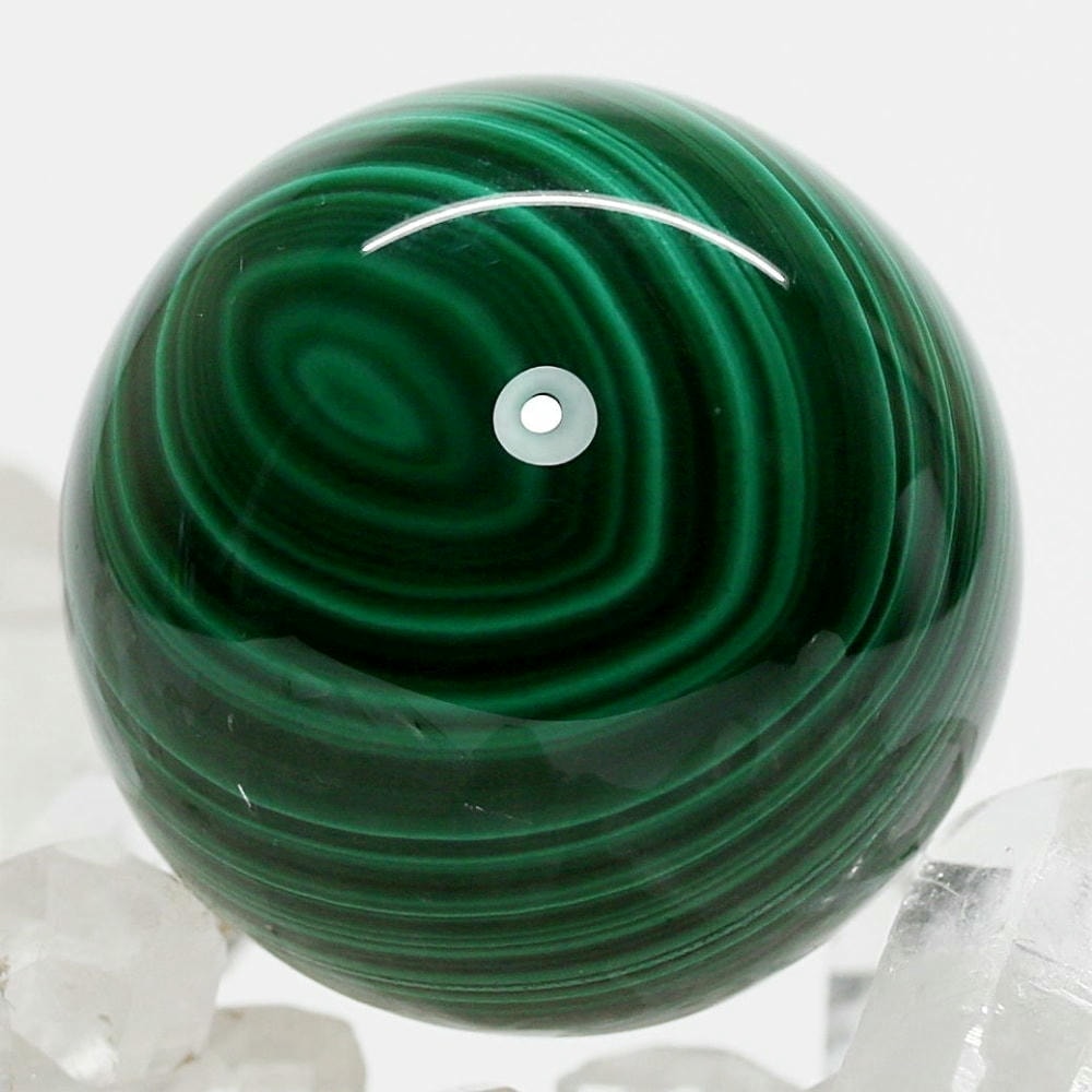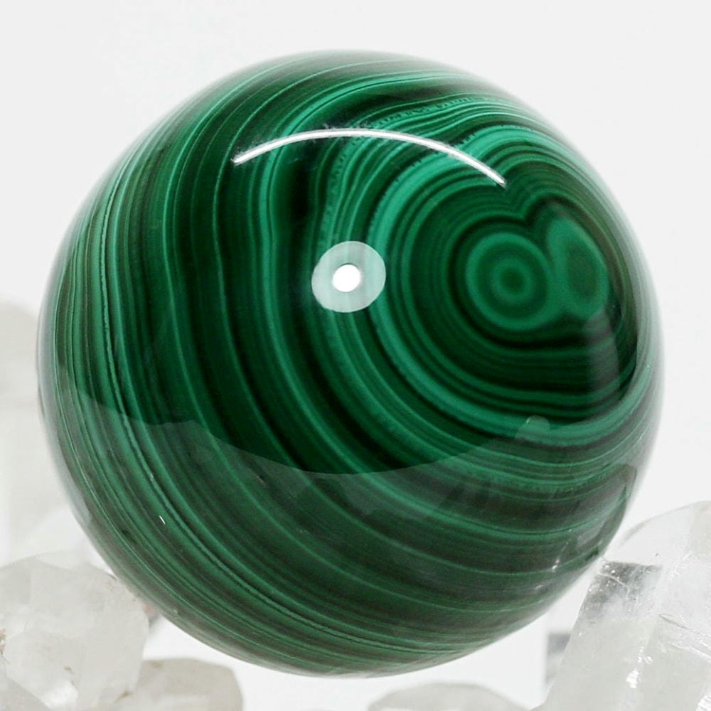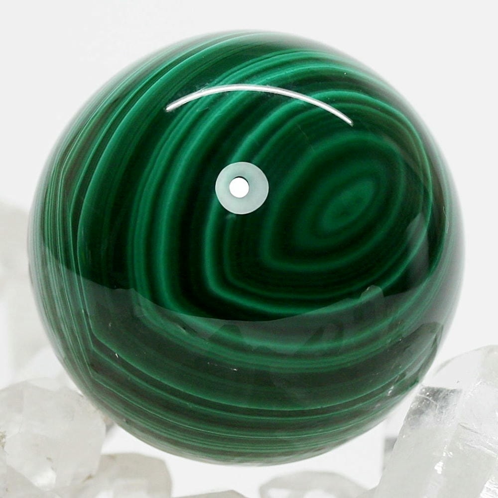 「孔雀石」とも呼ばれるマラカイトは、微結晶が折り重なり緑の濃淡(条痕)が縞模様となる美しい天然石で、研磨した際に現れる円状の模様は丸玉ごとに全く違う表情を持っています。