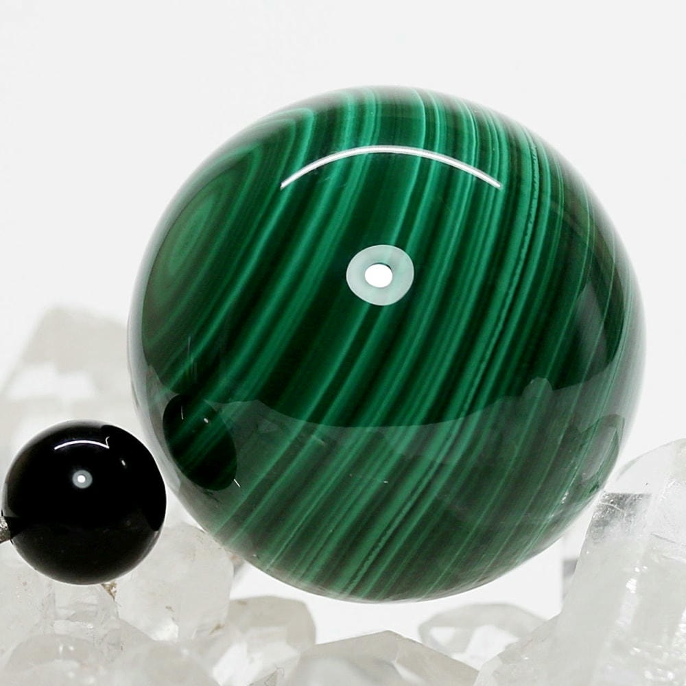 こちらの丸玉はグリーンの発色がよく出ているザイール産天然マラカイト原石から作製されており、縞模様が大変美しく、照り艶、発色も見事な妥協のない逸品です。