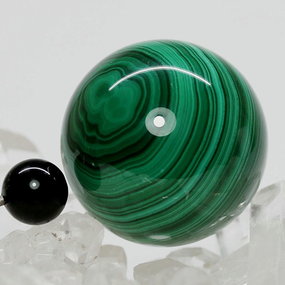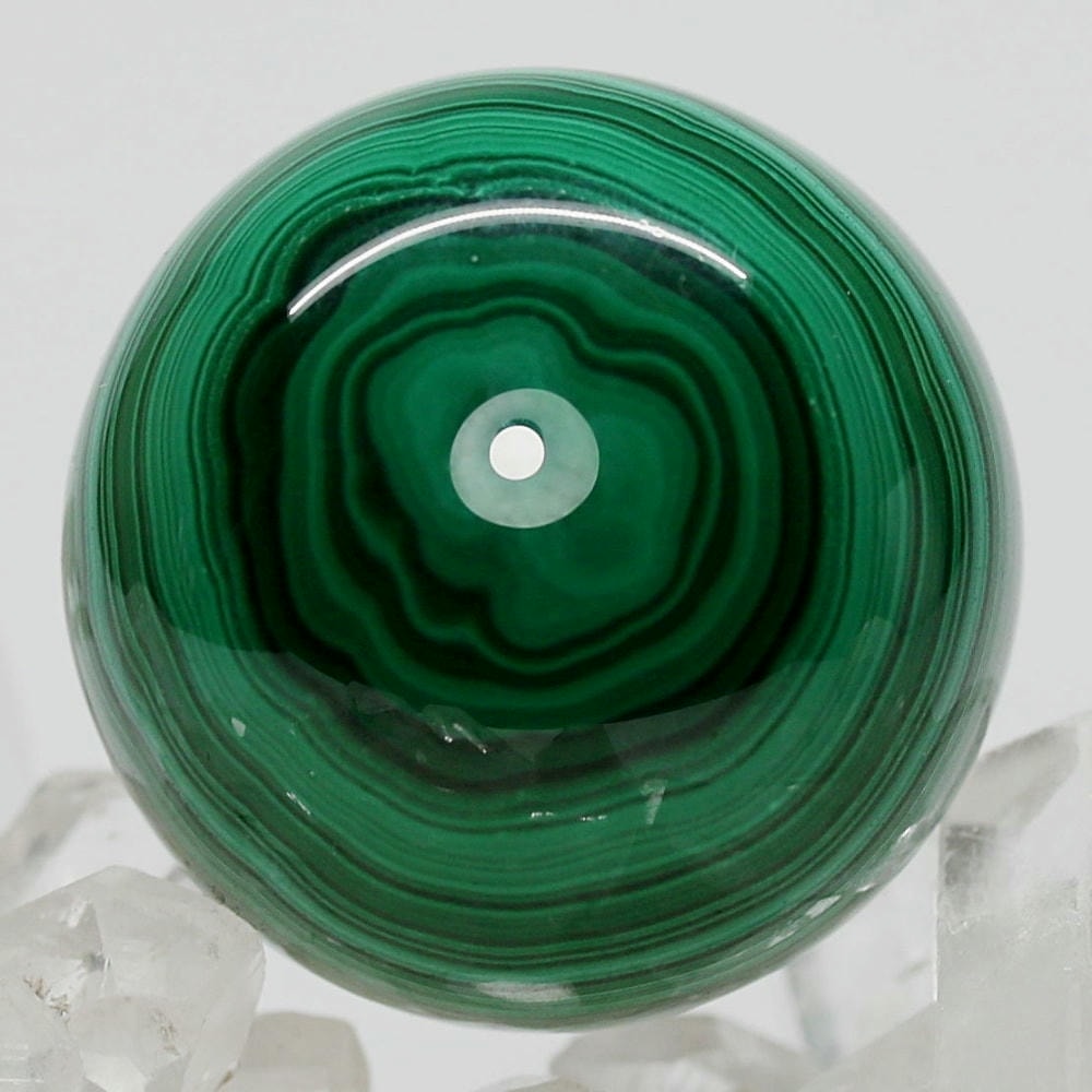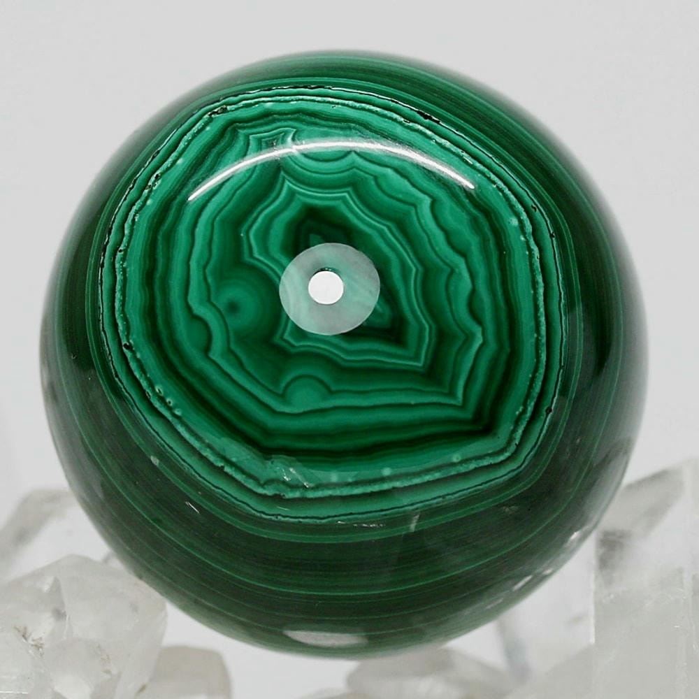 「孔雀石」とも呼ばれるマラカイトは、微結晶が折り重なり緑の濃淡(条痕)が縞模様となる美しい天然石で、研磨した際に現れる円状の模様は丸玉ごとに全く違う表情を持っています。