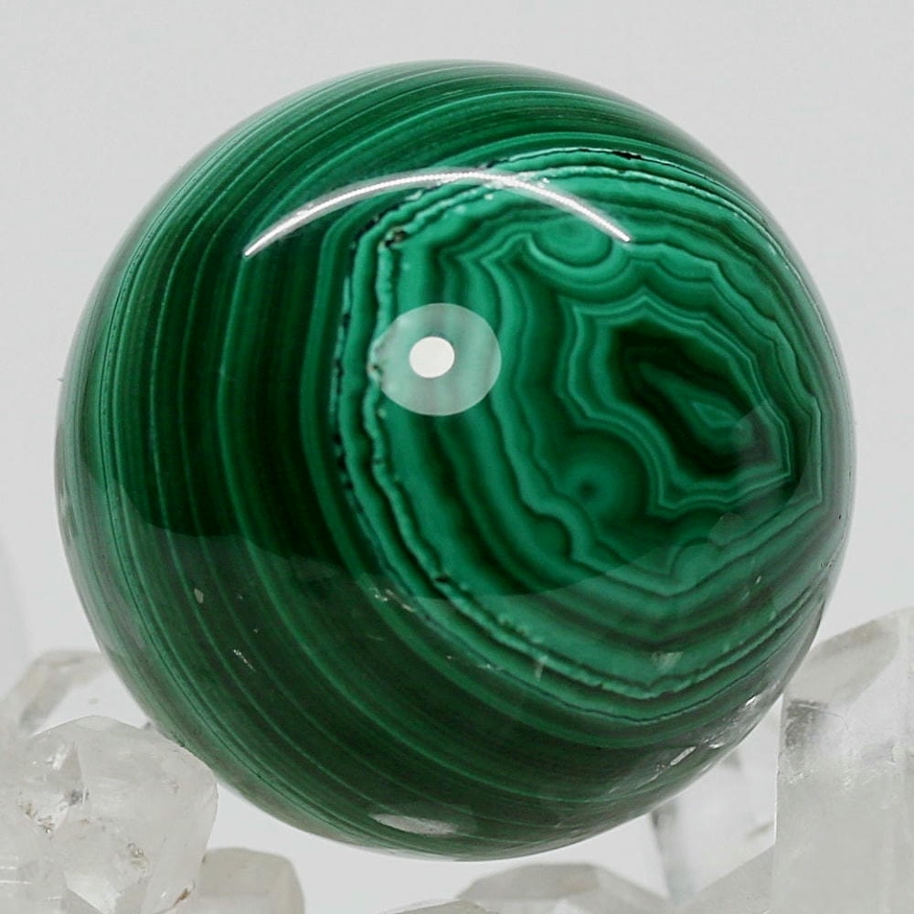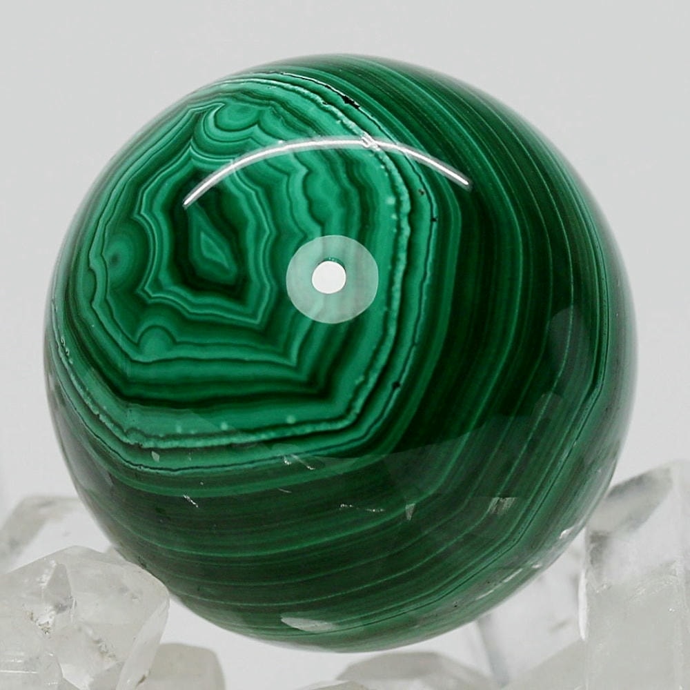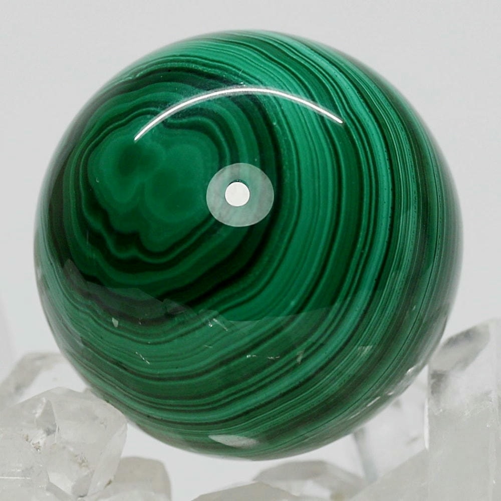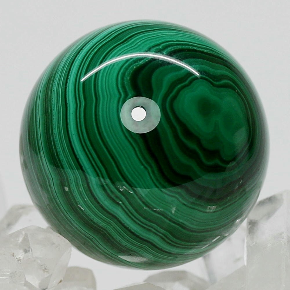 「孔雀石」とも呼ばれるマラカイトは、微結晶が折り重なり緑の濃淡(条痕)が縞模様となる美しい天然石で、研磨した際に現れる円状の模様は丸玉ごとに全く違う表情を持っています。