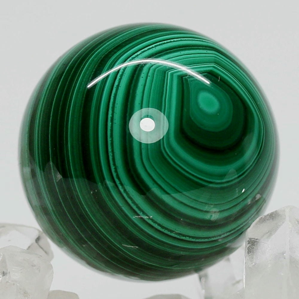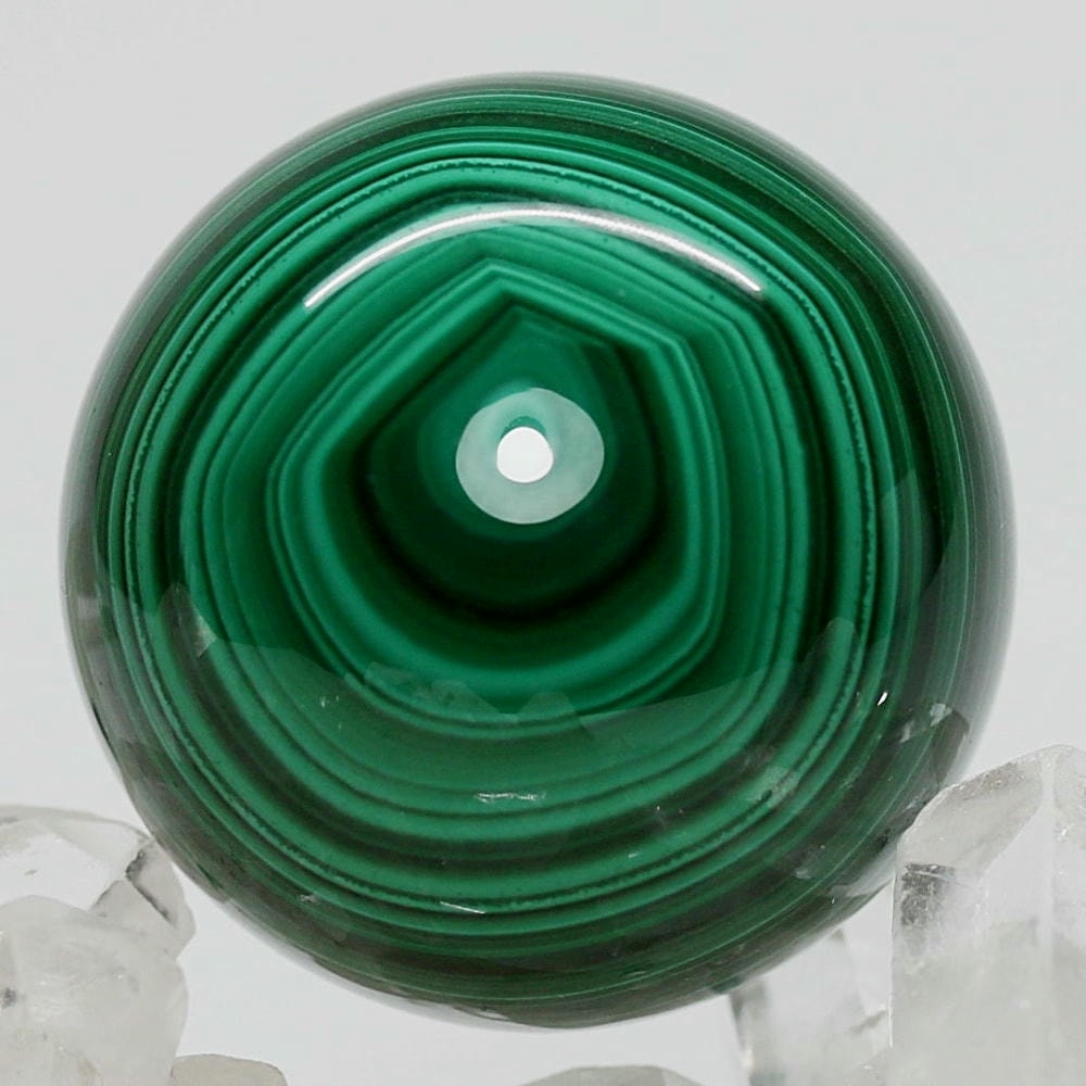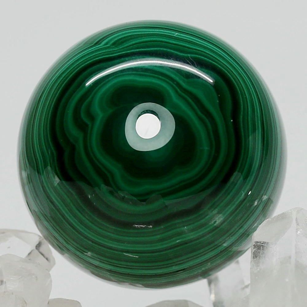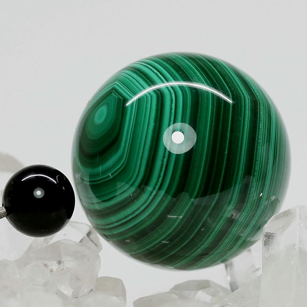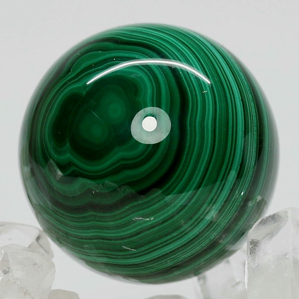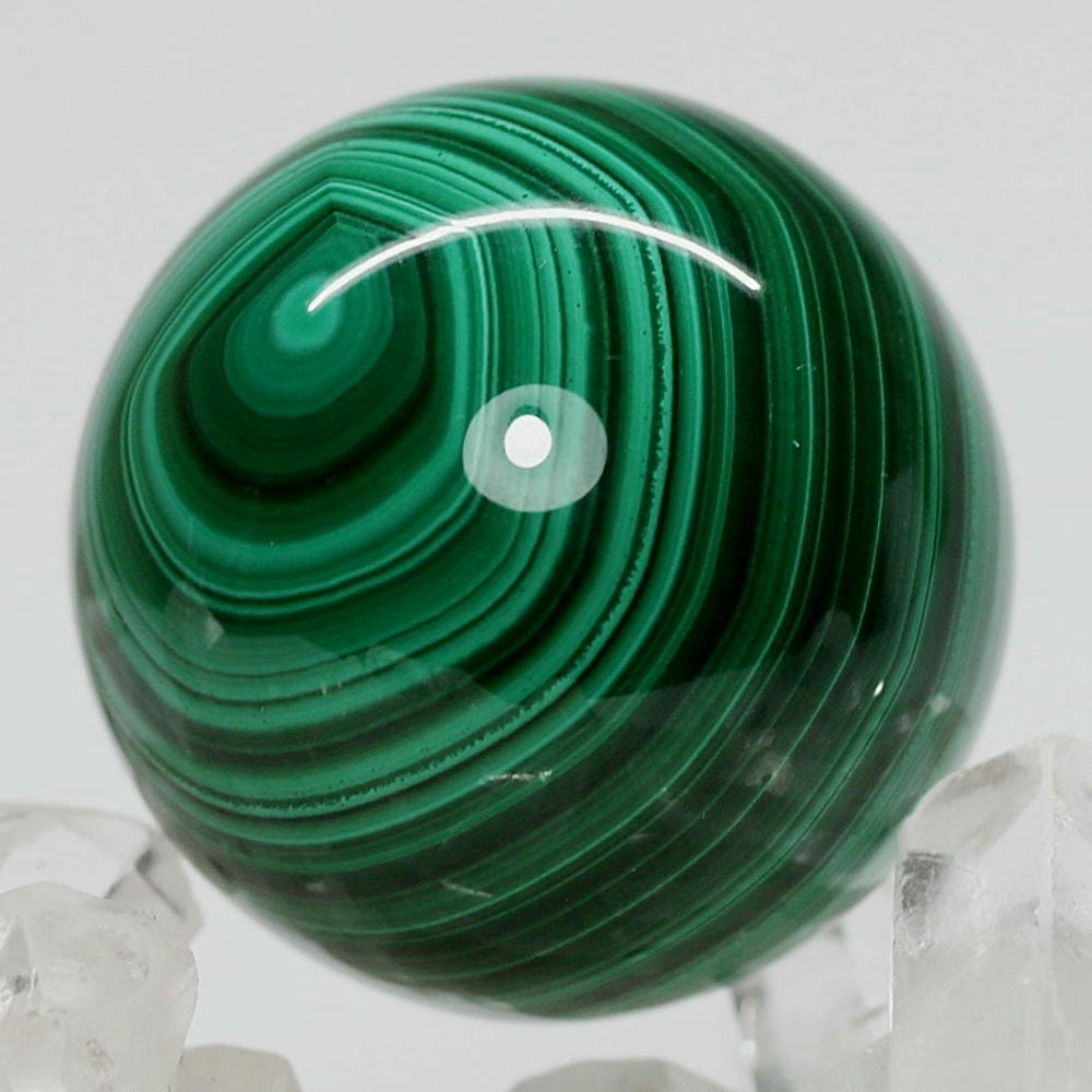 「孔雀石」とも呼ばれるマラカイトは、微結晶が折り重なり緑の濃淡(条痕)が縞模様となる美しい天然石で、研磨した際に現れる円状の模様は丸玉ごとに全く違う表情を持っています。
