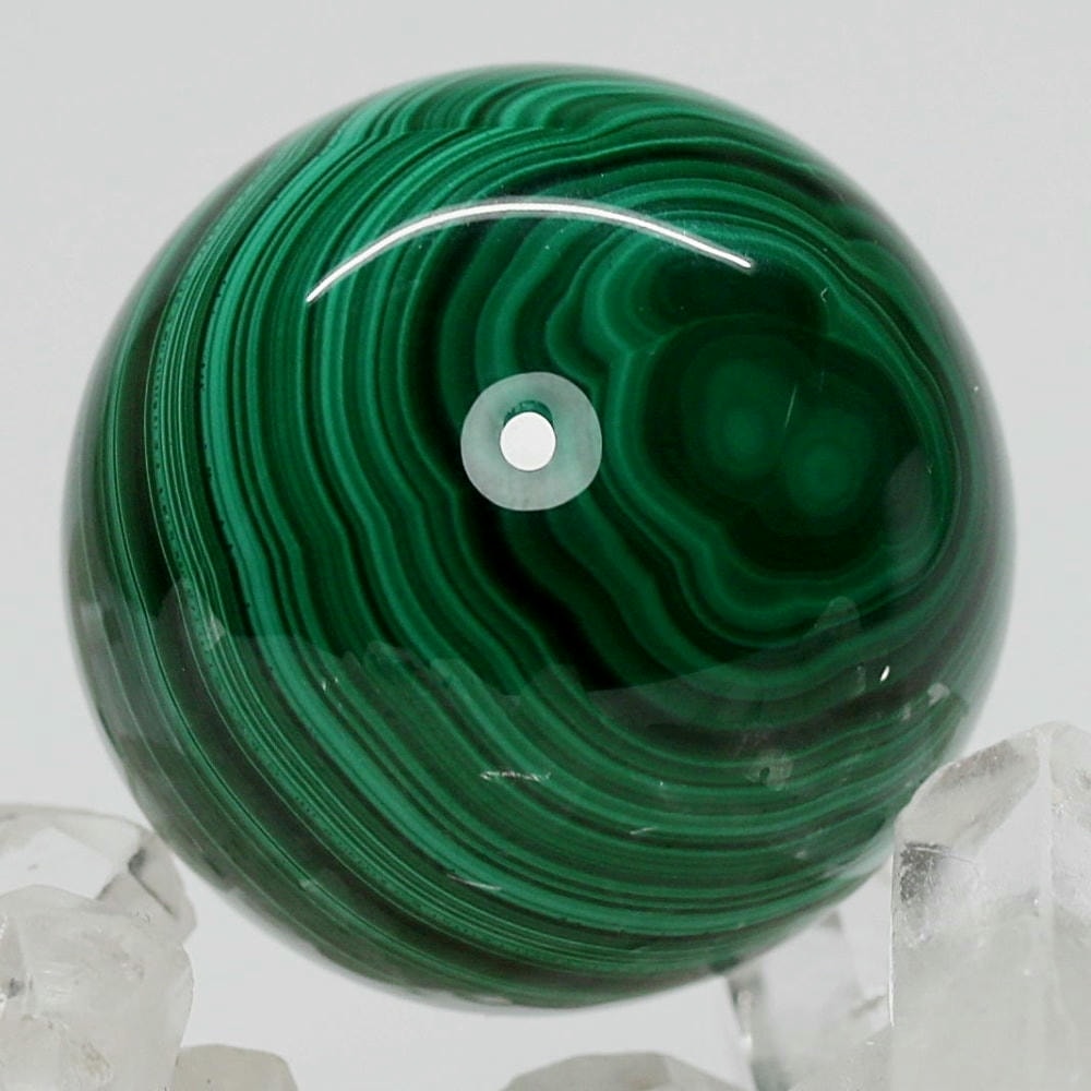 こちらの丸玉はグリーンの発色がよく出ているザイール産天然マラカイト原石から作製されており、縞模様が大変美しく、照り艶、発色も見事な妥協のない逸品です。