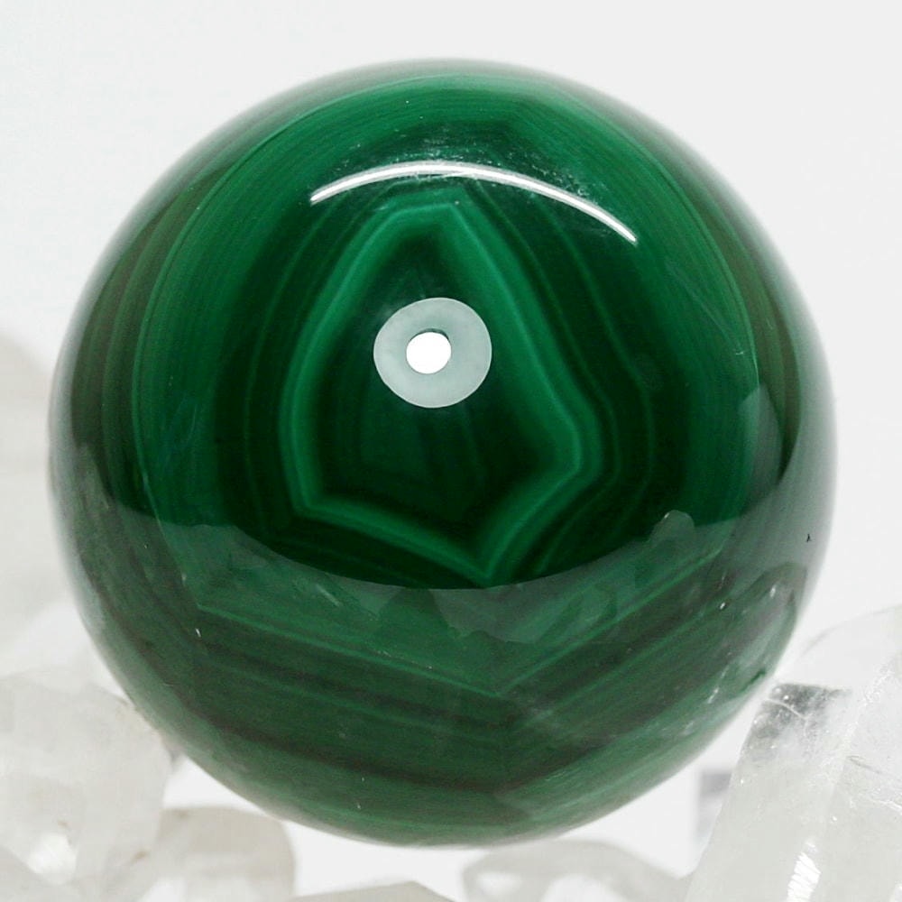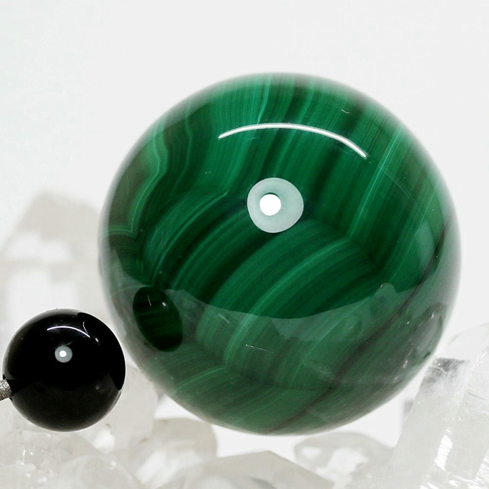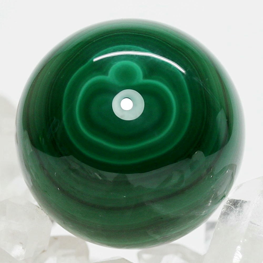「孔雀石」とも呼ばれるマラカイトは、微結晶が折り重なり緑の濃淡(条痕)が縞模様となる美しい天然石で、研磨した際に現れる円状の模様は丸玉ごとに全く違う表情を持っています。
