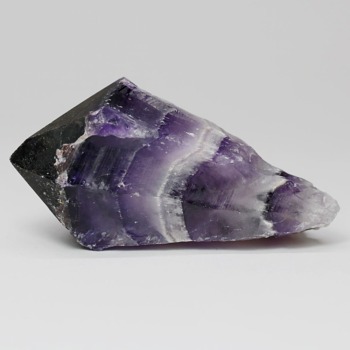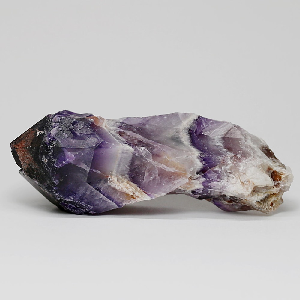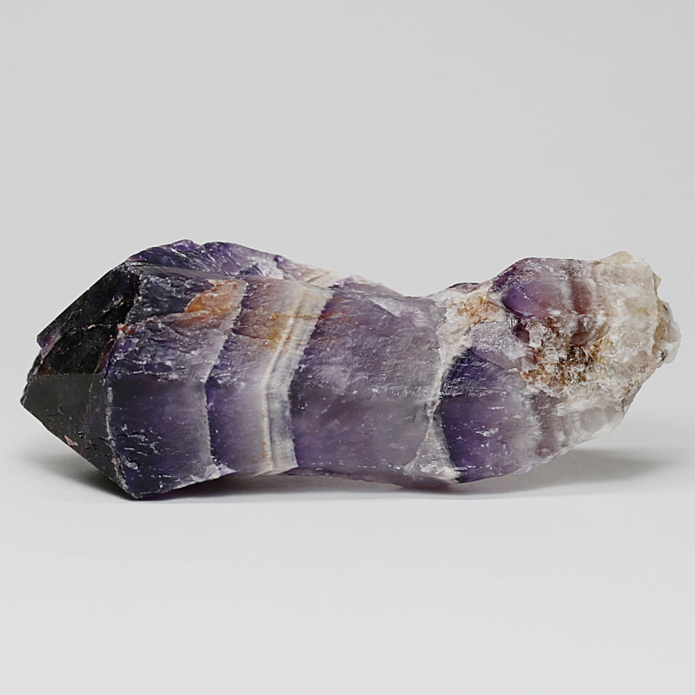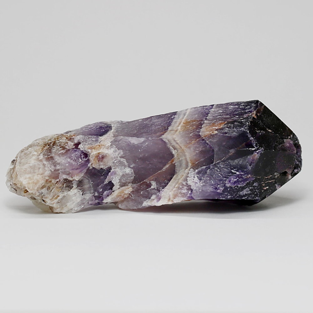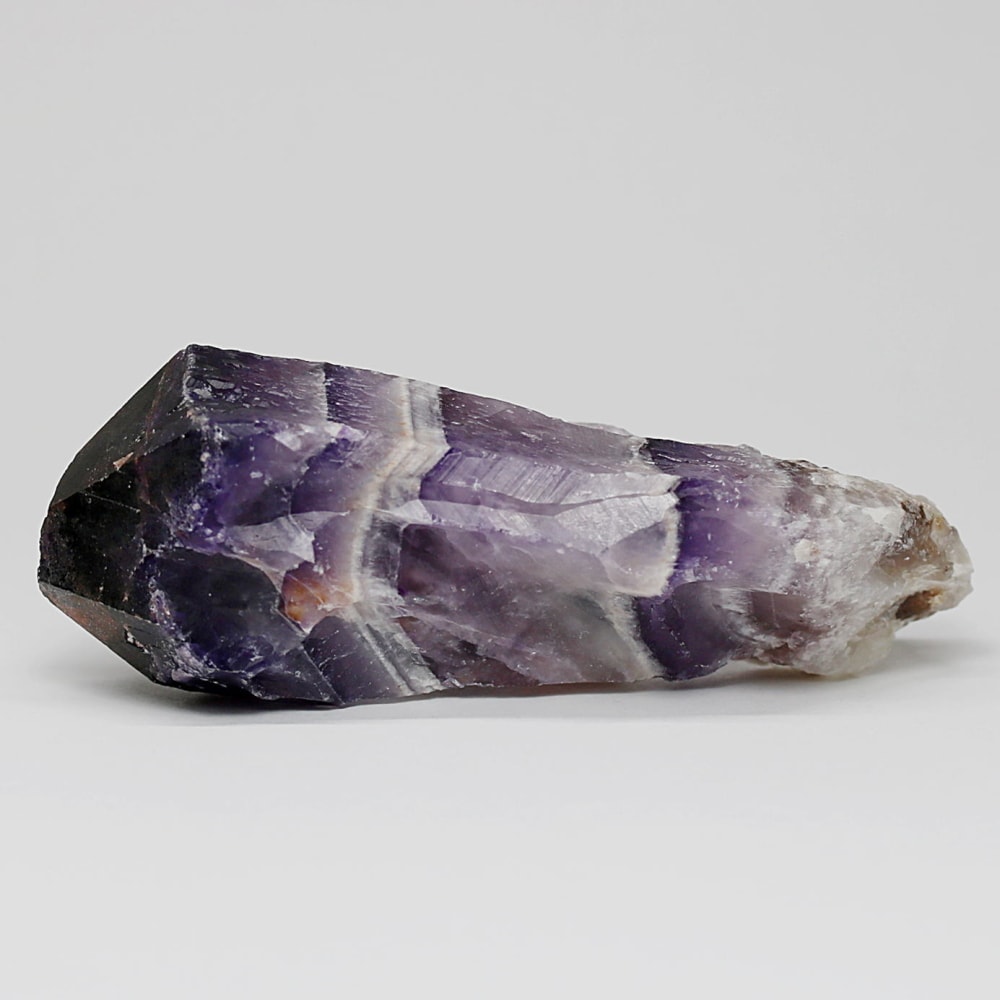 アメジストの紫色と白色の石英(クォーツ)が織りなす層状の模様が、フランス語で「山型」を意味する「シェブロン」の名にふさわしい、繊細で美しいV字型の縞模様(バンデッドパターン)を形成した、シェブロンアメジストをご用意しました。