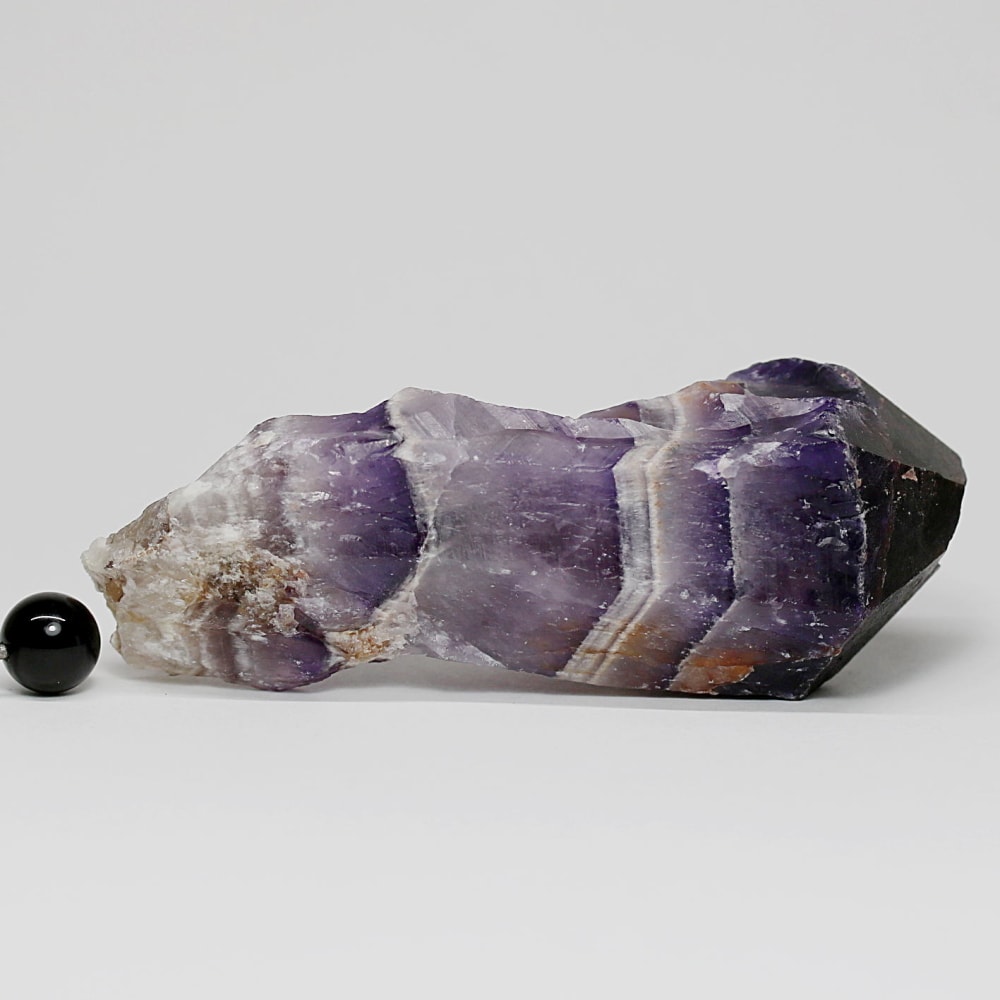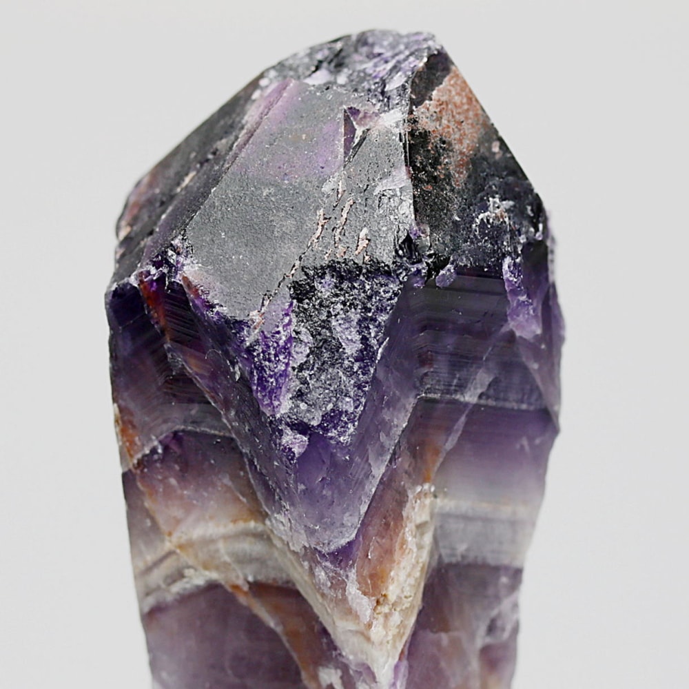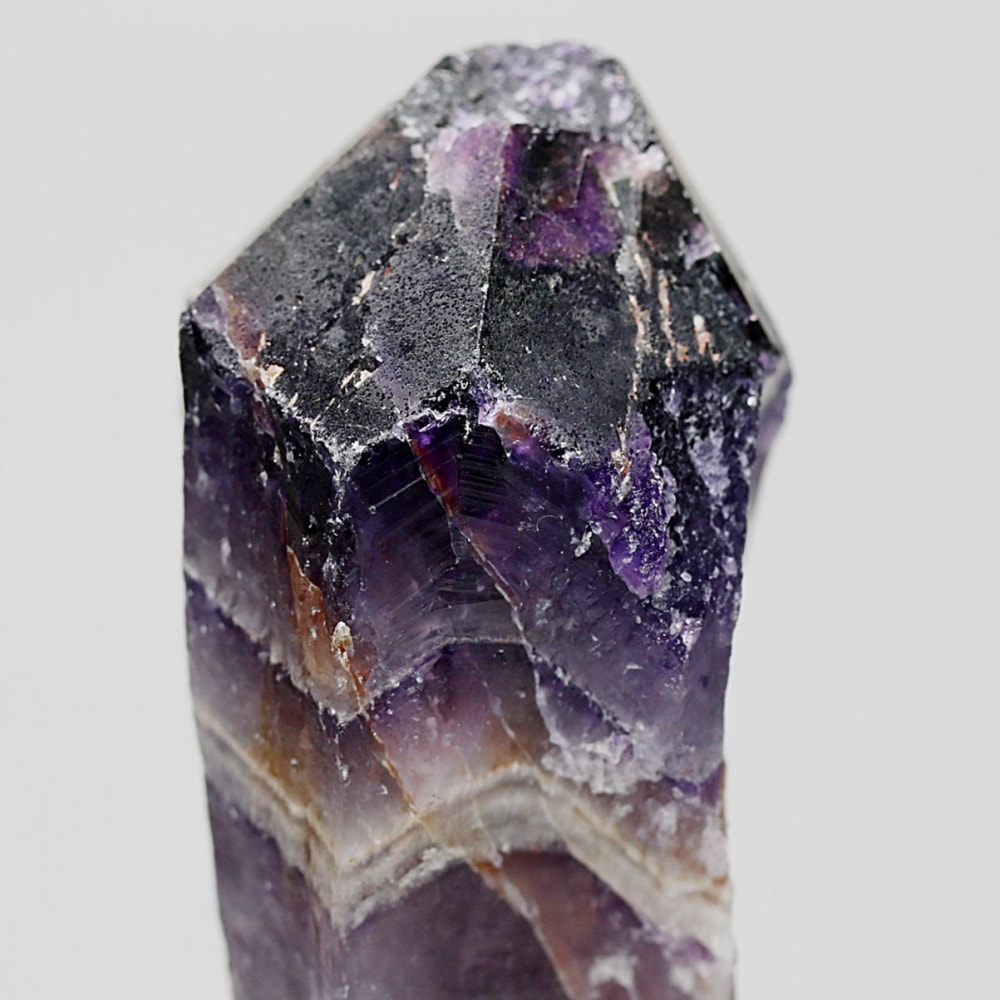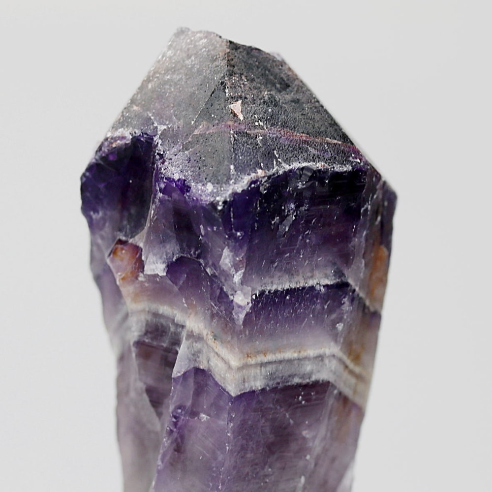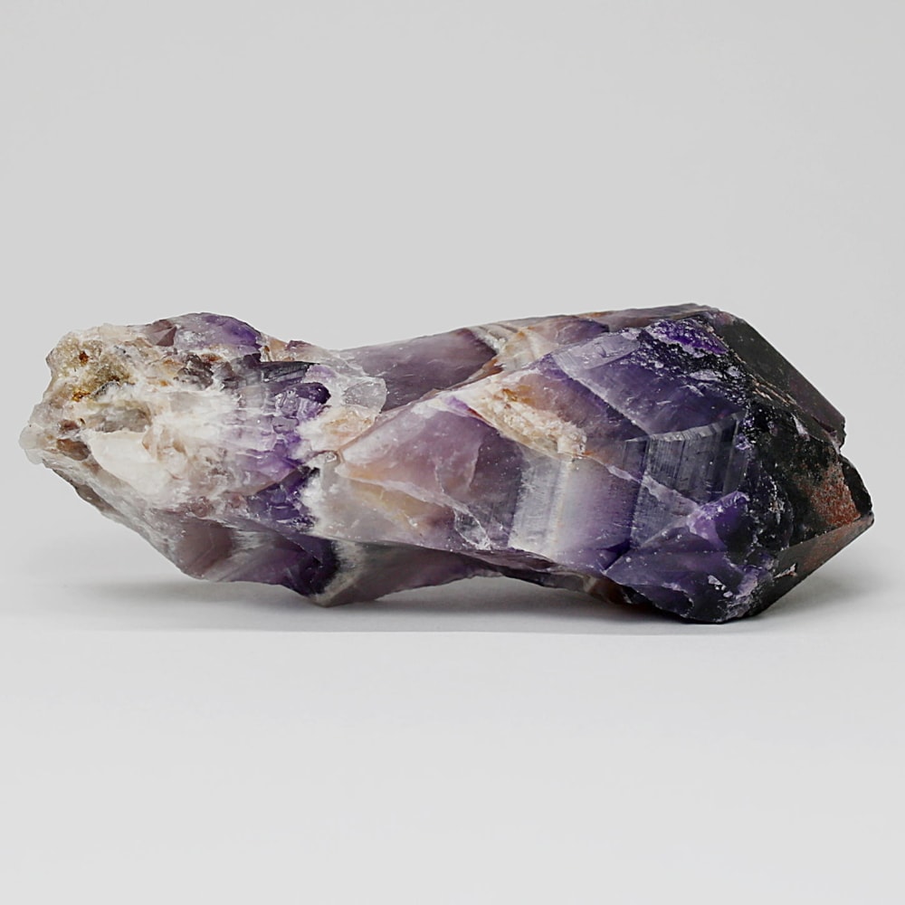 アメジストの紫色と白色の石英(クォーツ)が織りなす層状の模様が、フランス語で「山型」を意味する「シェブロン」の名にふさわしい、繊細で美しいV字型の縞模様(バンデッドパターン)を形成した、シェブロンアメジストをご用意しました。