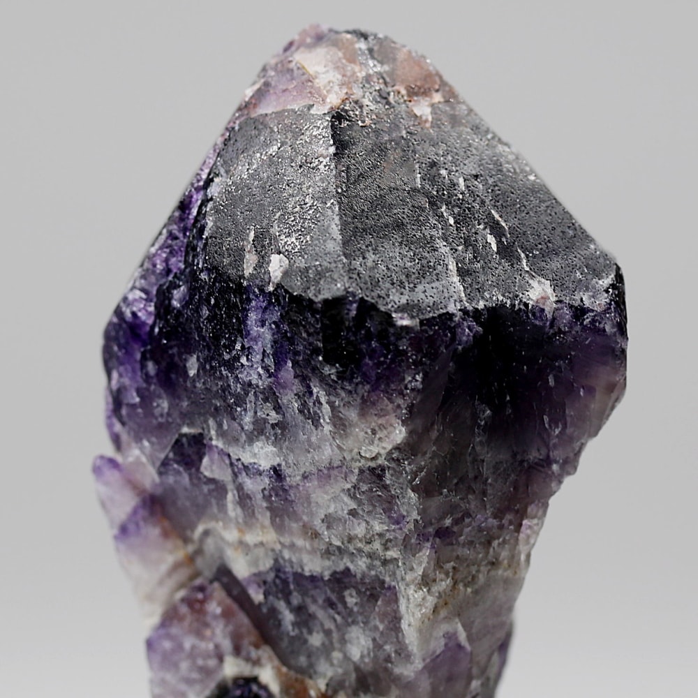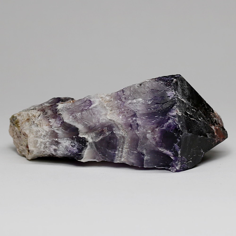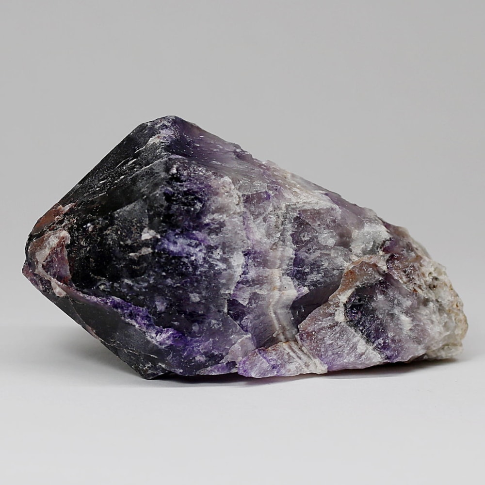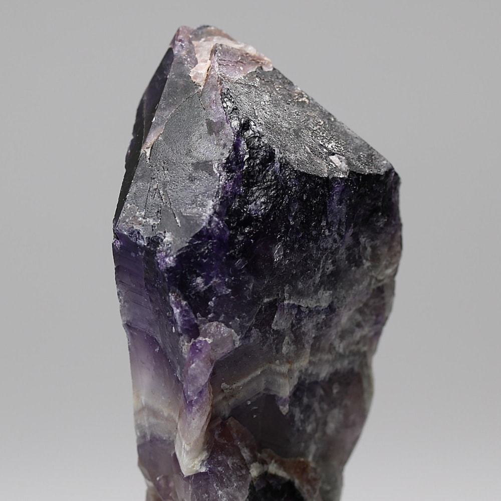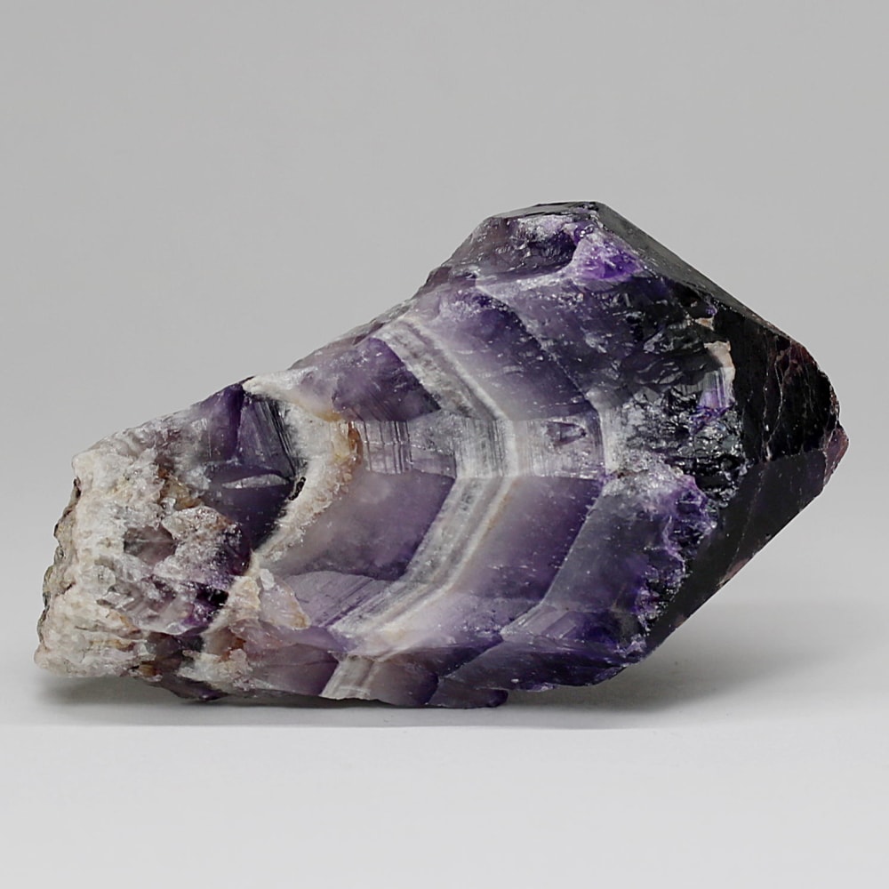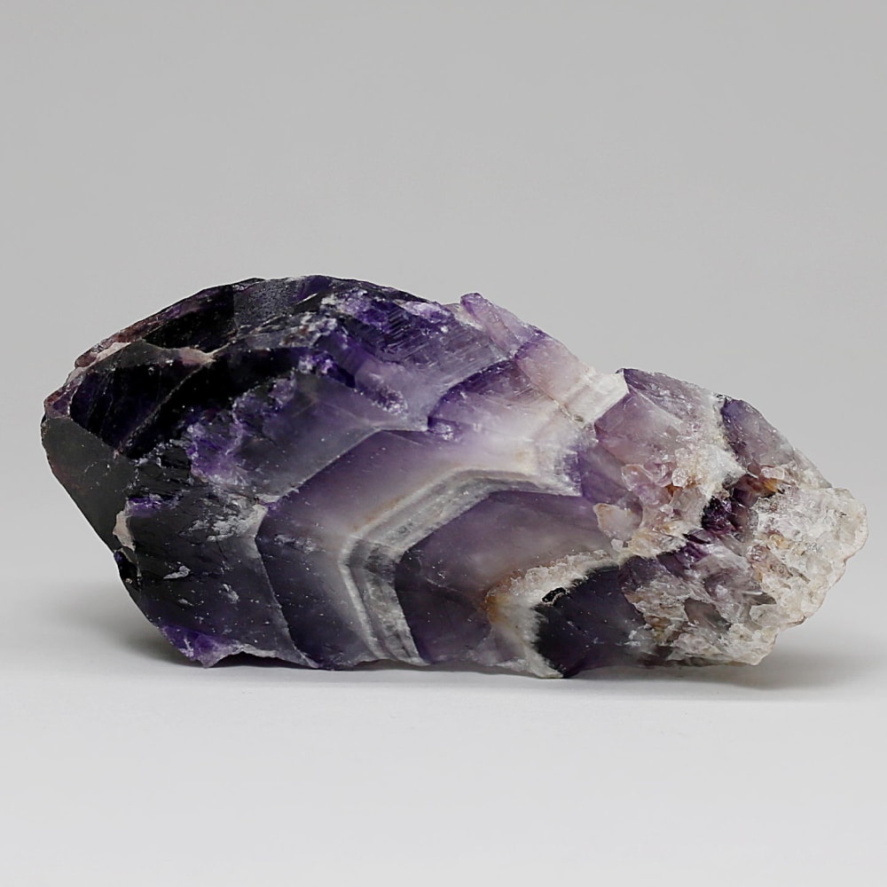 アメジストの紫色と白色の石英(クォーツ)が織りなす層状の模様が、フランス語で「山型」を意味する「シェブロン」の名にふさわしい、繊細で美しいV字型の縞模様(バンデッドパターン)を形成した、シェブロンアメジストをご用意しました。