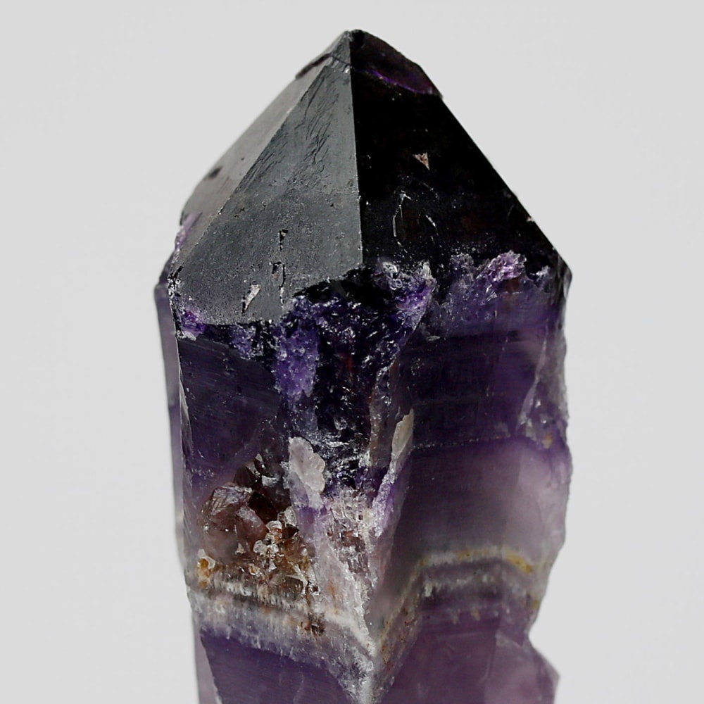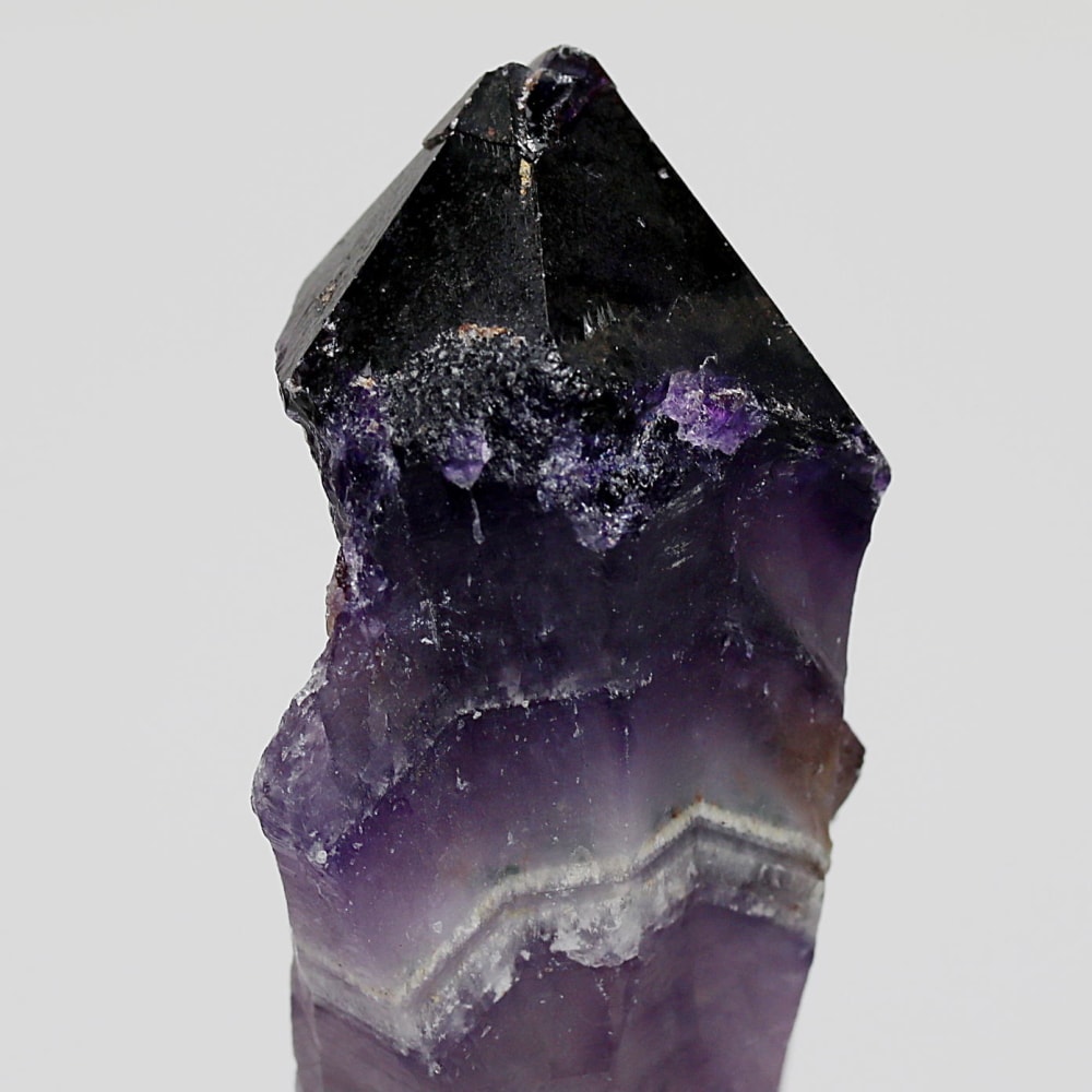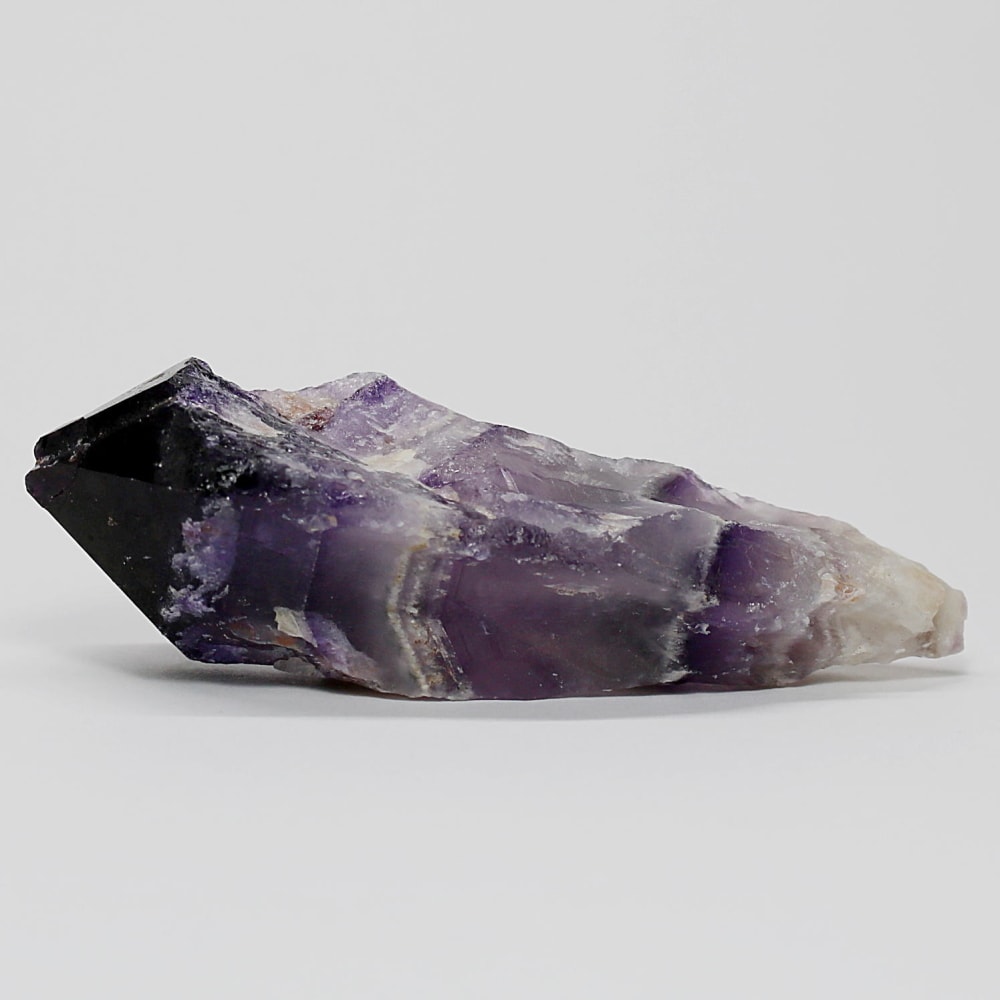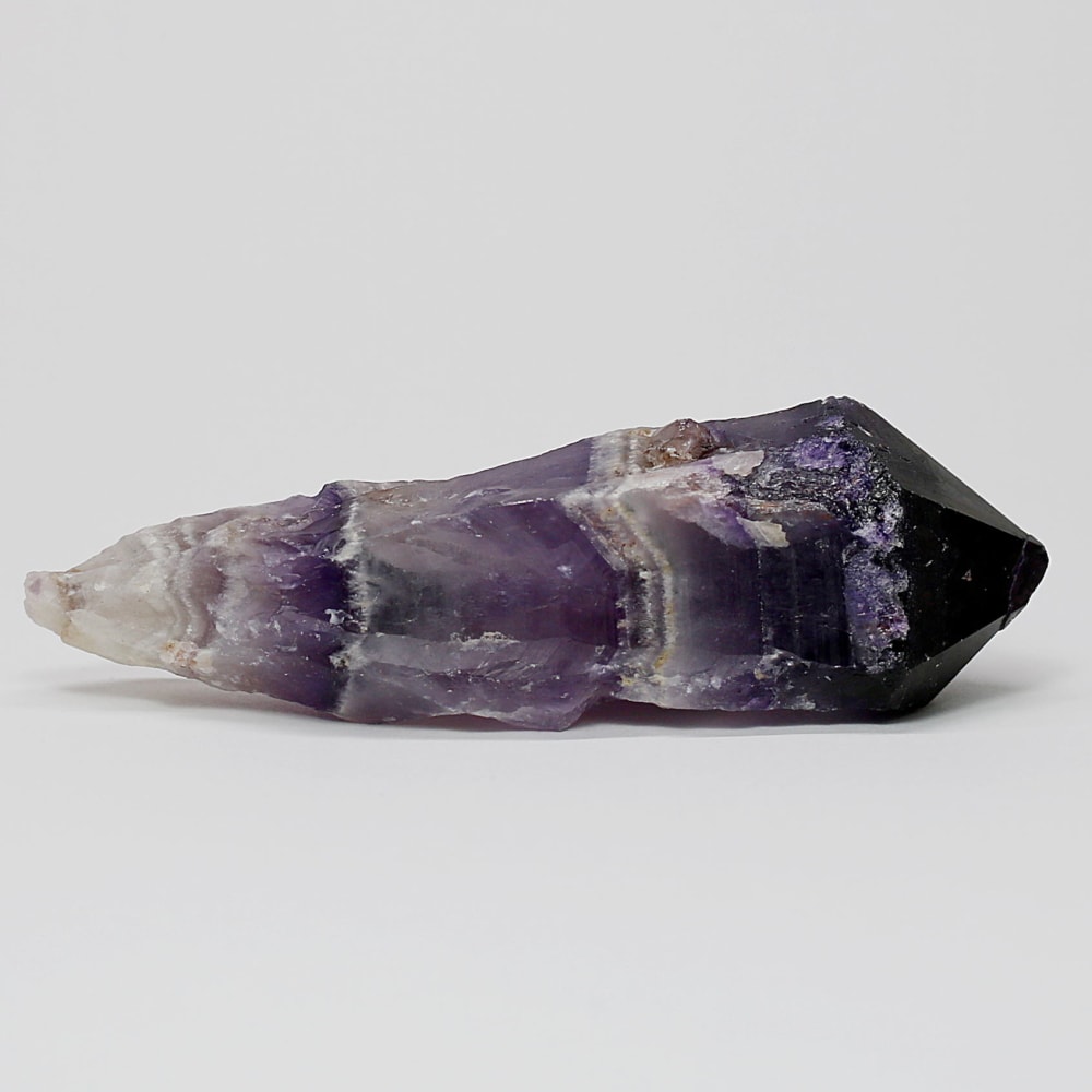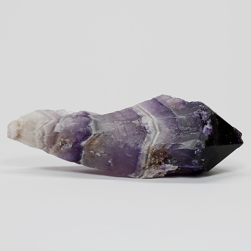 アメジストの紫色と白色の石英(クォーツ)が織りなす層状の模様が、フランス語で「山型」を意味する「シェブロン」の名にふさわしい、繊細で美しいV字型の縞模様(バンデッドパターン)を形成した、シェブロンアメジストをご用意しました。