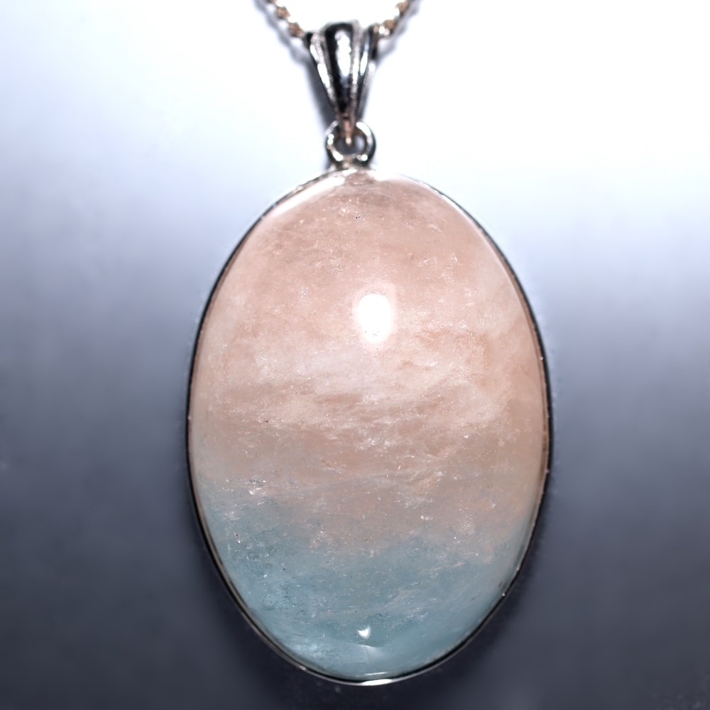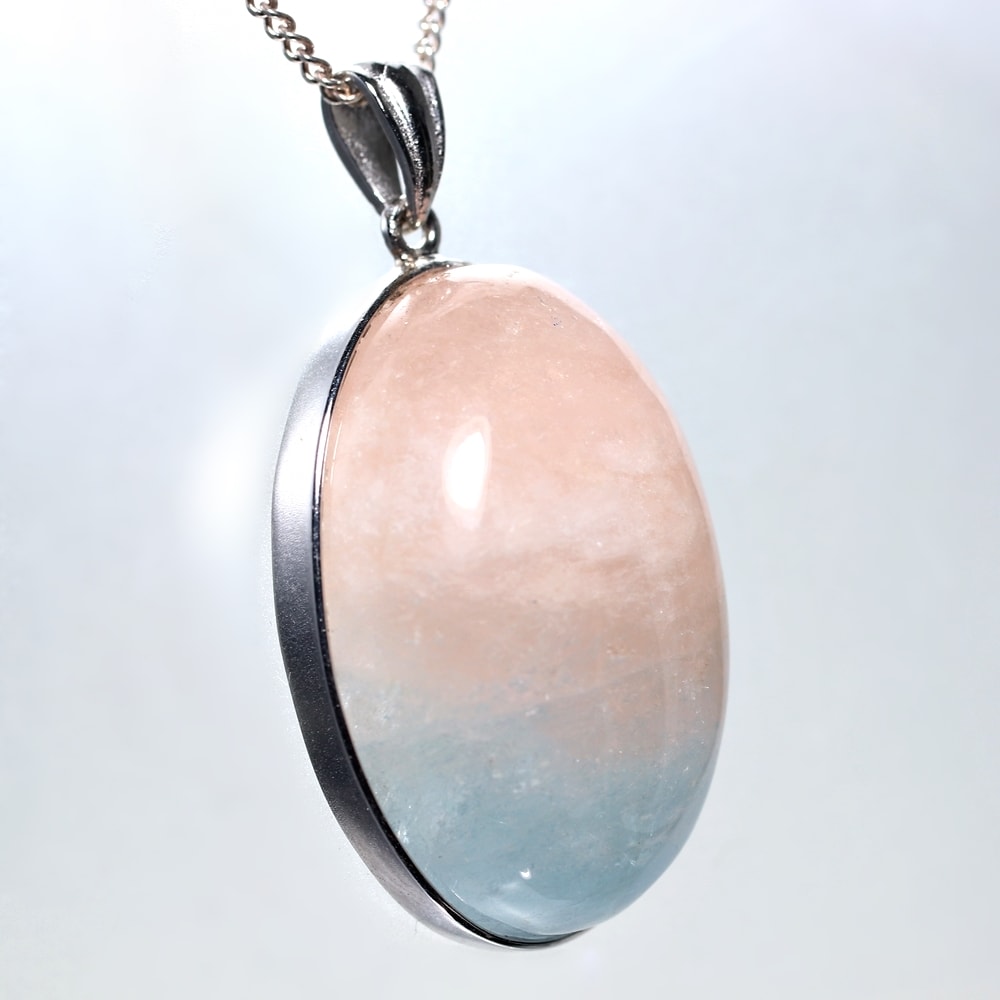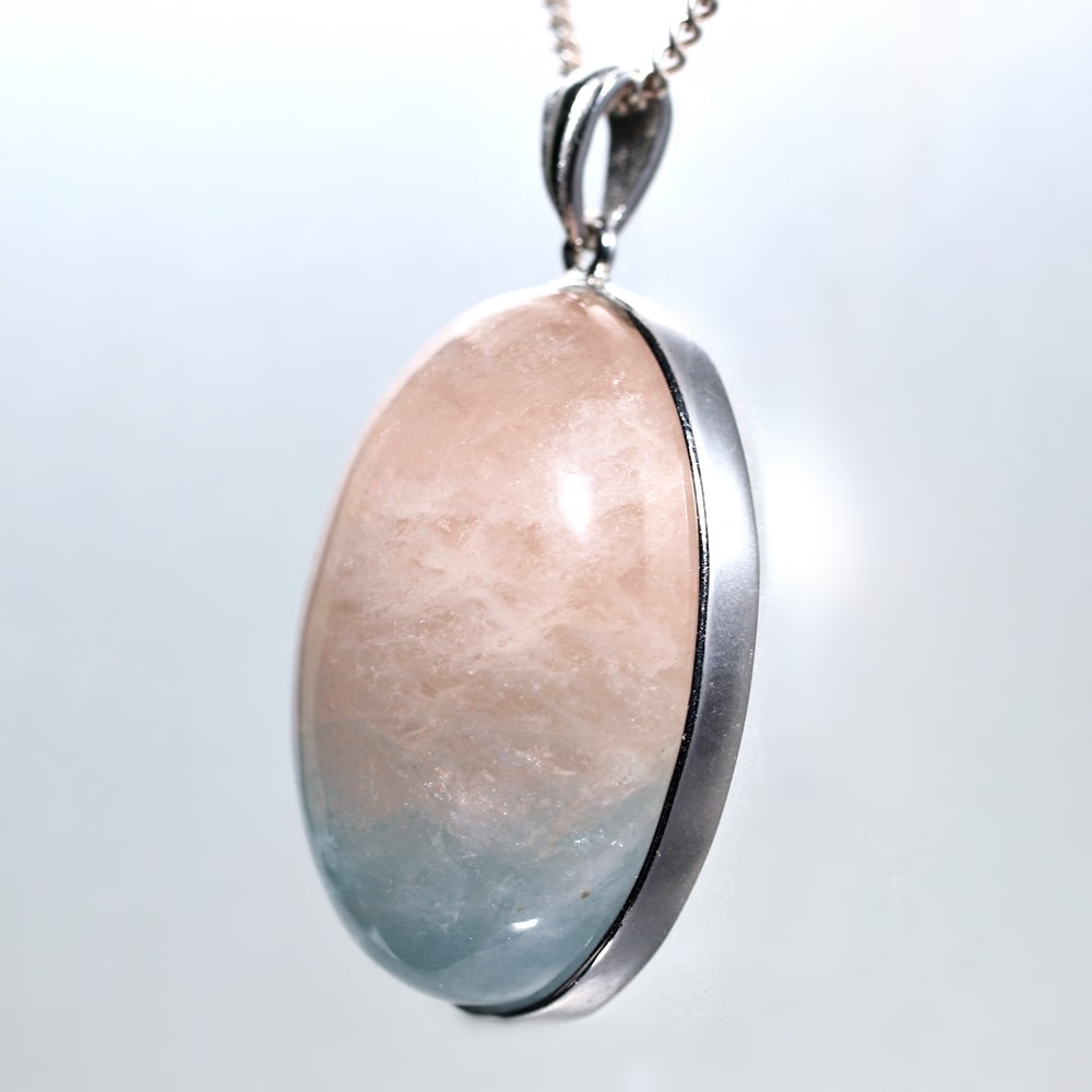 淡く優しいピンクのモルガナイトと、ほのかなブルーのアクアマリンがひとつの石に共存する、とても上品なルースを使用してペンダント加工いたしました。