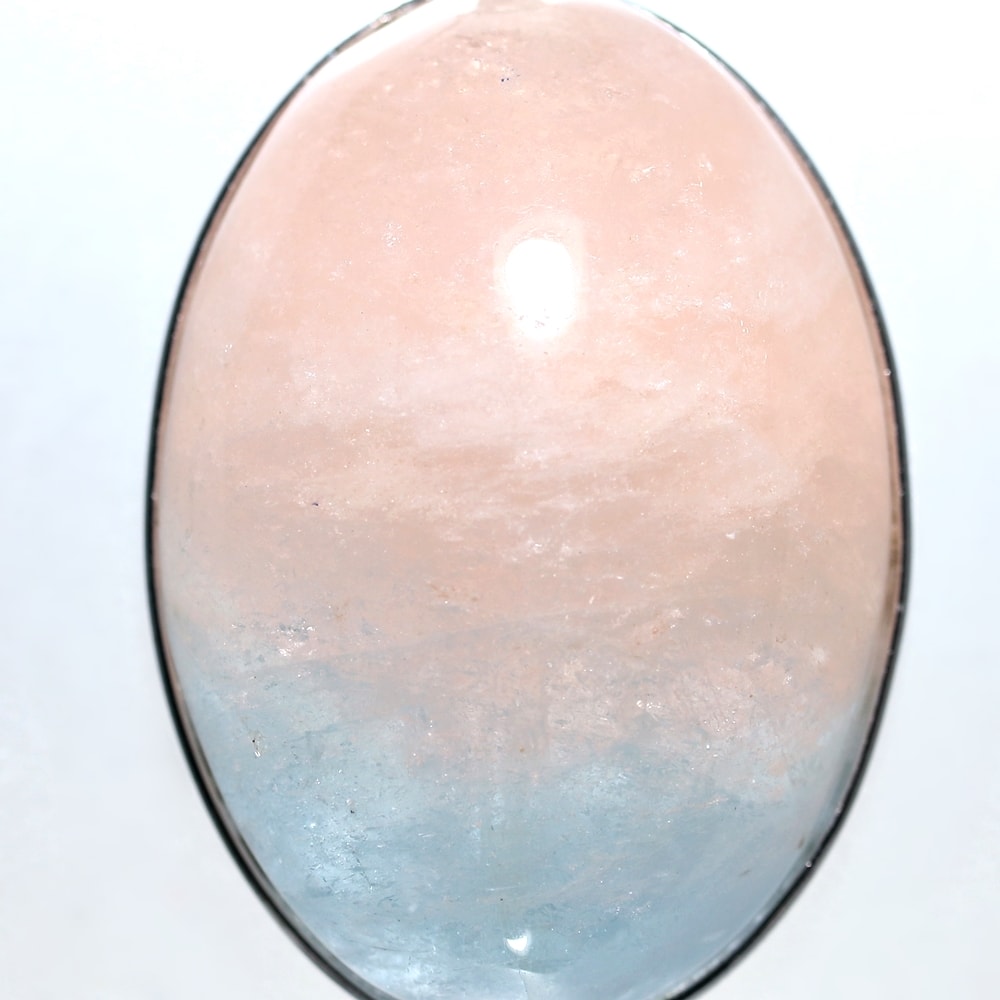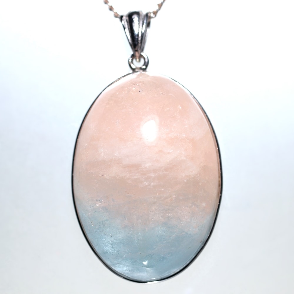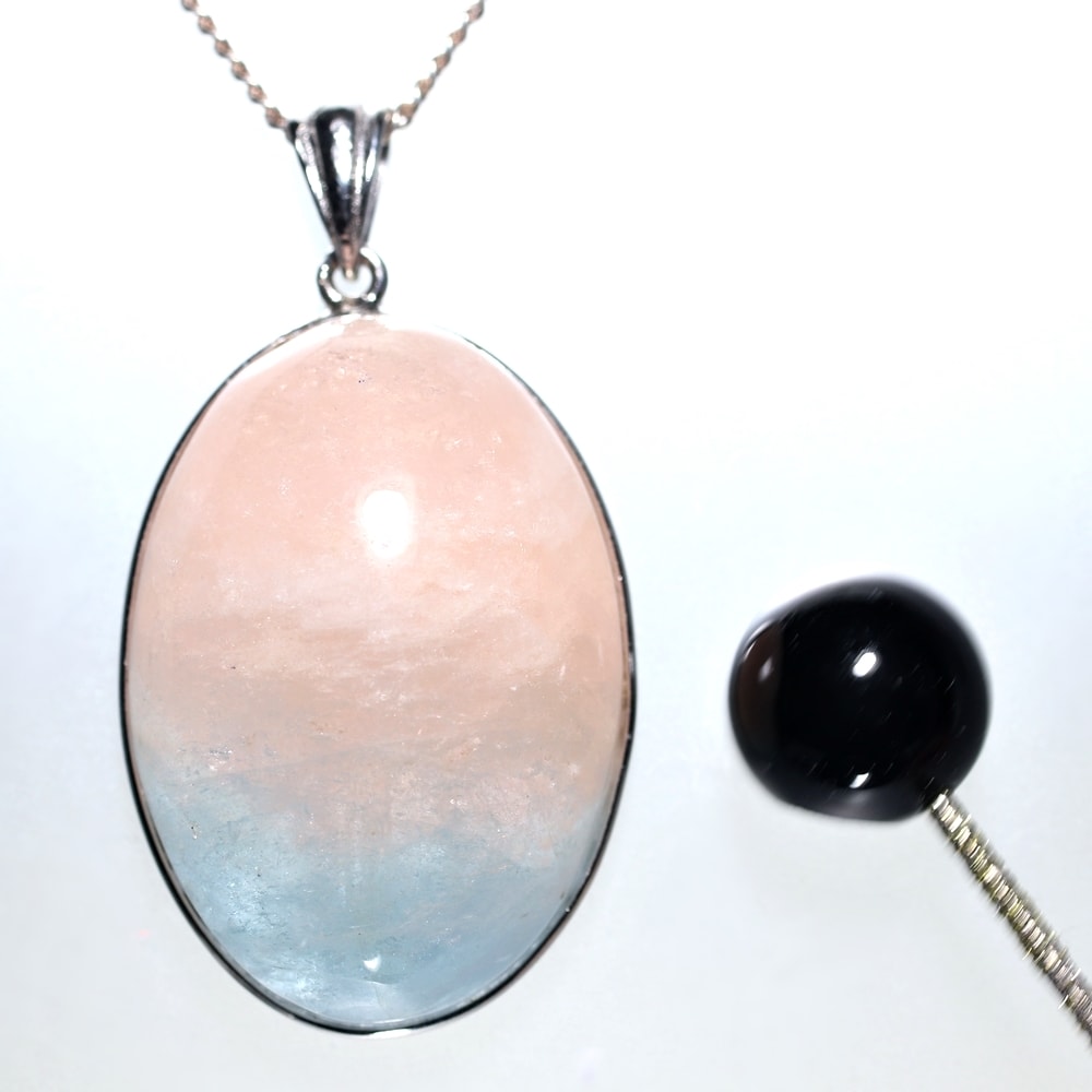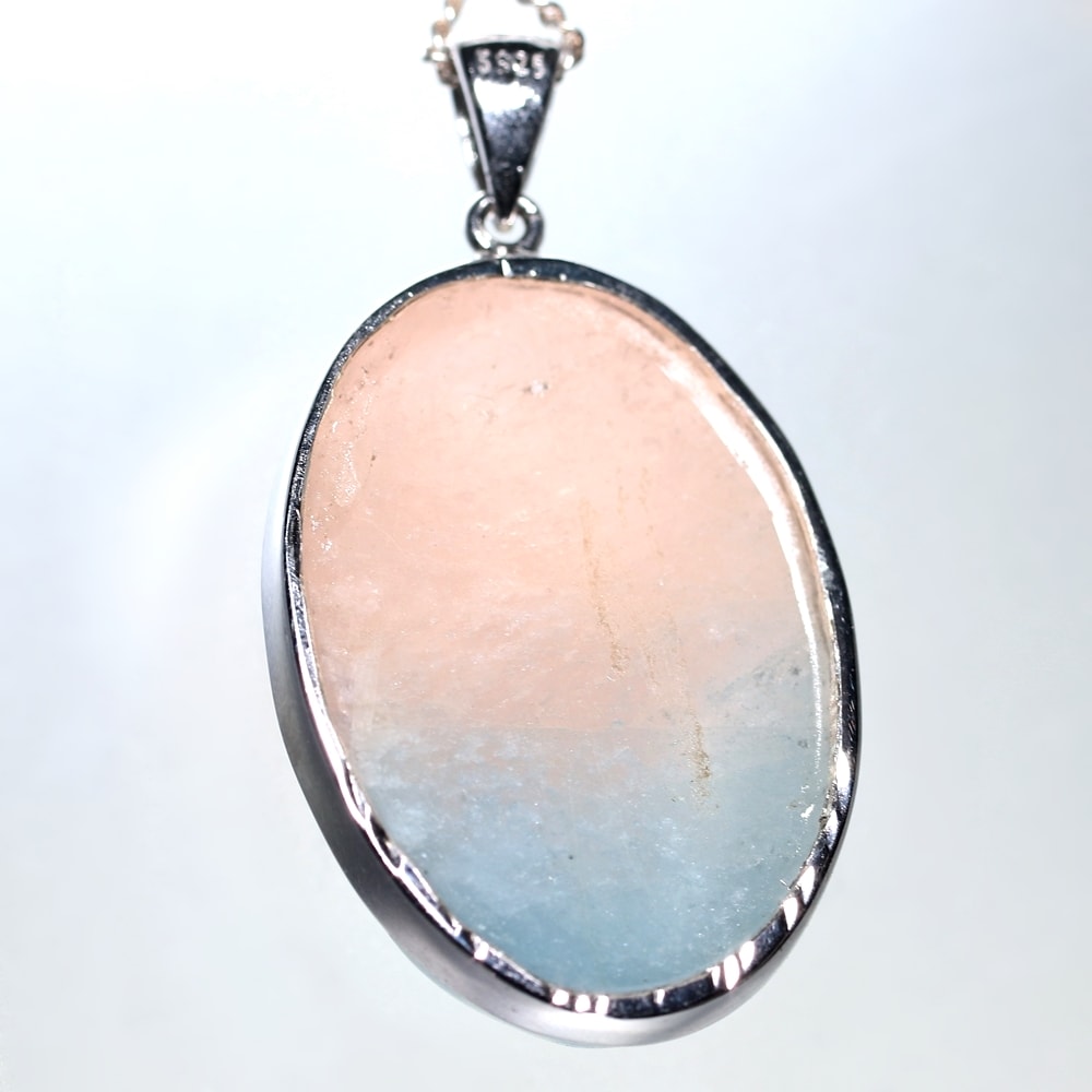 淡く優しいピンクのモルガナイトと、ほのかなブルーのアクアマリンがひとつの石に共存する、とても上品なルースを使用してペンダント加工いたしました。