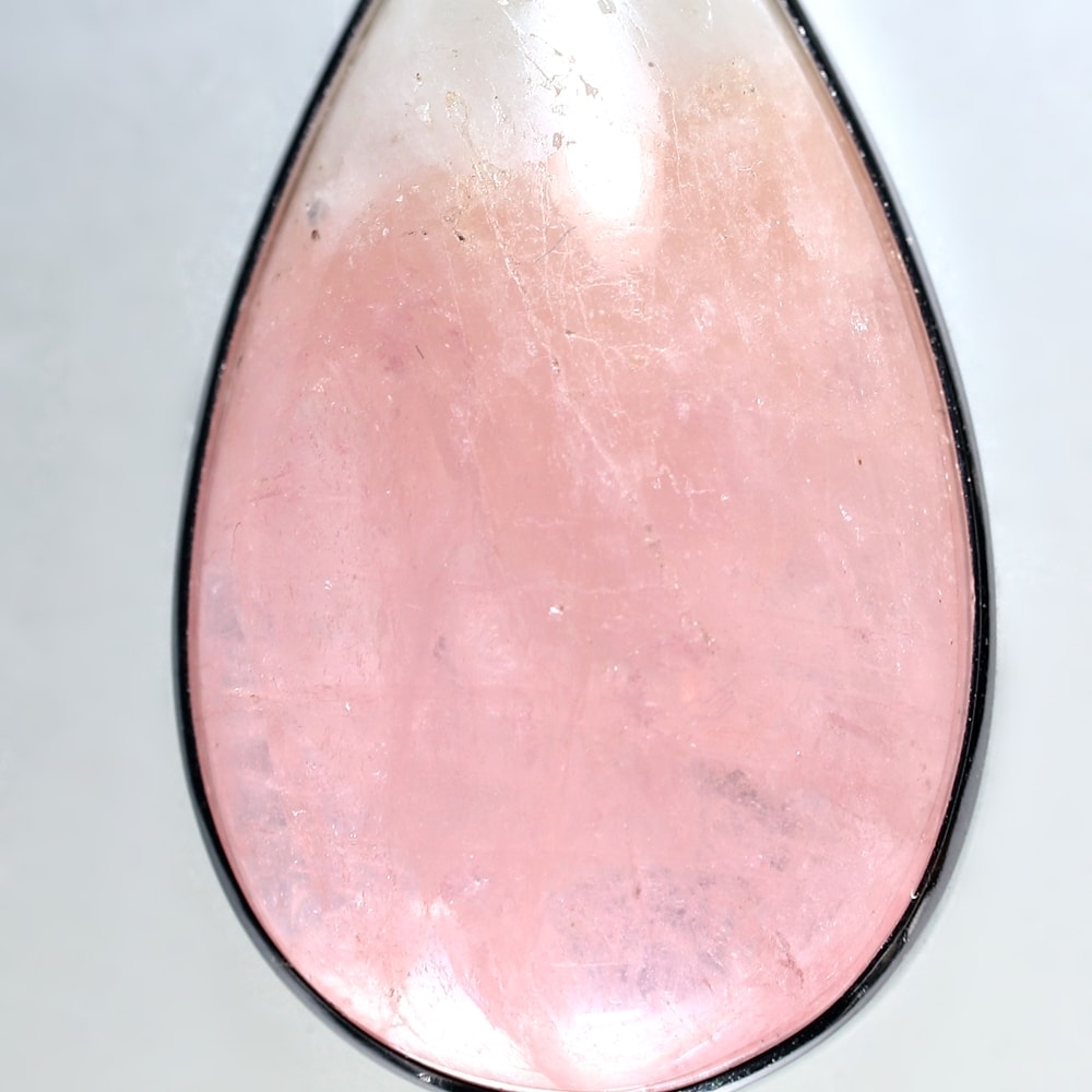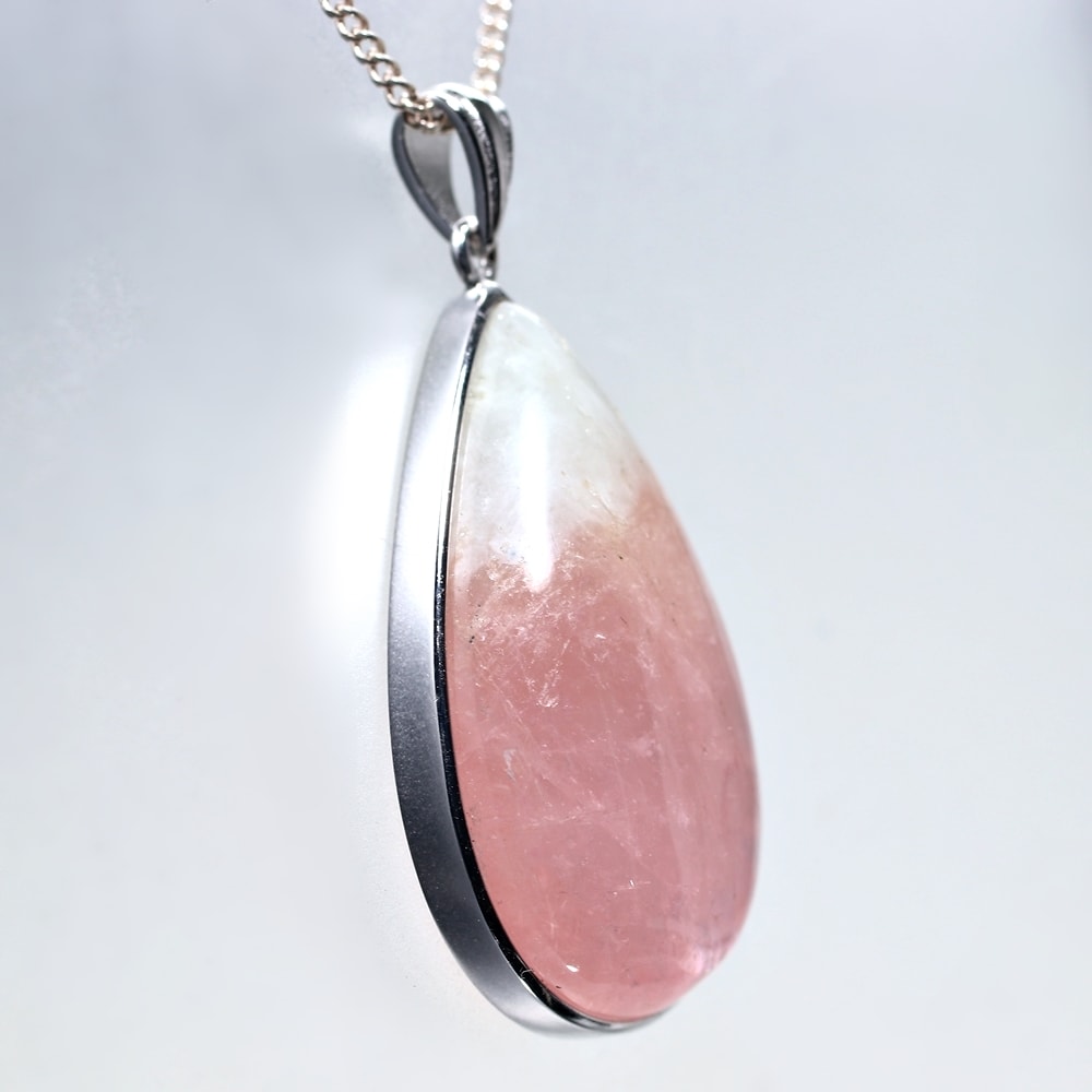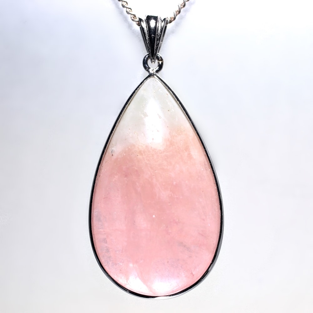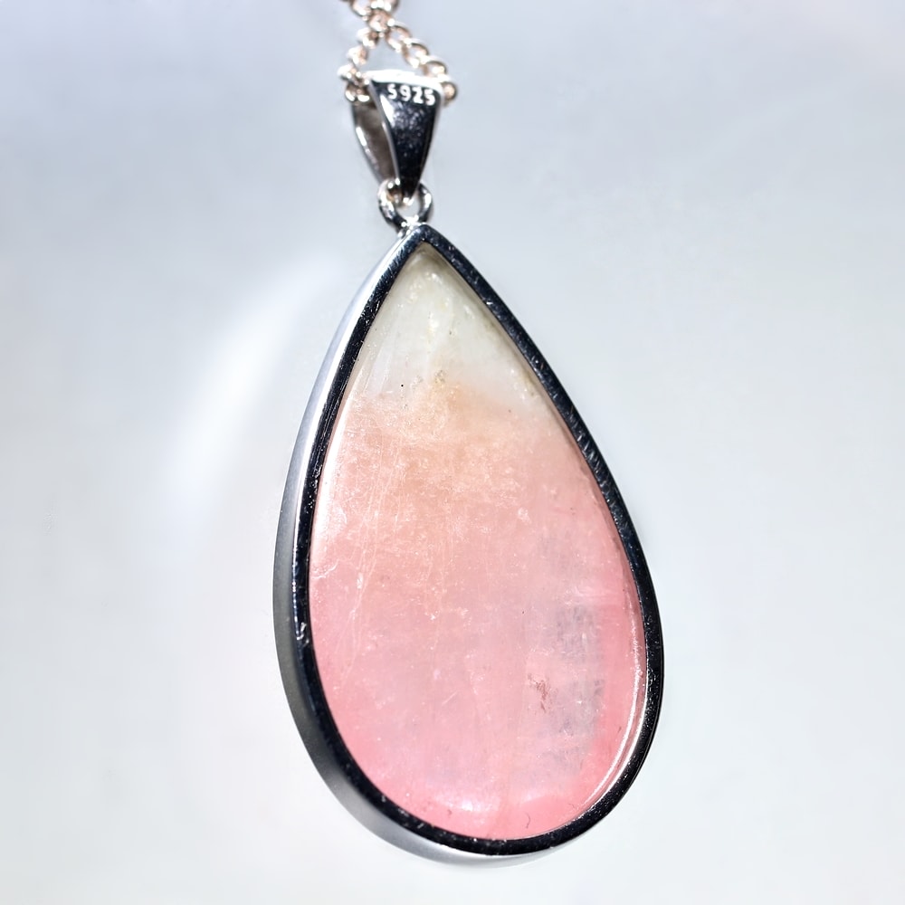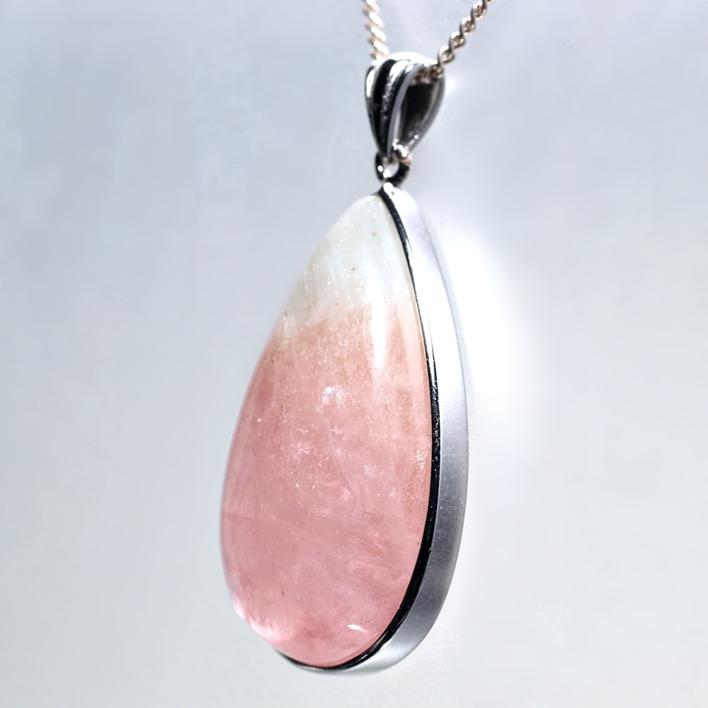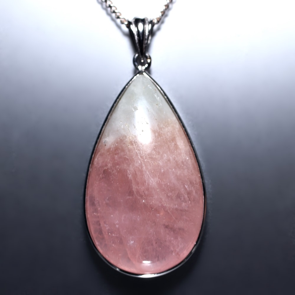 淡く優しいピンクのモルガナイトと、ほのかなブルーのアクアマリンがひとつの石に共存する、とても上品なルースを使用してペンダント加工いたしました。