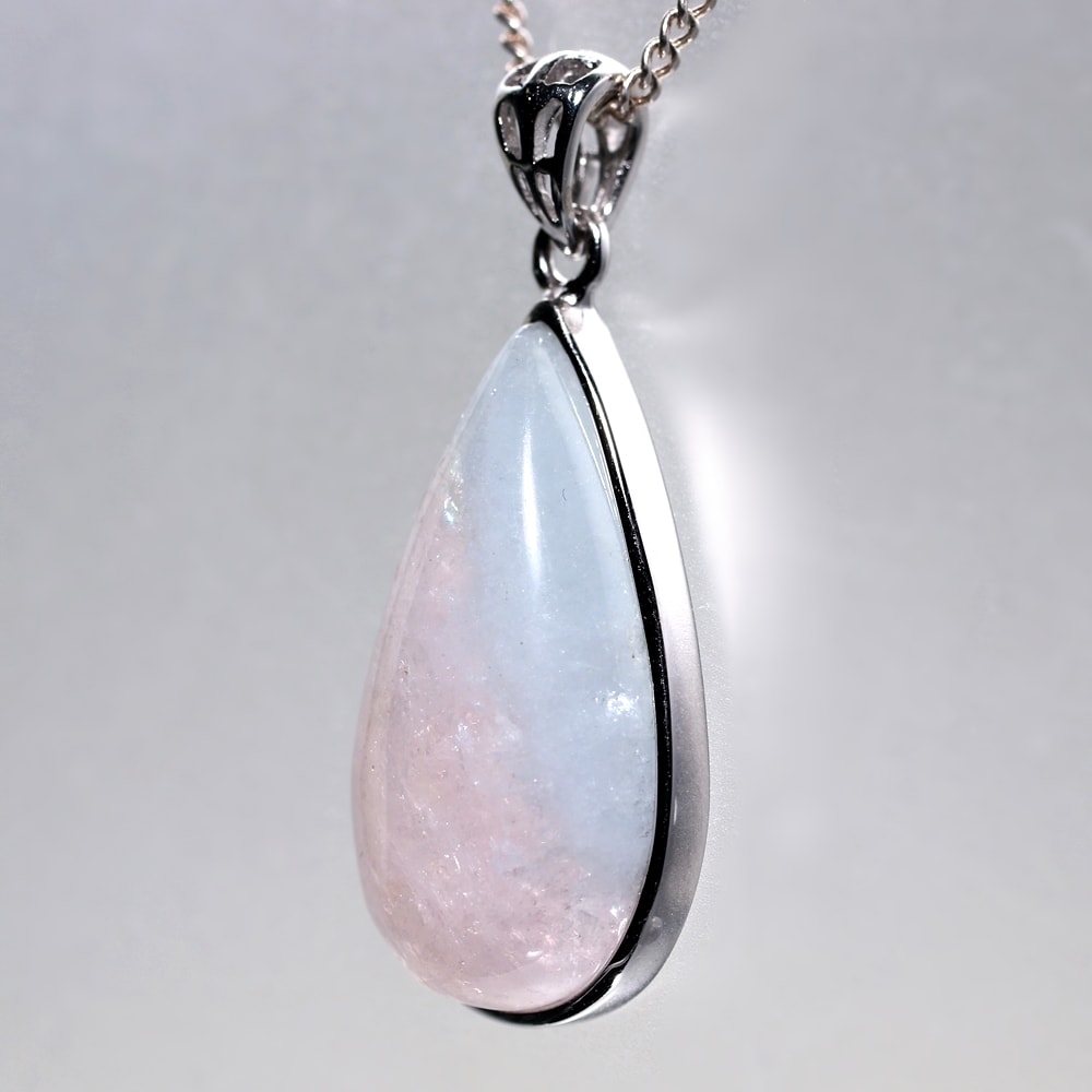 淡く優しいピンクのモルガナイトと、ほのかなブルーのアクアマリンがひとつの石に共存する、とても上品なルースを使用してペンダント加工いたしました。