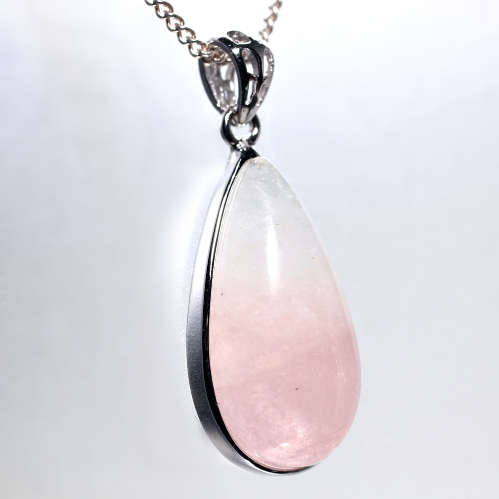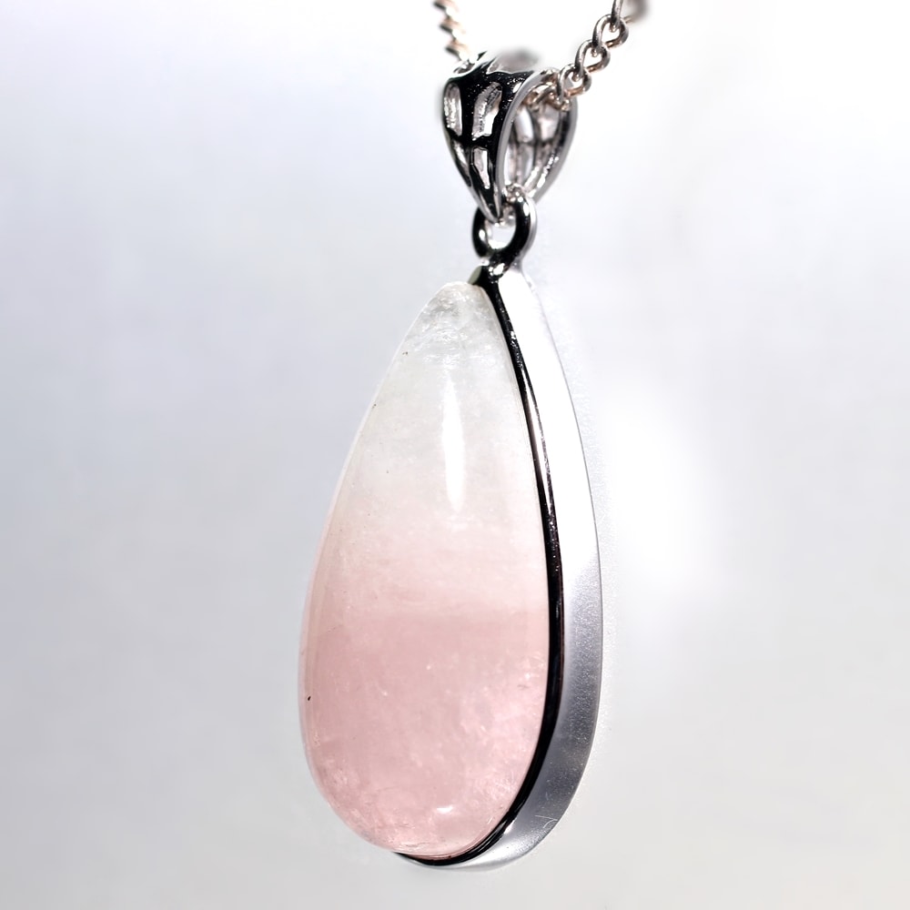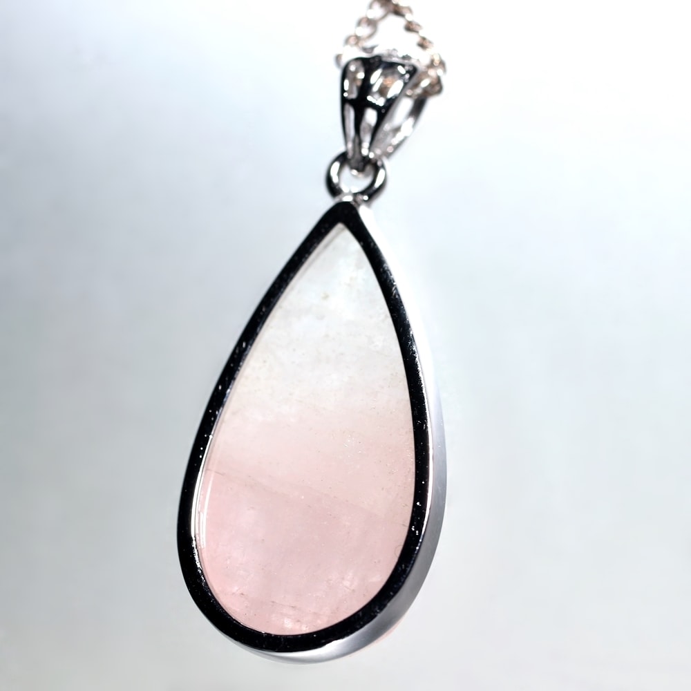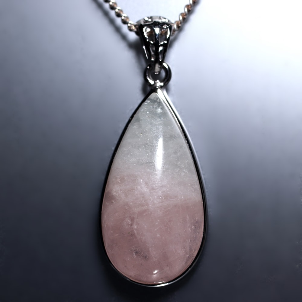 淡く優しいピンクのモルガナイトと、ほのかなブルーのアクアマリンがひとつの石に共存する、とても上品なルースを使用してペンダント加工いたしました。
